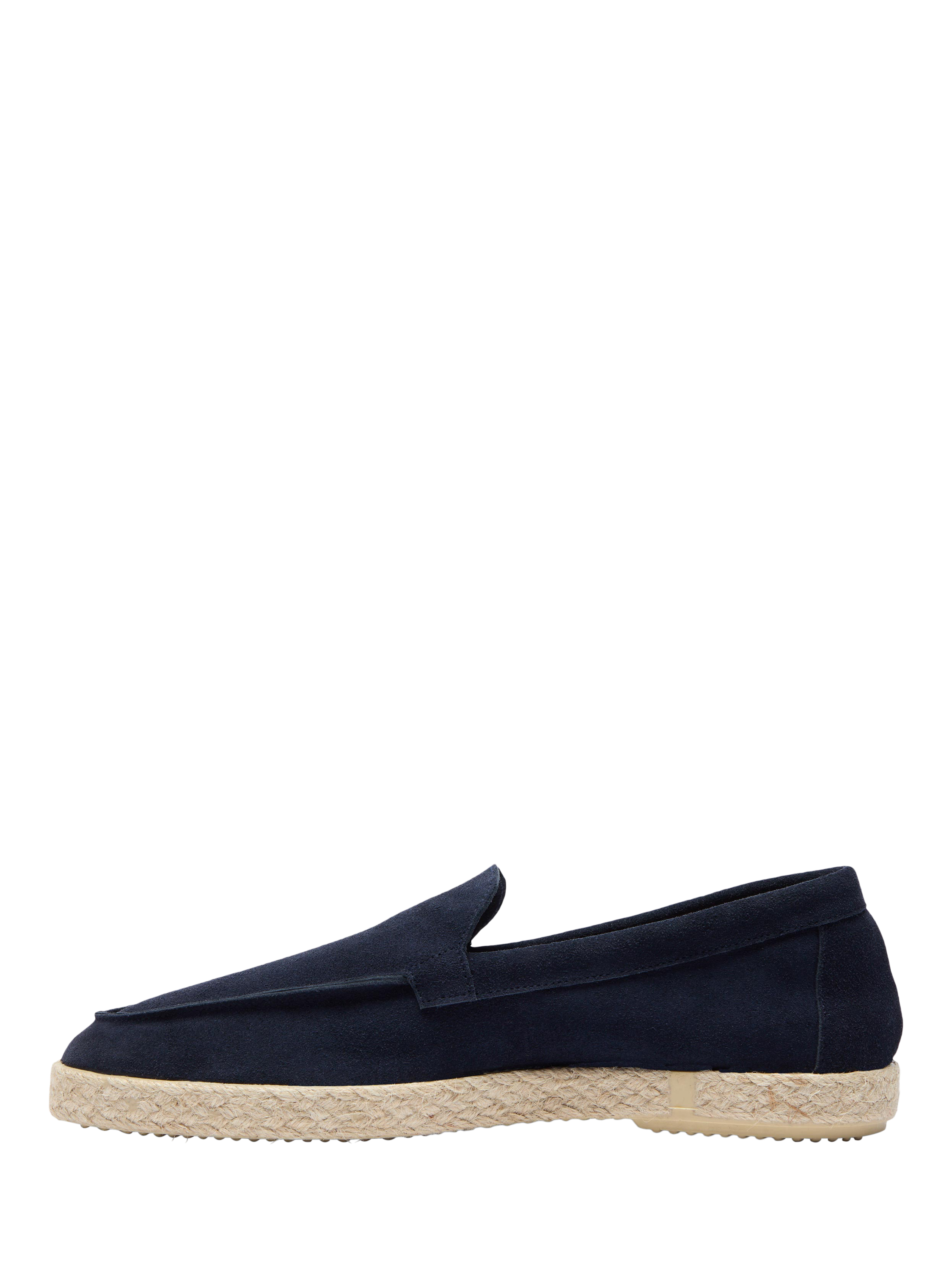 The loafer is vulcanised with a neutral beige rubber sole, trimmed with jute edging, rather than the traditional full jute sole. The minimalist upper is made from a single strip of soft, fine napped, unlined calf suede with a plain apron, folded topline and double layer on the unstructured heel counter. Completed with a full cushioned leather insock.