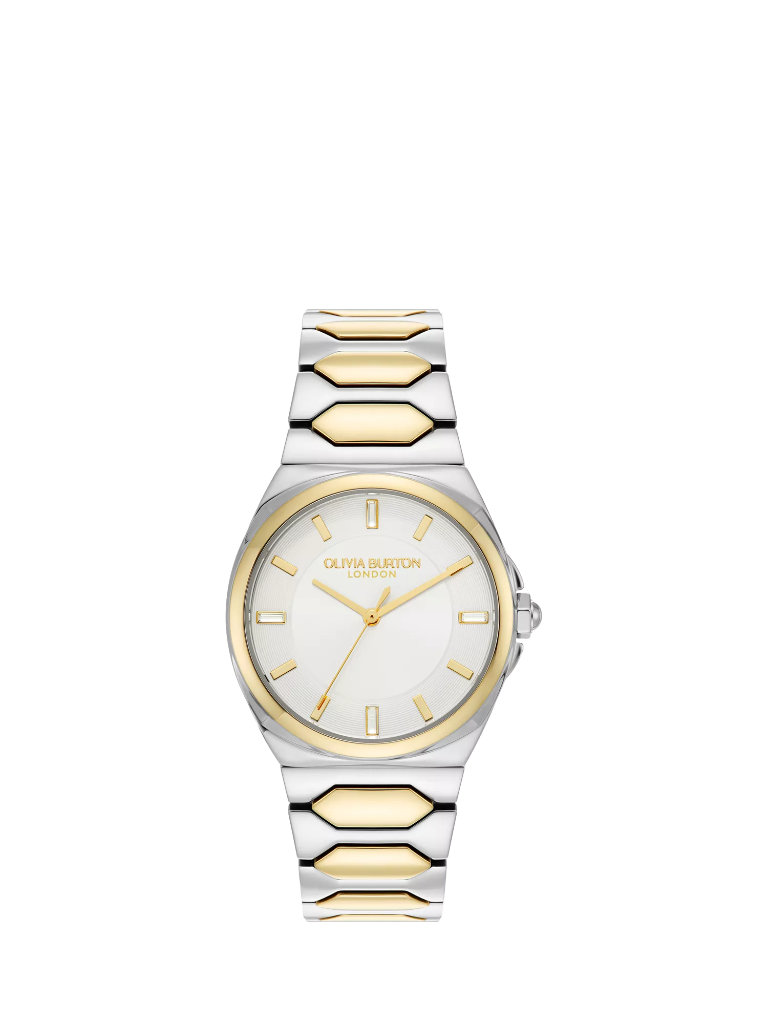 This Olivia Burton 34mm three-hand watch comes with a simple sunray dial. Finished with a stainless steel two-toned link bracelet strap. The style is water resistant up to 3ATM.