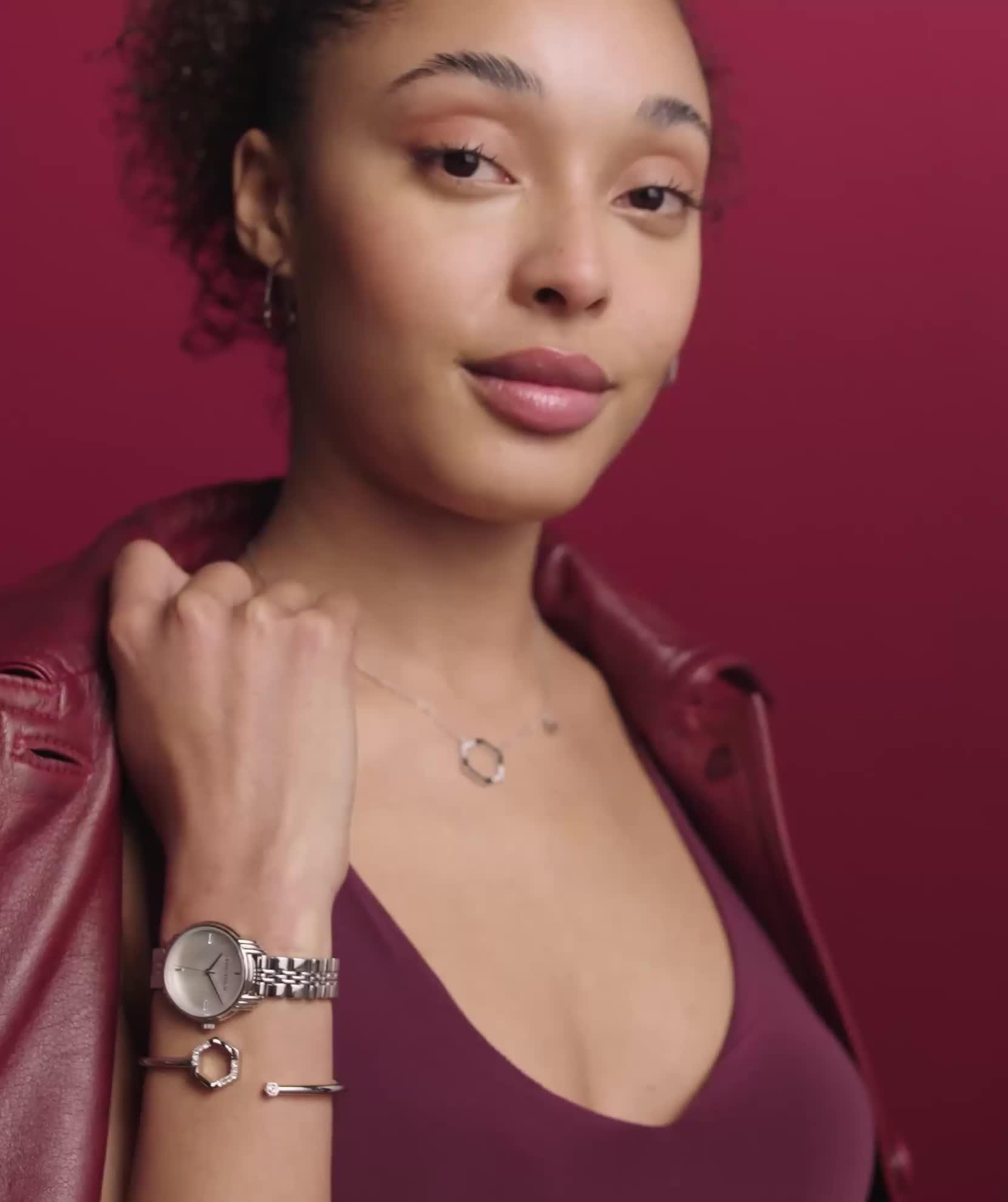 This Olivia Burton timepiece is designed with a 30mm stainless steel case with art deco-inspired lugs, faux-ivory Mother Of Pearl dial with refined baguette markers, and stainless steel bracelet. Water resistant to 3ATM.