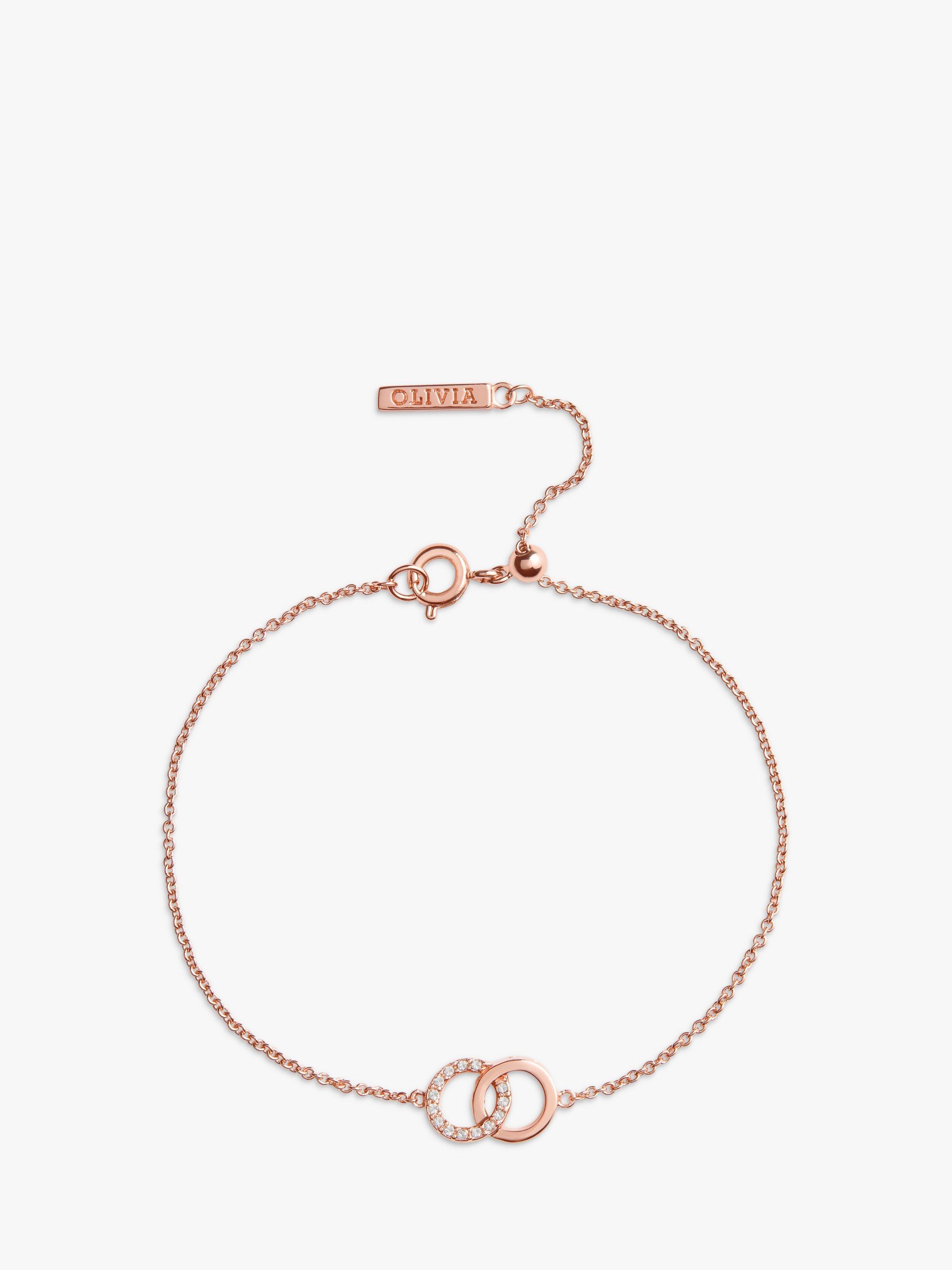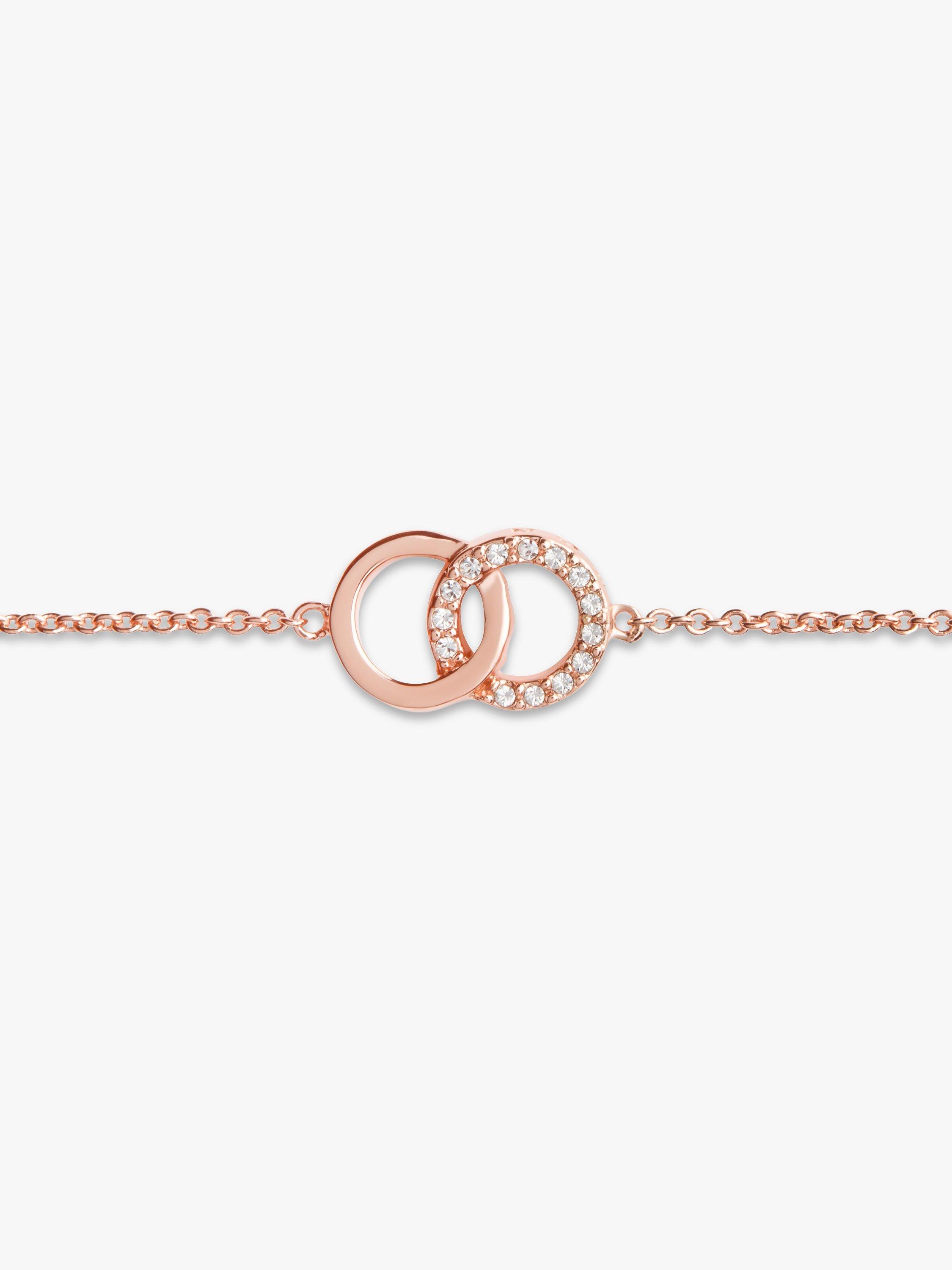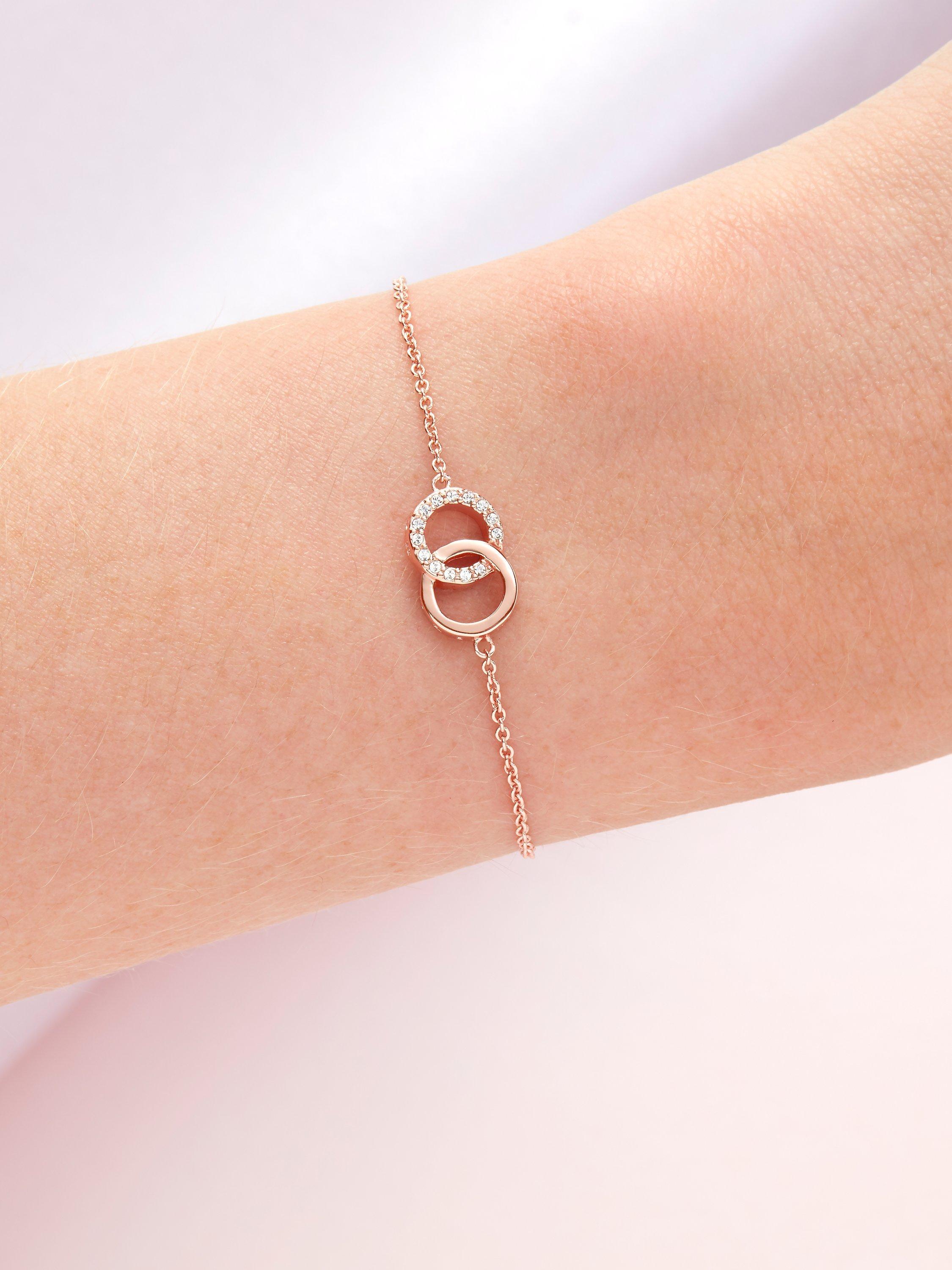 With sparkling cubic zirconia stones, the piece offers a fairly minimalist look represented by the interconnected circles. The chain is adjustable for the perfect fit.