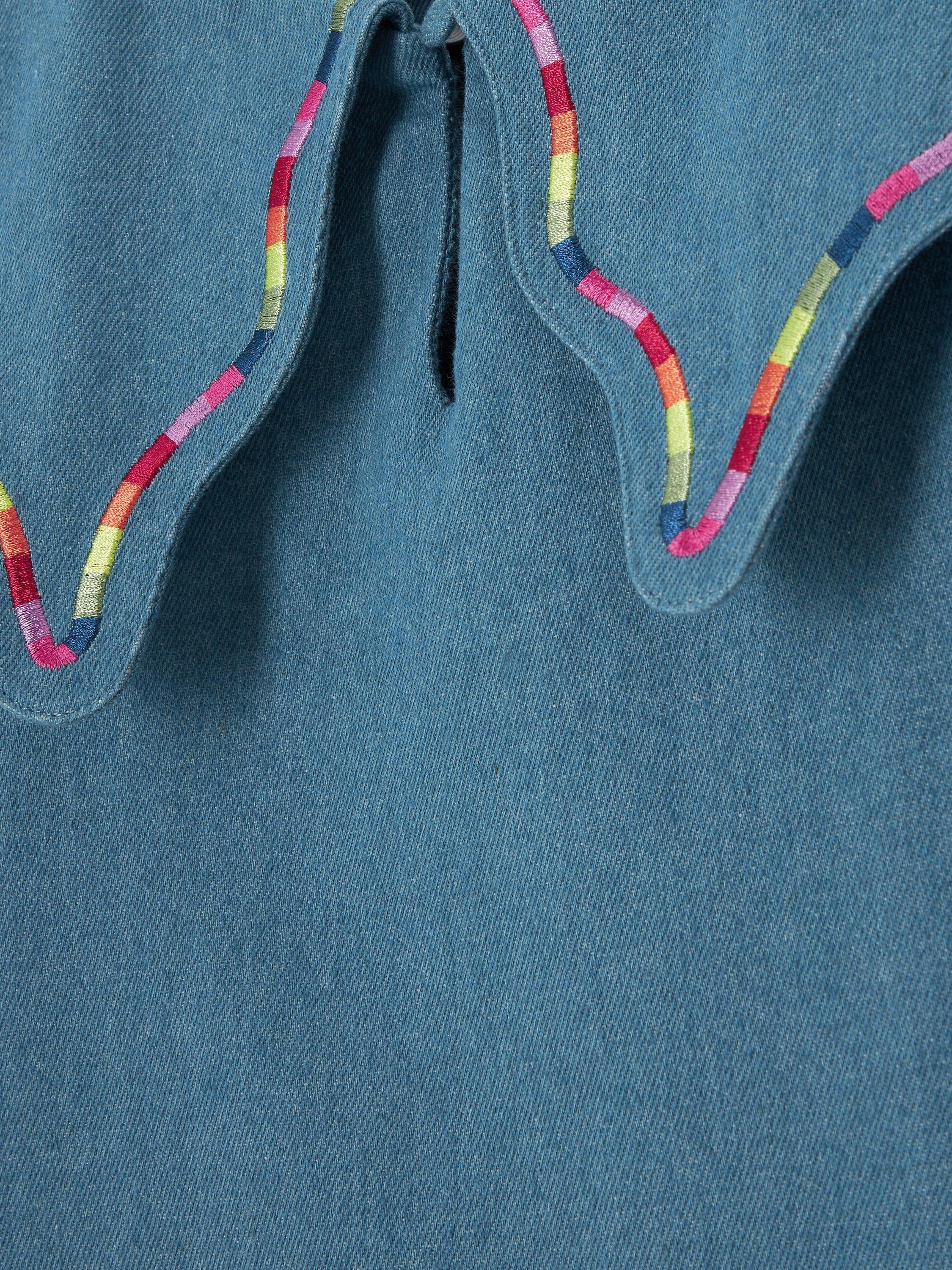 Olivia Rubin have shrunken down their favourite styles so you can twin outfits with your little ones. Bryony, their long-sleeved blouse, gets the kids treatment this season in denim. The oversized collar of this easy-fit blouse is embroidered with a multicoloured line.