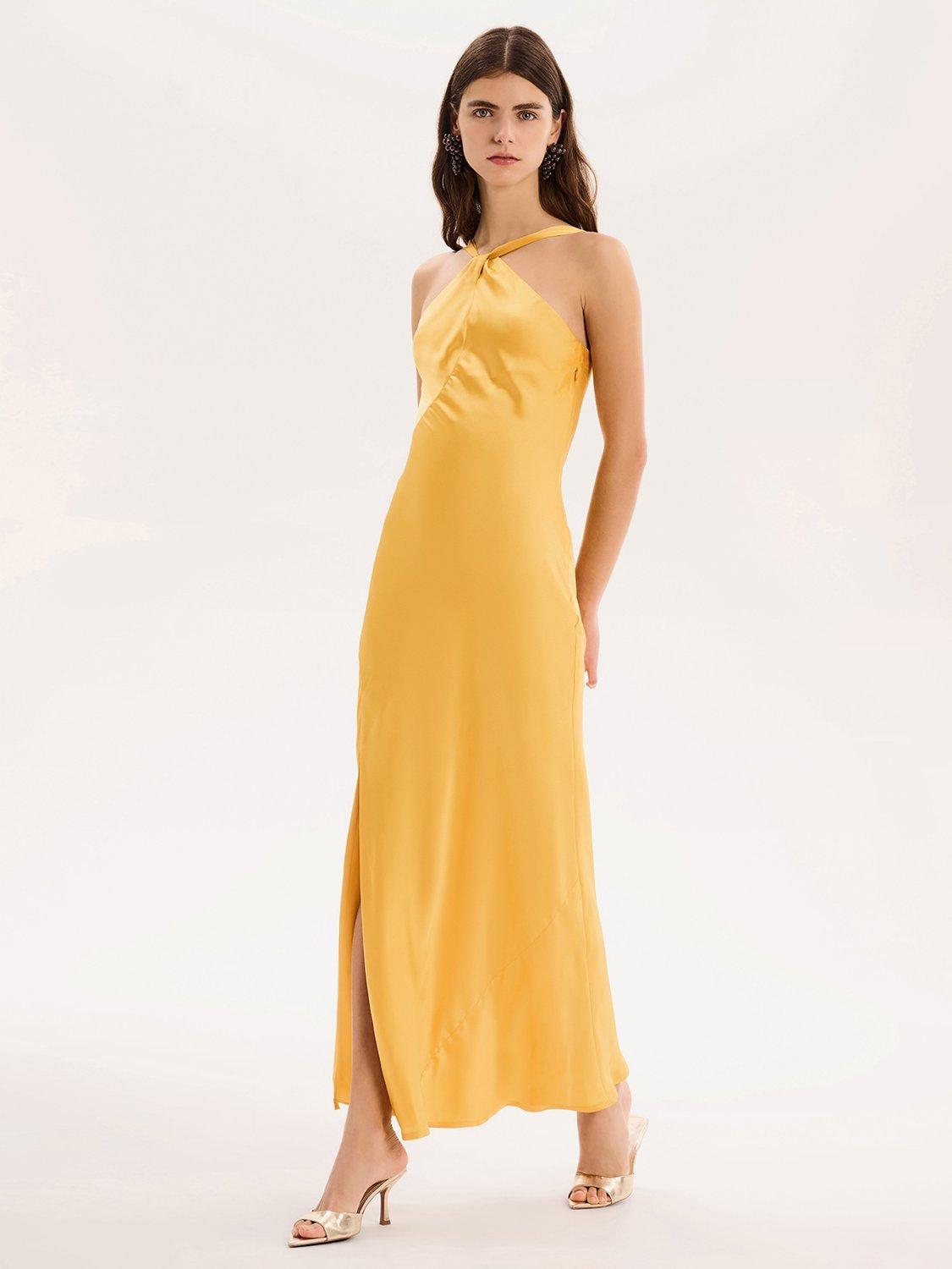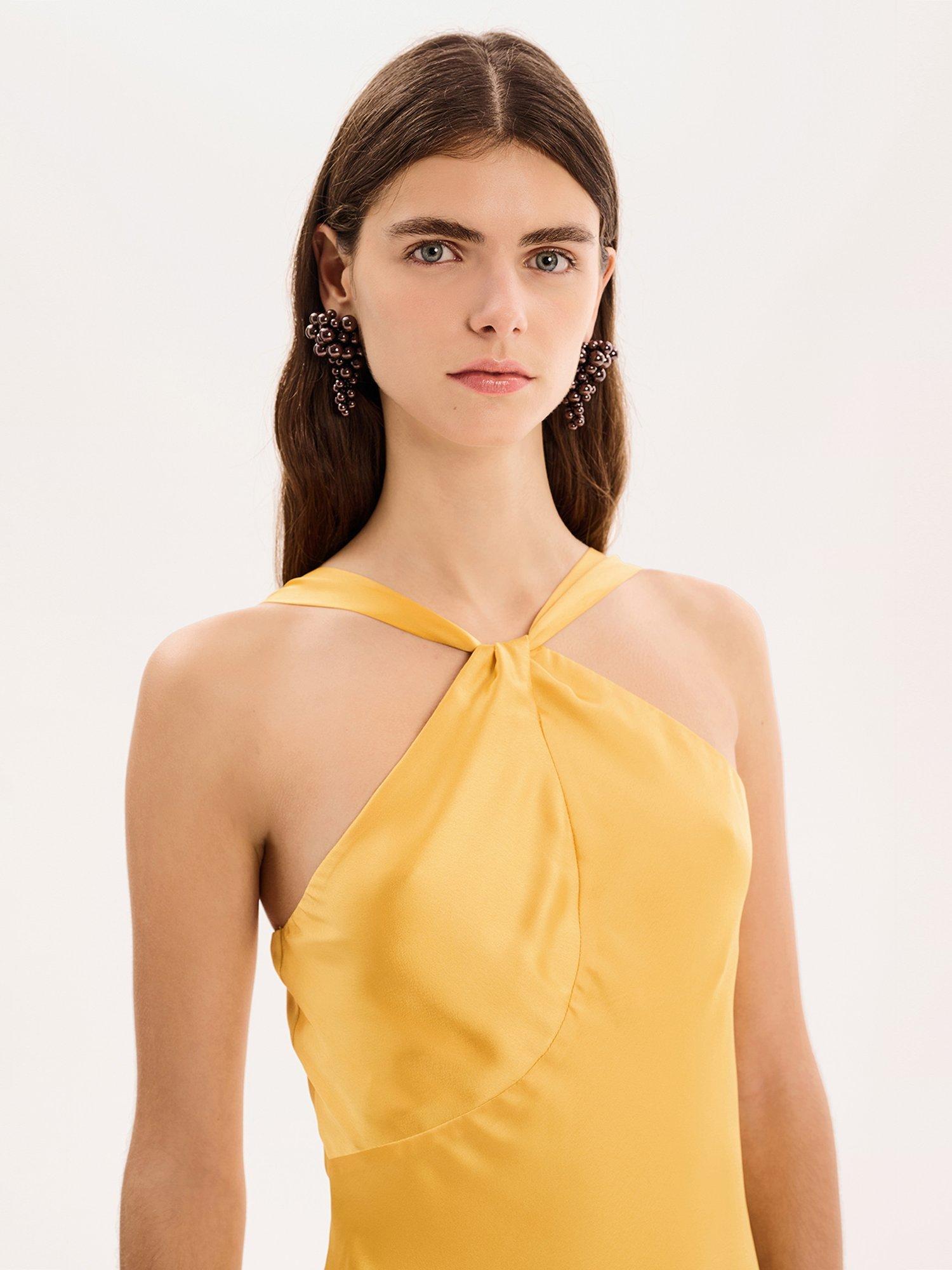 Alessia is all about a striking silhouette. The halterneck is defined by a twist detail with a silky sash threaded through. Crafted from 100% recycled polyester satin, she's designed to skim the hip and finish in the perfect midaxi length. Wear to your next event and let the compliments flood in.