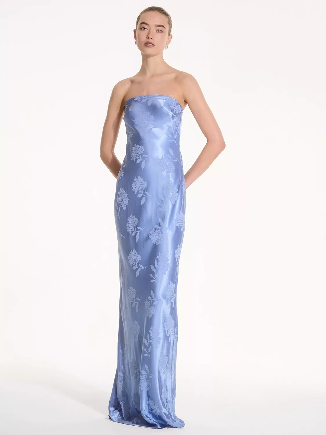 Simple, strapless, stunning; the Amdra is all that and more. Crafted from slinky 100% recycled polyester in a gorgeous floral jacquard, she's fitted throughout to enhance the elegance of your figure. She would make a great bridesmaid dress whether you're sticking to a theme or mixing and matching across colours and silhouettes.