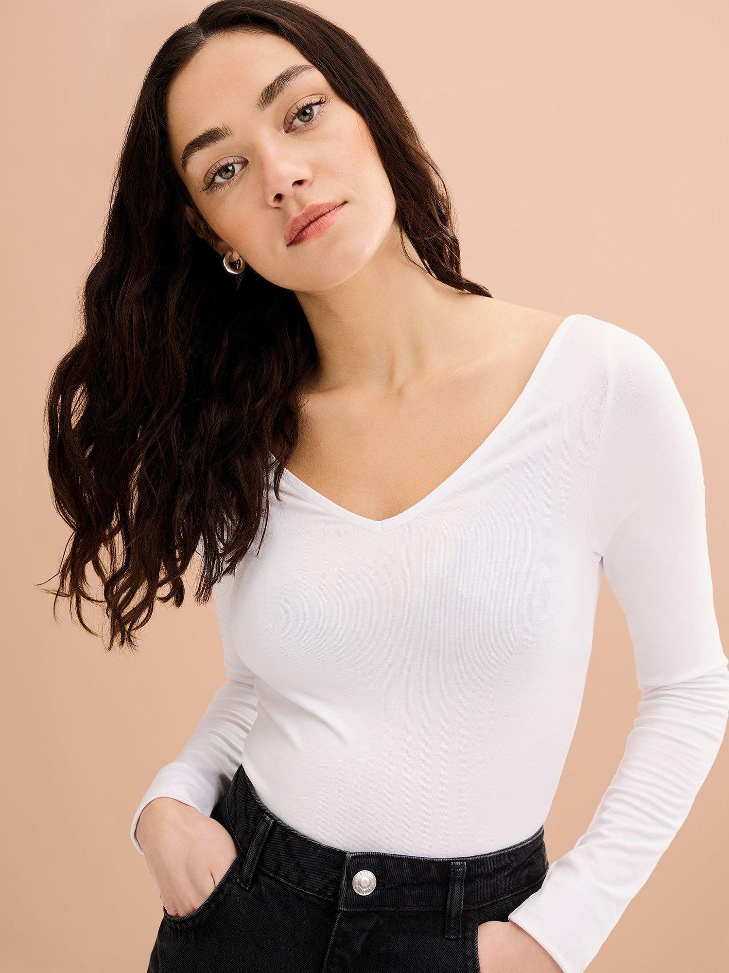 Designed to be worn with trousers, skirts, and jeans without riding up, the Ariana body features a flattering V neck in soft viscose.