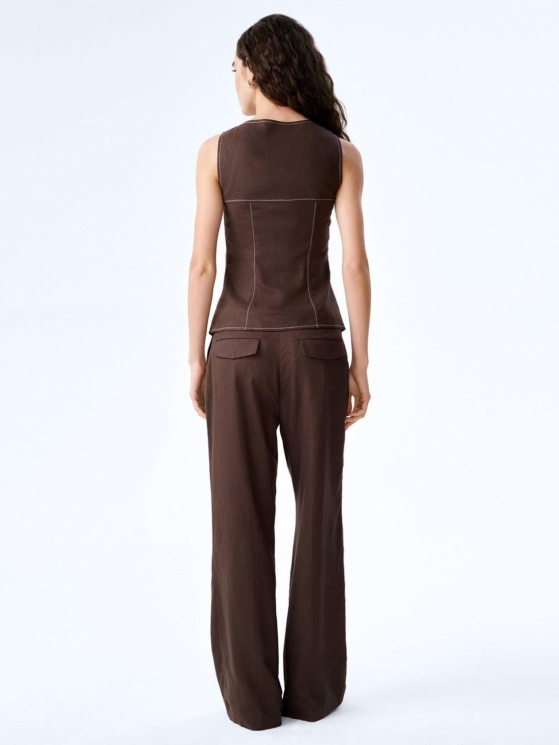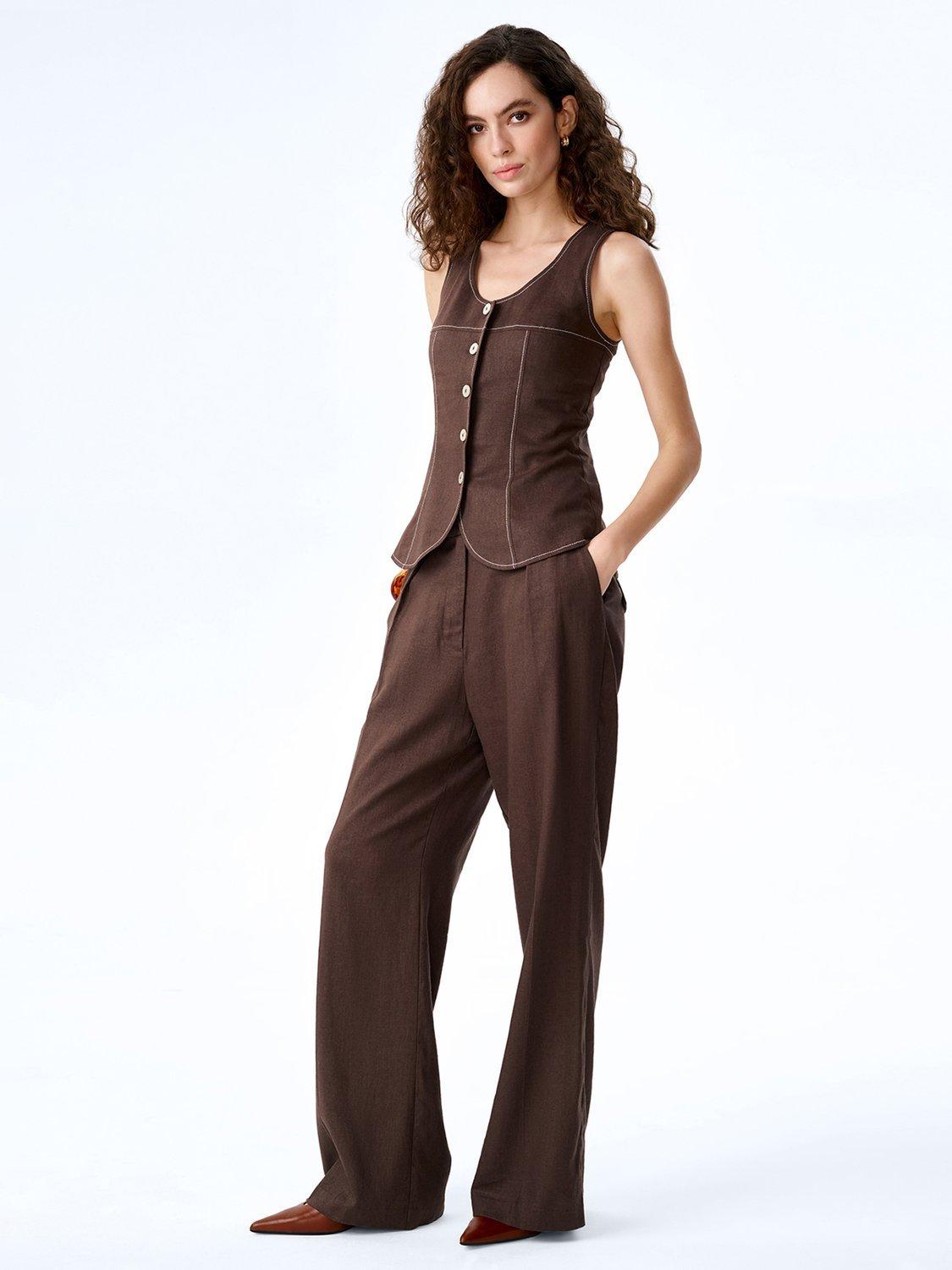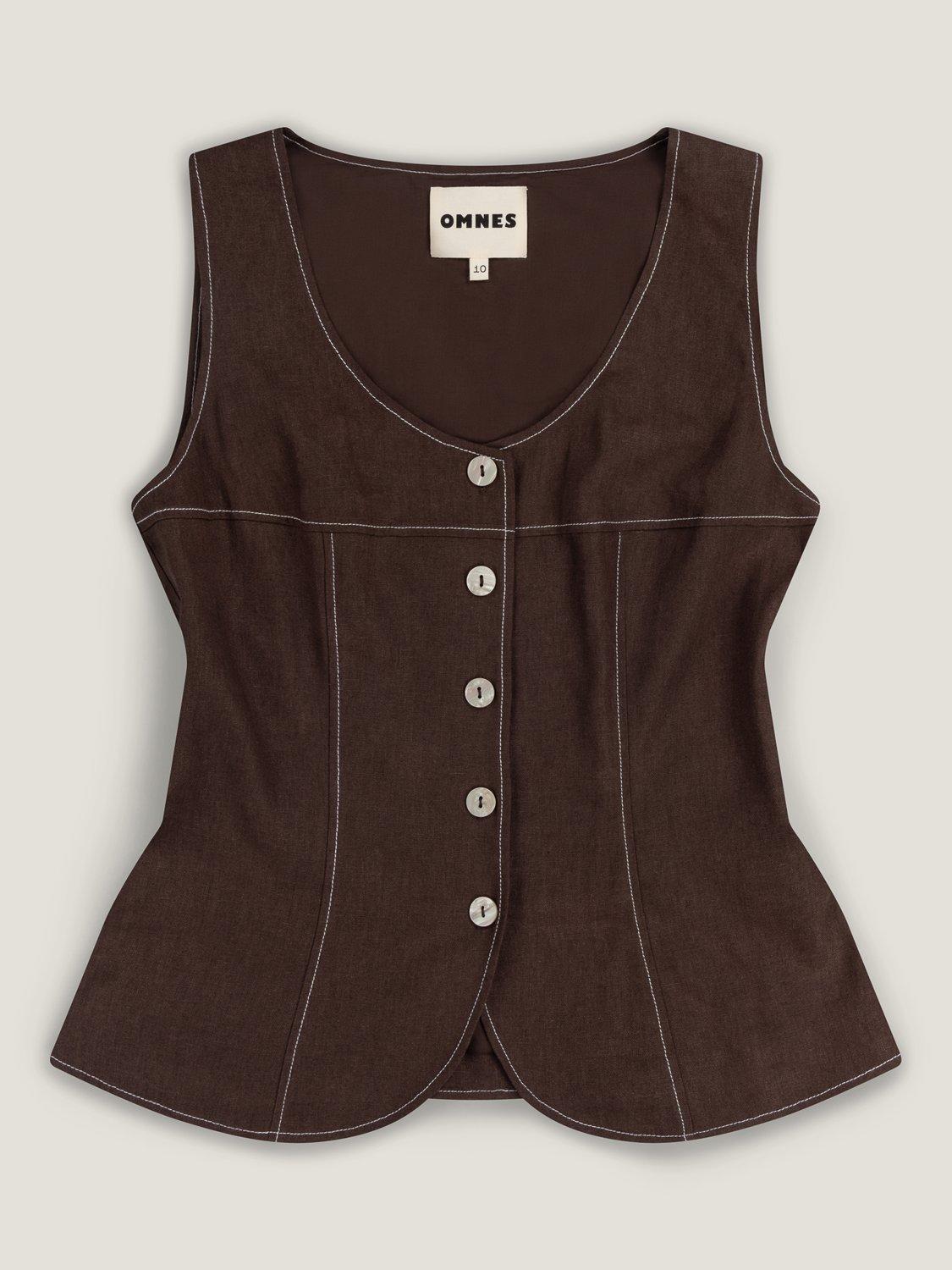 Inspired by classic menswear, the Austen waistcoat is crafted from breathable linen in a rich chocolate hue. It features a clean button-front and a waistcoat-inspired silhouette with a sharp, tailored fit. Finished with subtle contrast stitching for a modern twist, Austen works perfectly worn alone or layered. Style it with the matching Pearl trousers for a playfully polished co-ord.