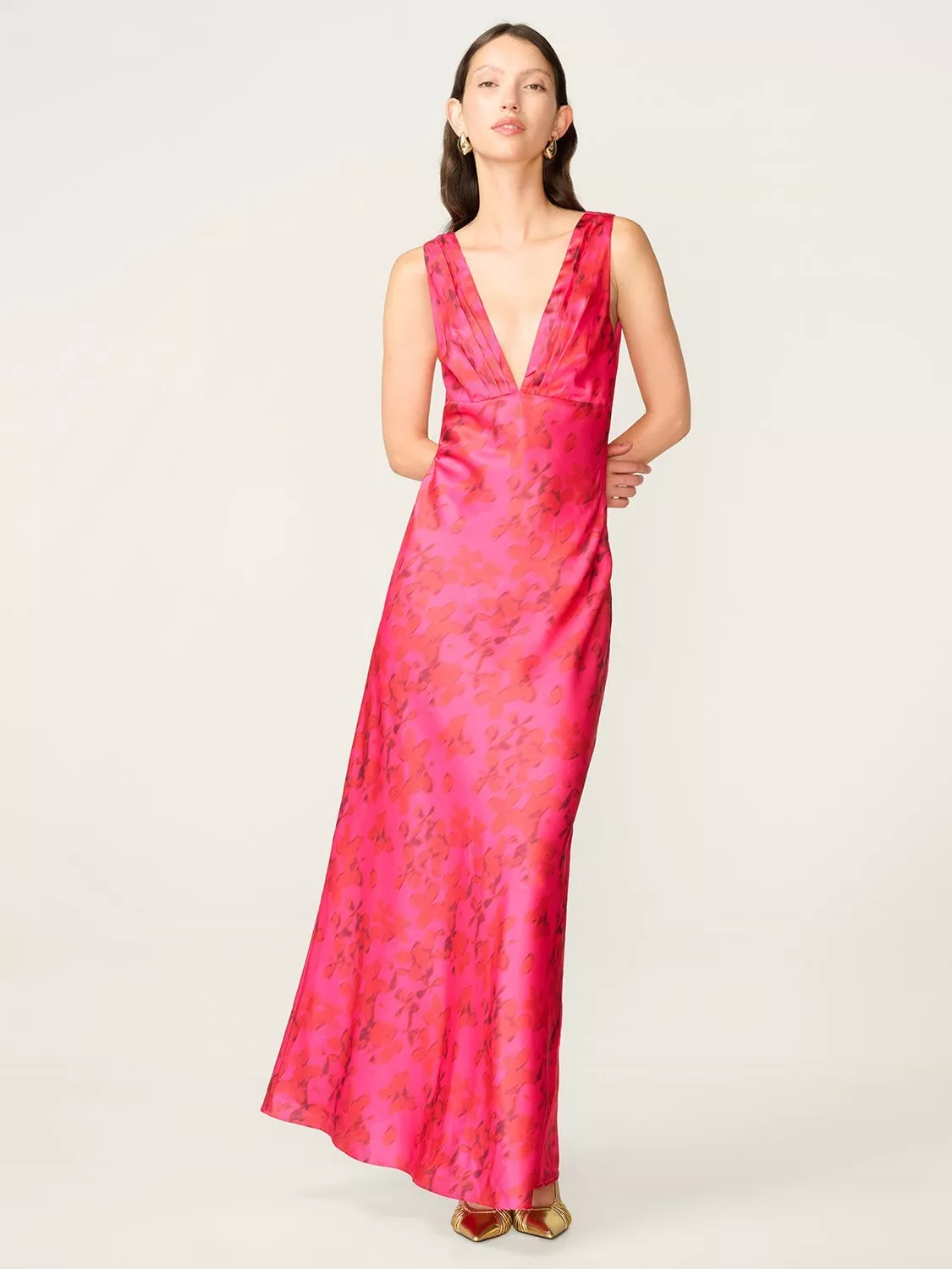 A satin maxi dress featuring a flowing shift shape, elegant V-neck, and bold floral pattern. The sleeveless design keeps you comfortable while giving you room to move, perfect for evenings that matter.