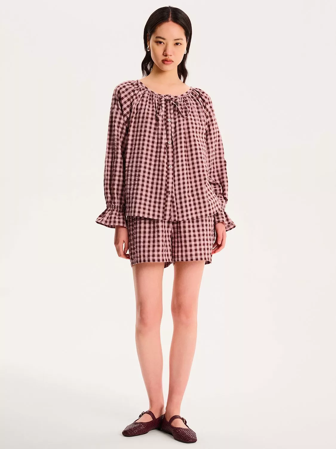 Dianne is a bohemian dream in cotton seersucker gingham. This smock-style blouse features a wide, gathered neckline that creates a flattering, flowy silhouette. The button front adds a touch of classic charm, while the frill cuff gives a playful, vintage-inspired twist.