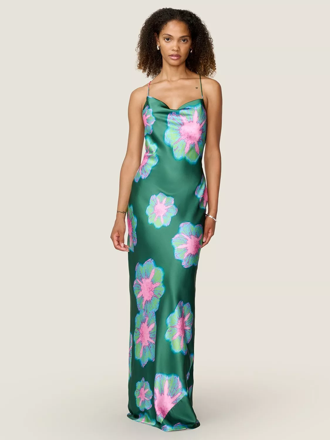 A bodycon maxi dress, featuring a fluid cowl neck, open back, and delicate lace-up detail that flatters from every angle. The abstract floral pattern keeps things interesting while the fit flatters your confidence all night.