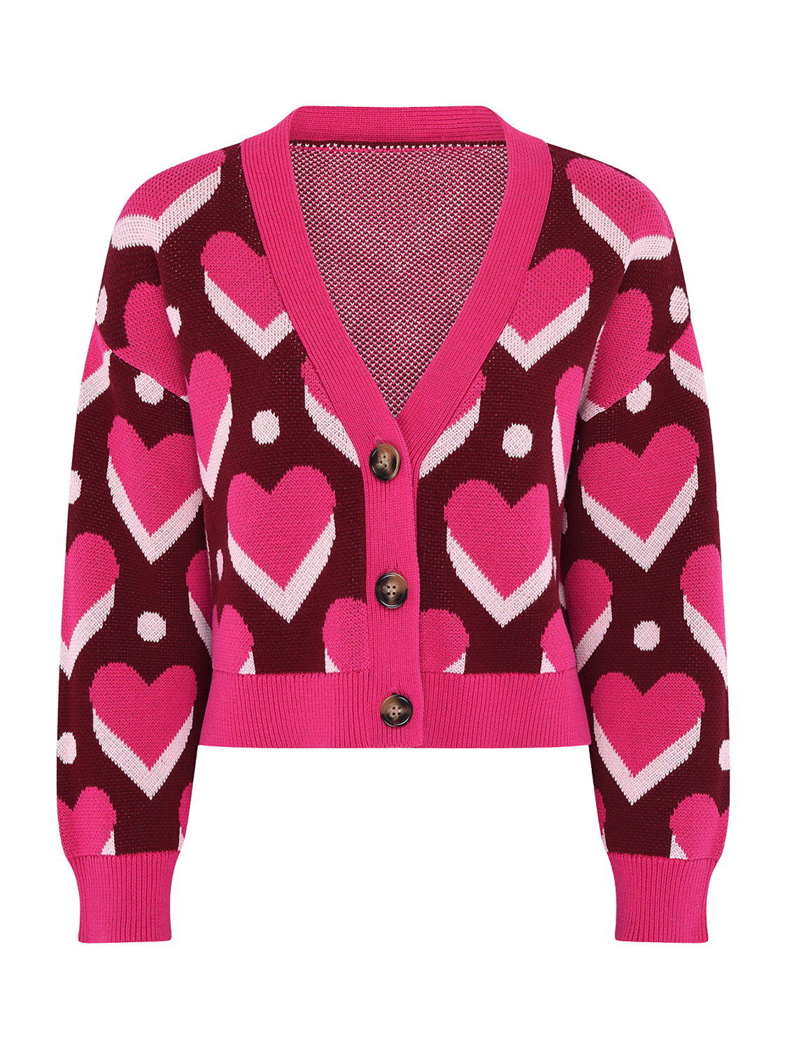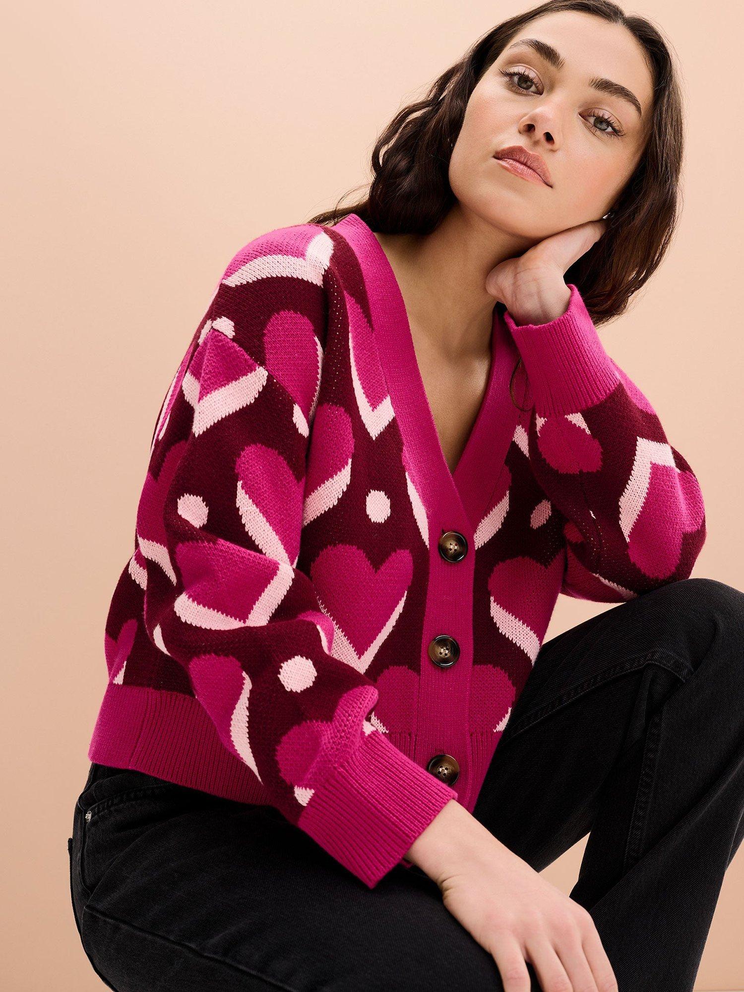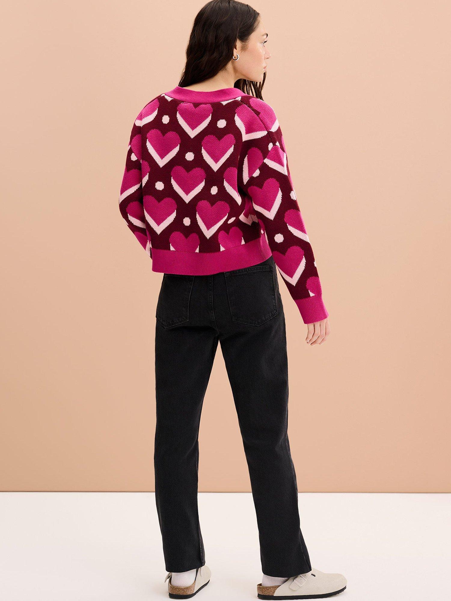 A pop-art inspired heart print is offset by a cool base in the bold and boxy Heather cardigan. Cropped at the torso with a relaxed fit throughout, this statement knit is crafted from soft cotton. Wear on its own or own the colour clash with bold layering.