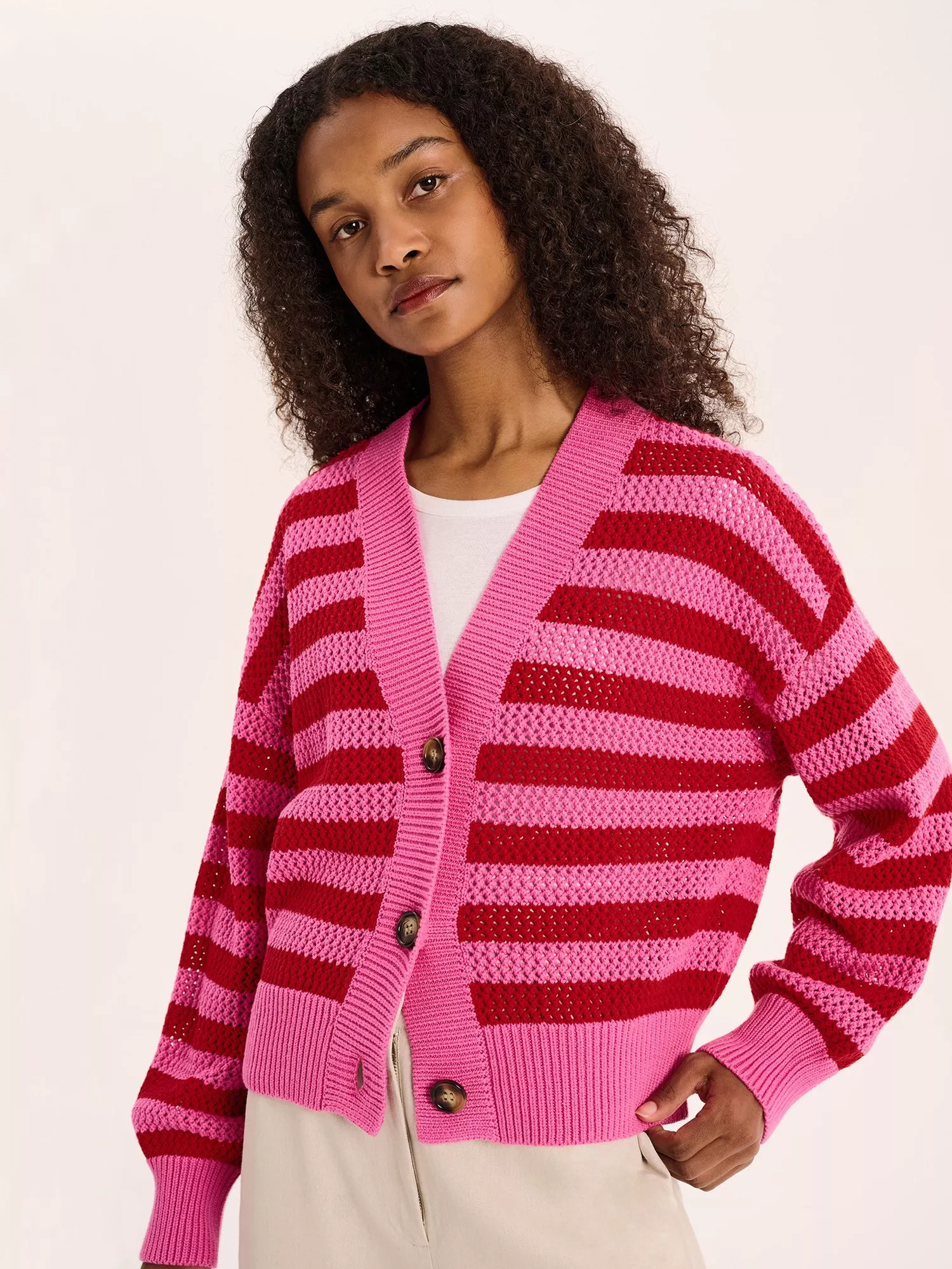 The bold and boxy Heather cardigan is cropped at the torso with a relaxed fit throughout. It's a statement knit crafted from soft cotton.