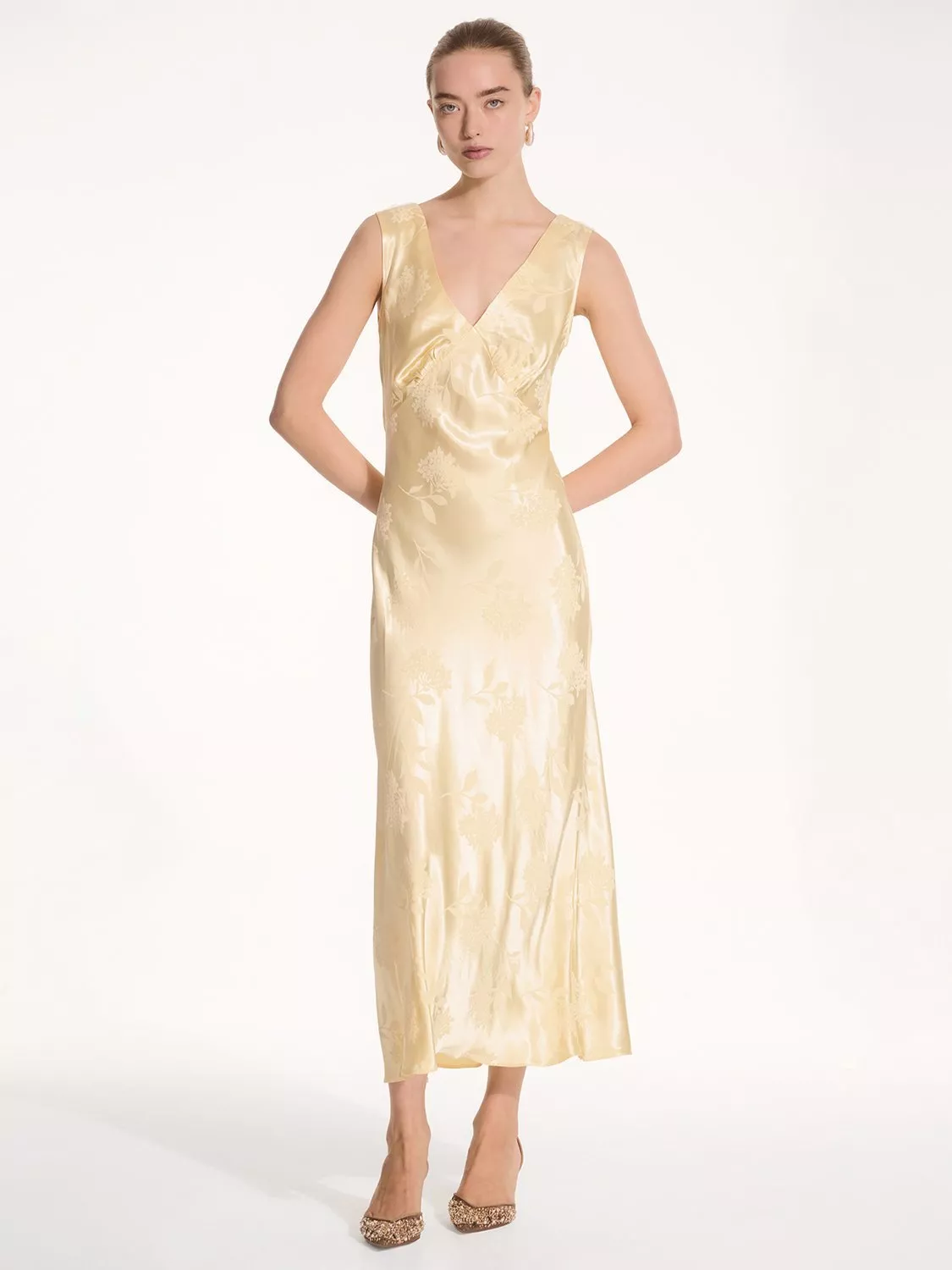 Introducing the ultimate slip dress, Iris, who is ready and waiting to take you to weddings or any special occasions. With its floral jacquard print and thick strap slip silhouette, it's a must-have. We love its Empire Line cut that makes it oh-so flattering, and its soft and slinky fabric. Iris would make a great bridesmaid dress whether you're sticking to a theme or mixing and matching across colours and silhouettes.