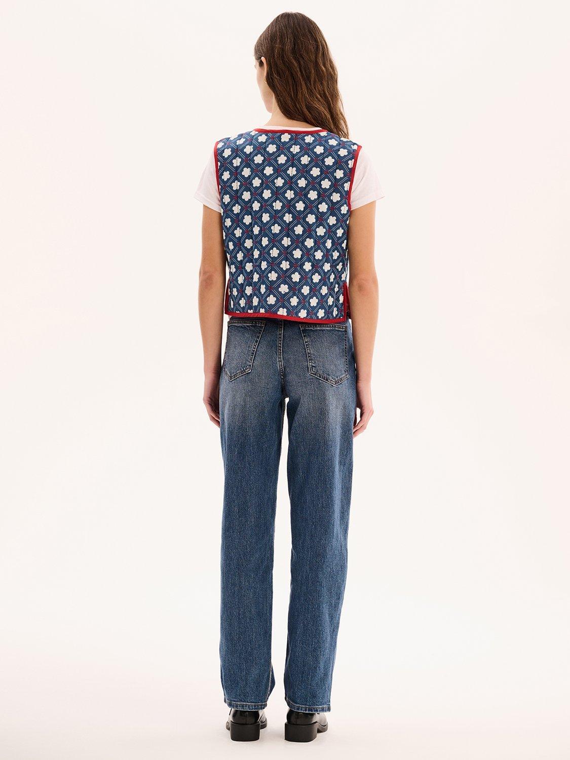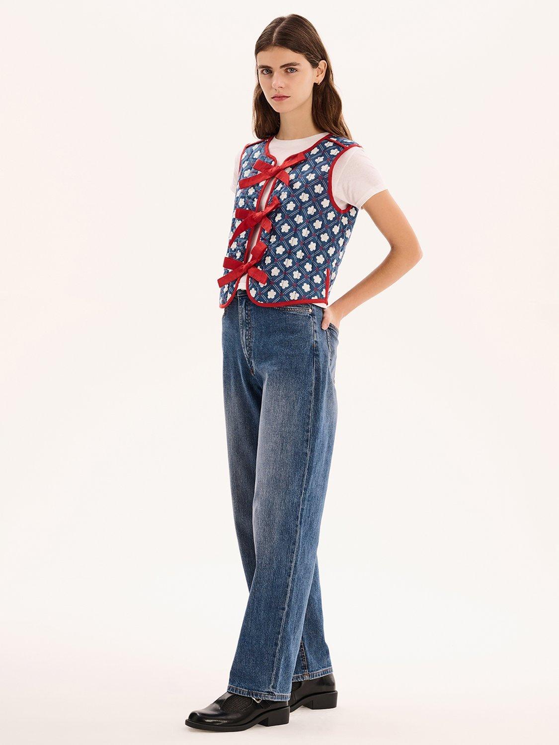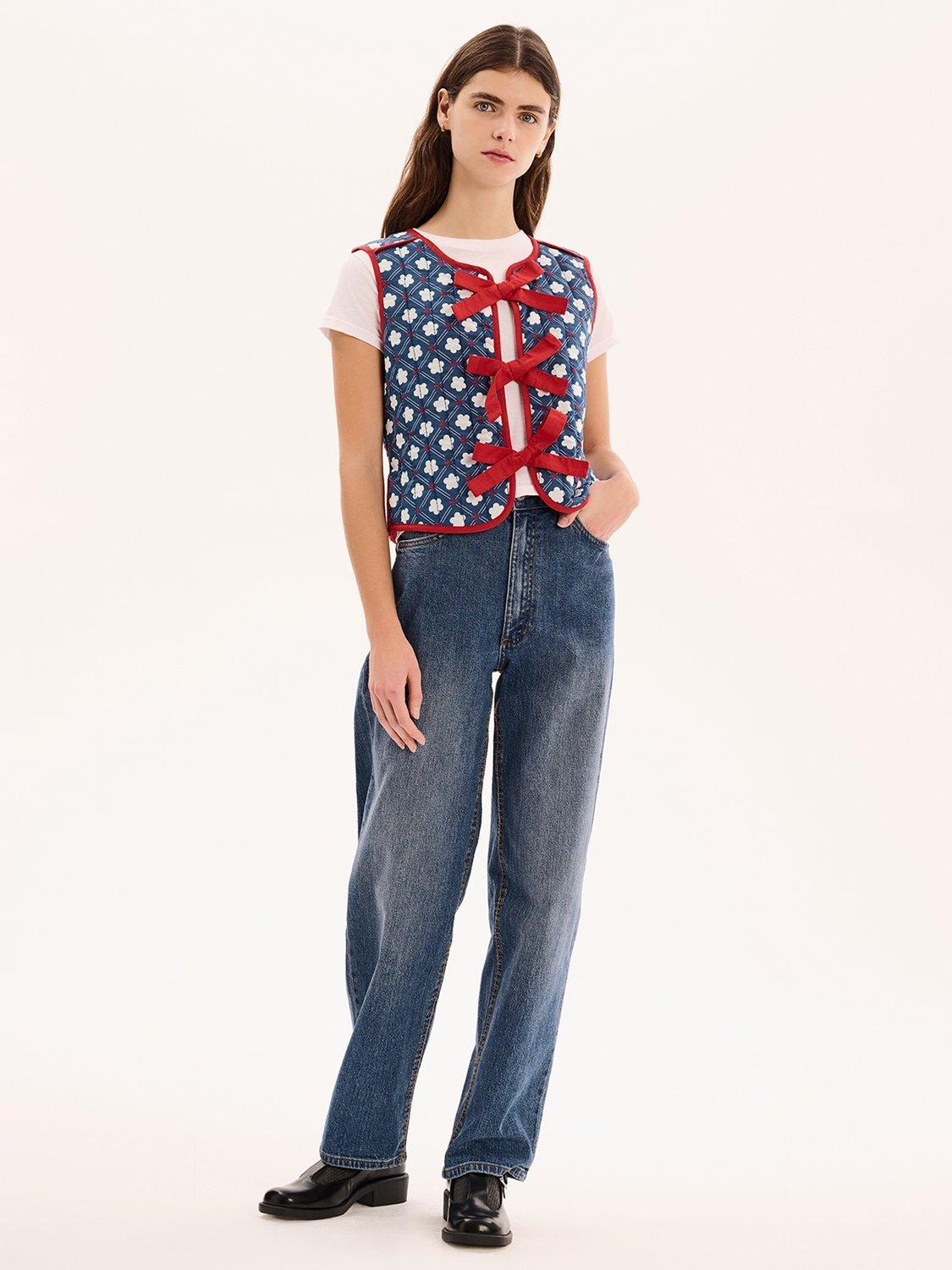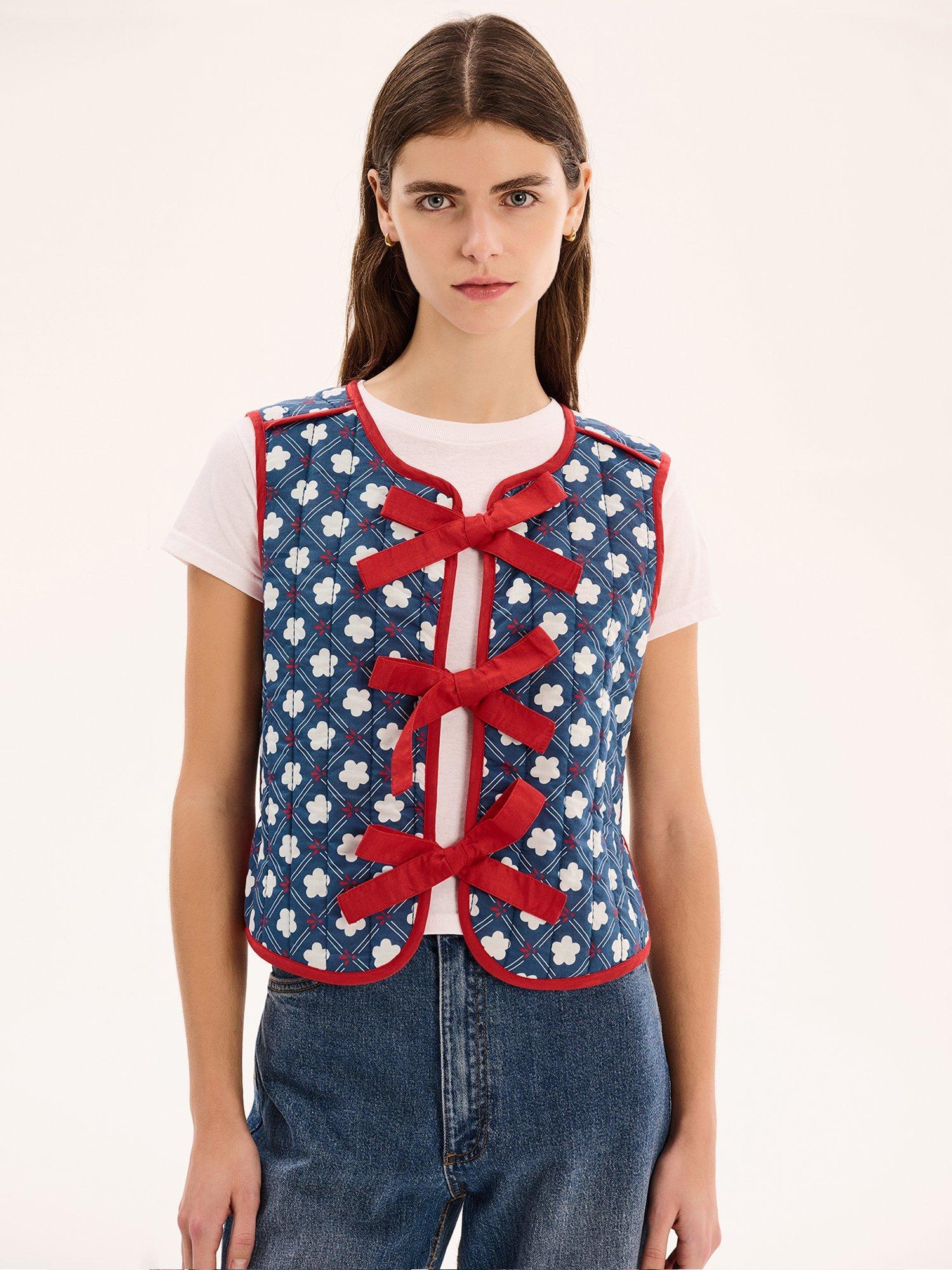 Level up your layering with Jojo. This quilted vest features a tie front closure with floral check pattern. Crafted from cotton with recycled polyester wadding, she's as cute as she is cosy.
