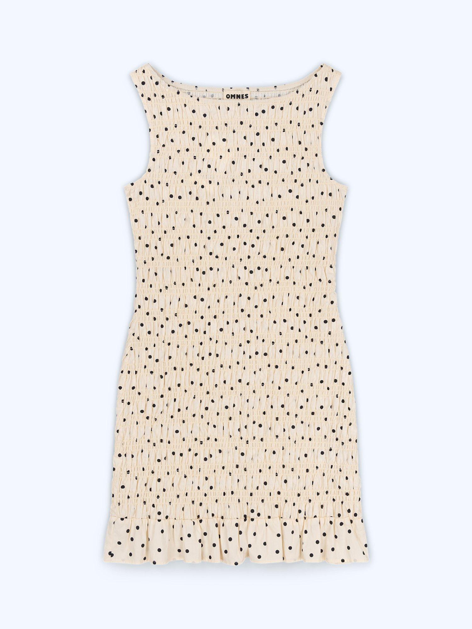Luann is a fresh take on the fitted mini dress. Crafted from breathable cotton in a polka dot print, this sleeveless dress features a high boat neckline and shirring throughout for a flattering, figure-hugging fit. Finished with a soft ruffled hem for added charm, Luann balances comfort with thoughtful details; perfect for warm days, casual plans and effortless styling.