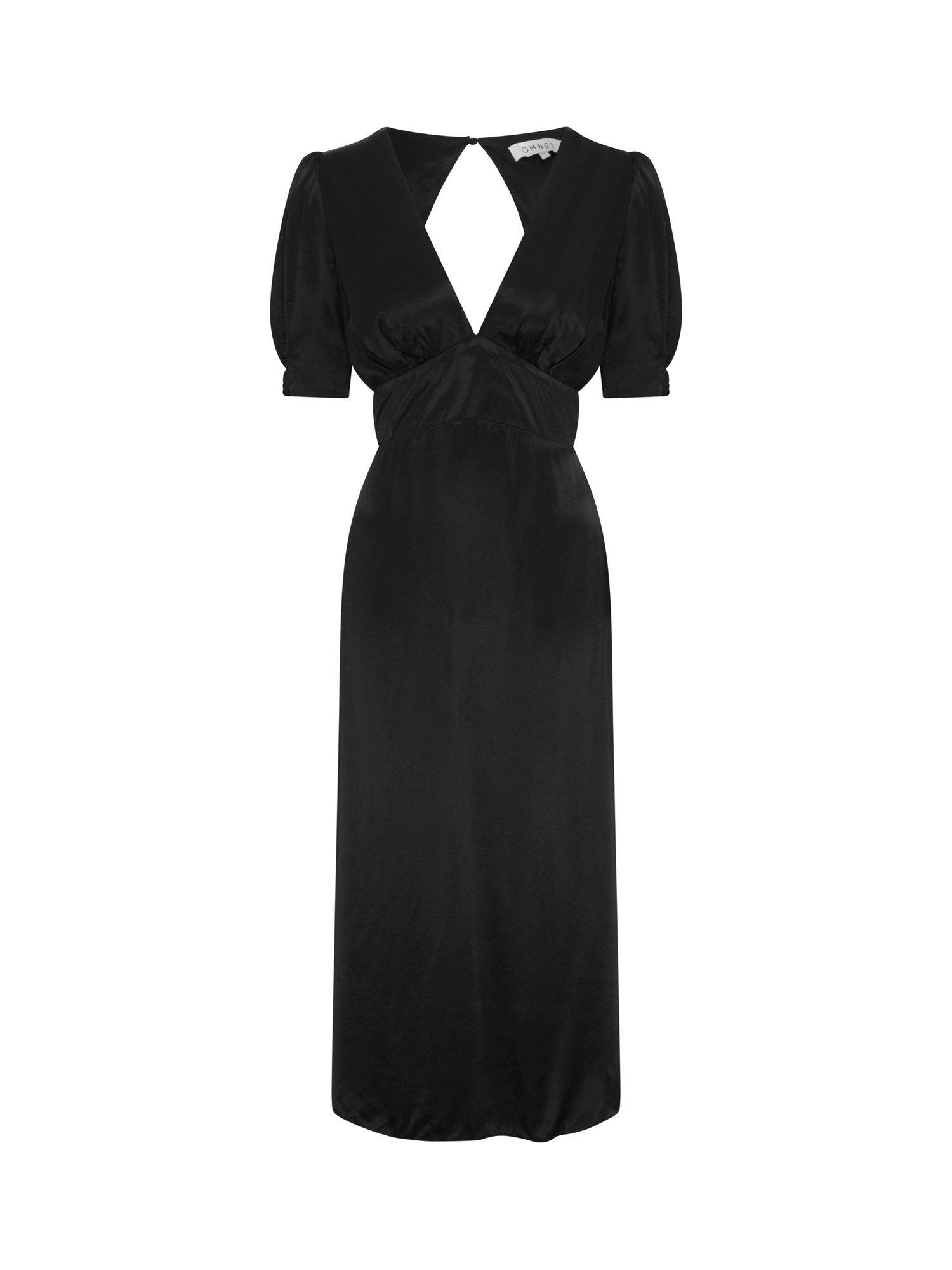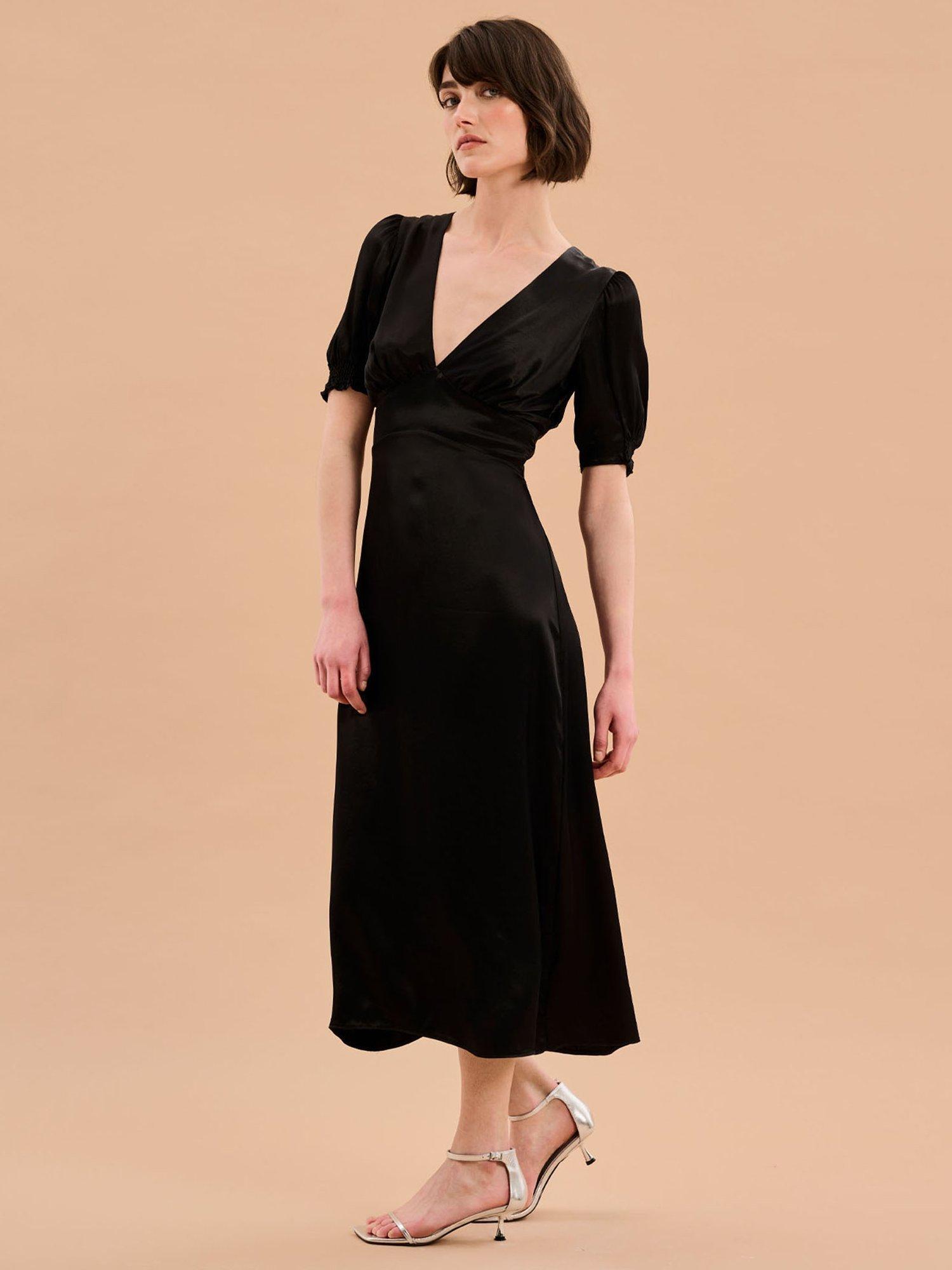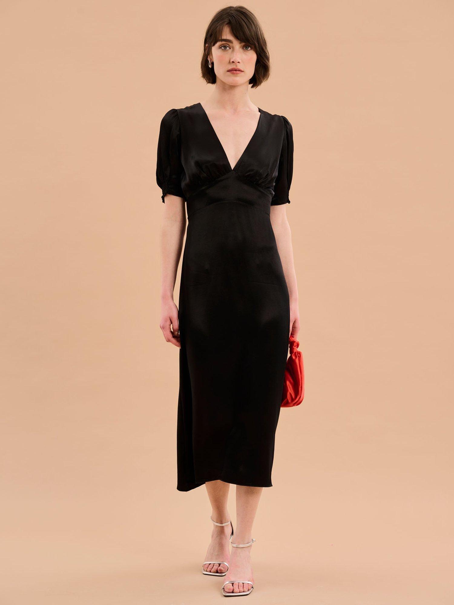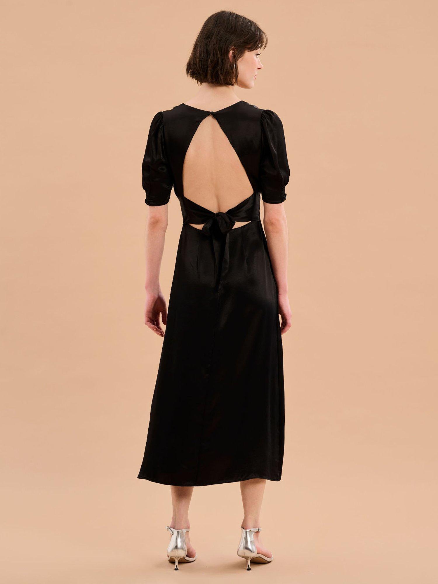 Odette is elegance with an edge. The 3/4 length sleeves are gathered at the bottom to create a feminine silhouette offset with a deep v-neckline. With an open back with sash detail, this dress in timeless black is a date night dream.