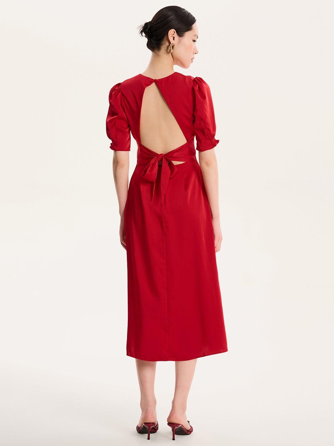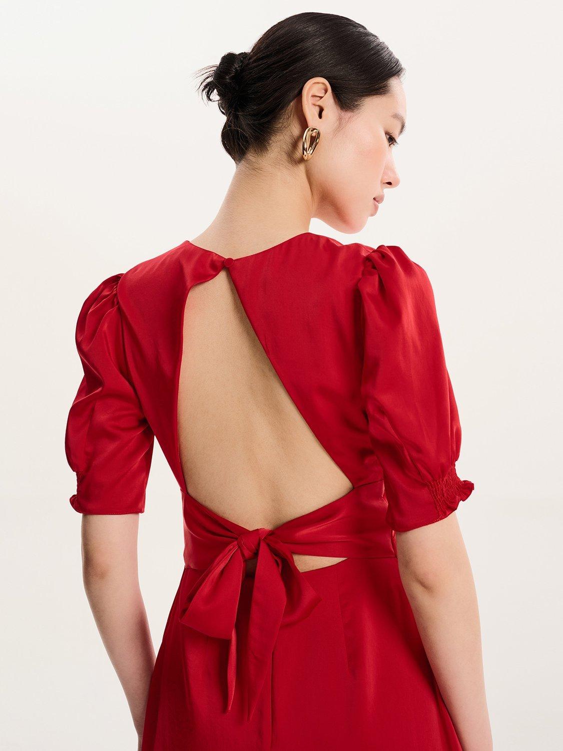 Odette is elegance with an edge. The 3/4 length sleeves are gathered at the bottom to create a feminine silhouette offset with a deep v-neckline. With an open back with sash detail, this dress in timeless black is a date night dream.