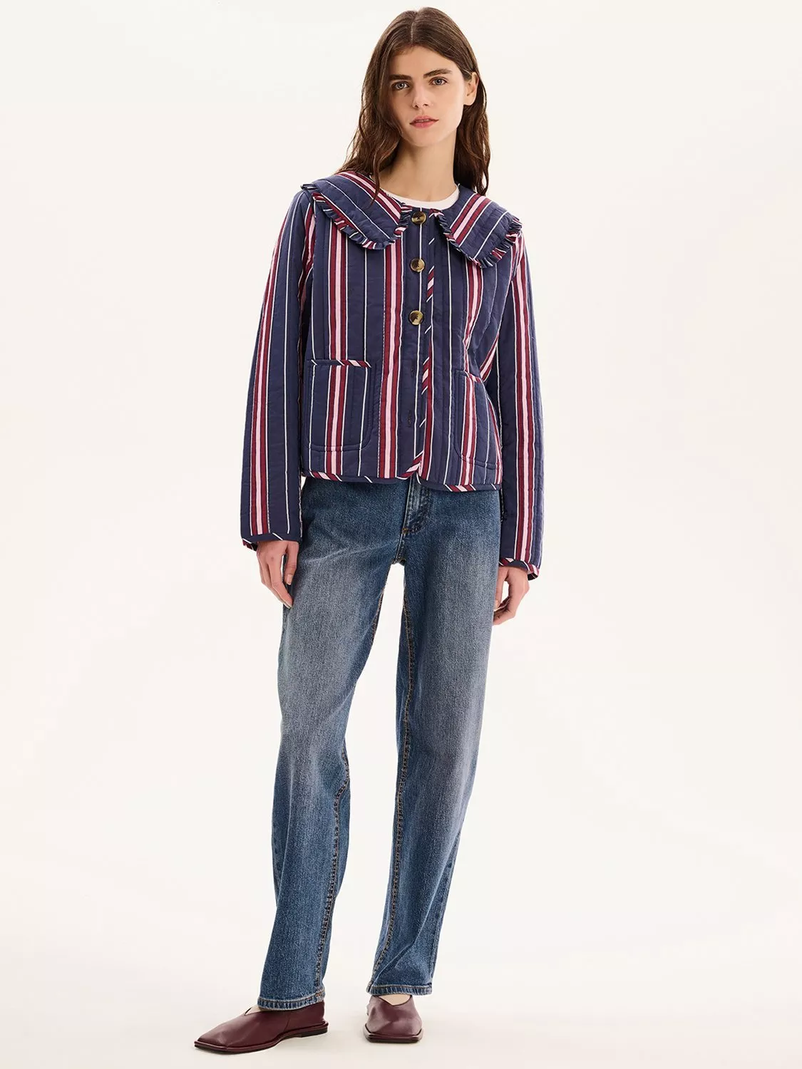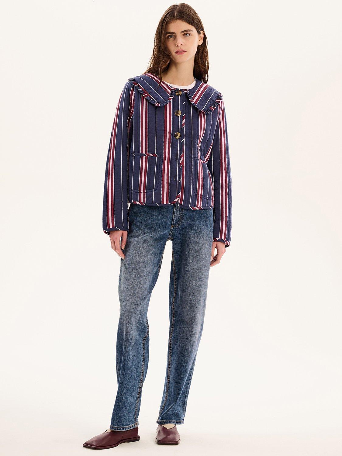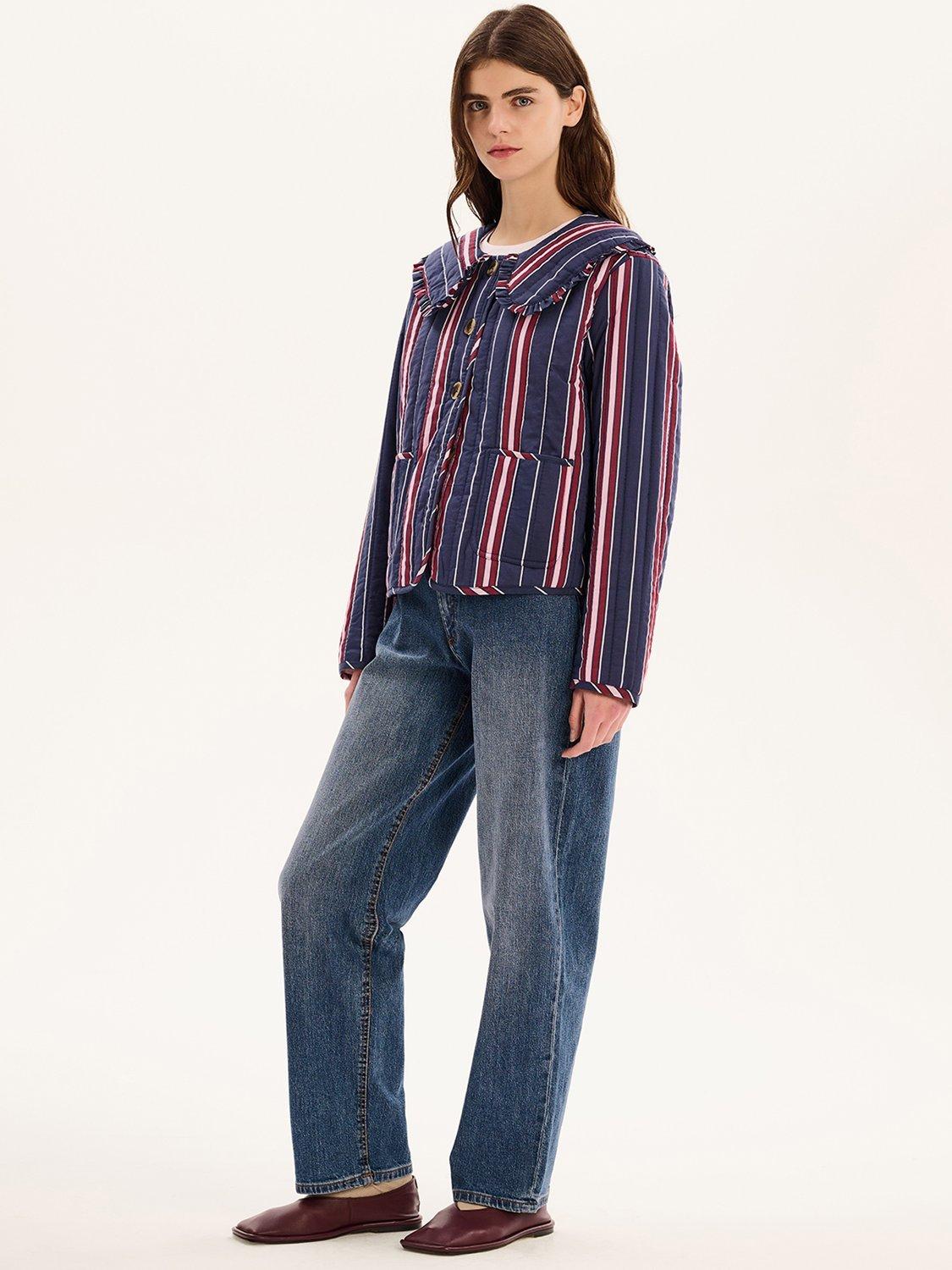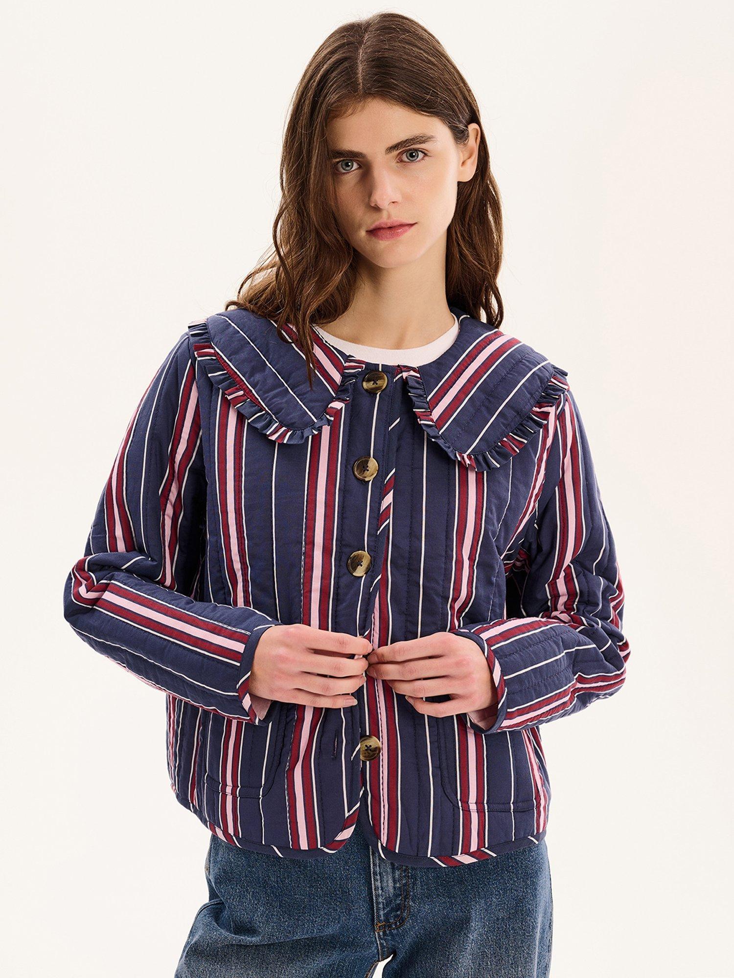 The Peggy jacket is lightly quilted for all year layering with a button closure and patch pockets. Designed with a large frill collar, the floral check pattern will add a touch of fun to any fit. Crafted from cotton with recycled polyester wadding for a relaxed fit.
