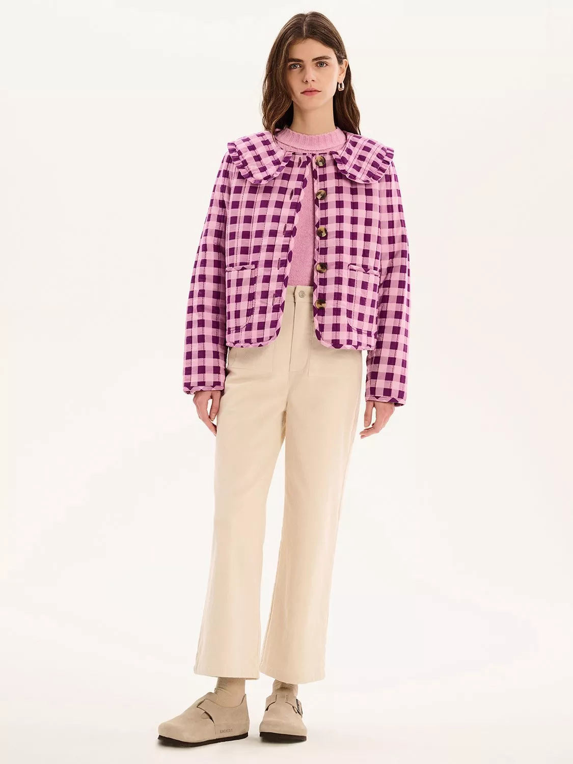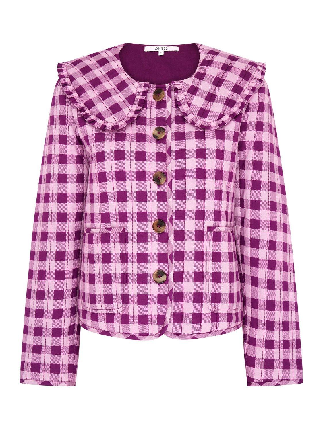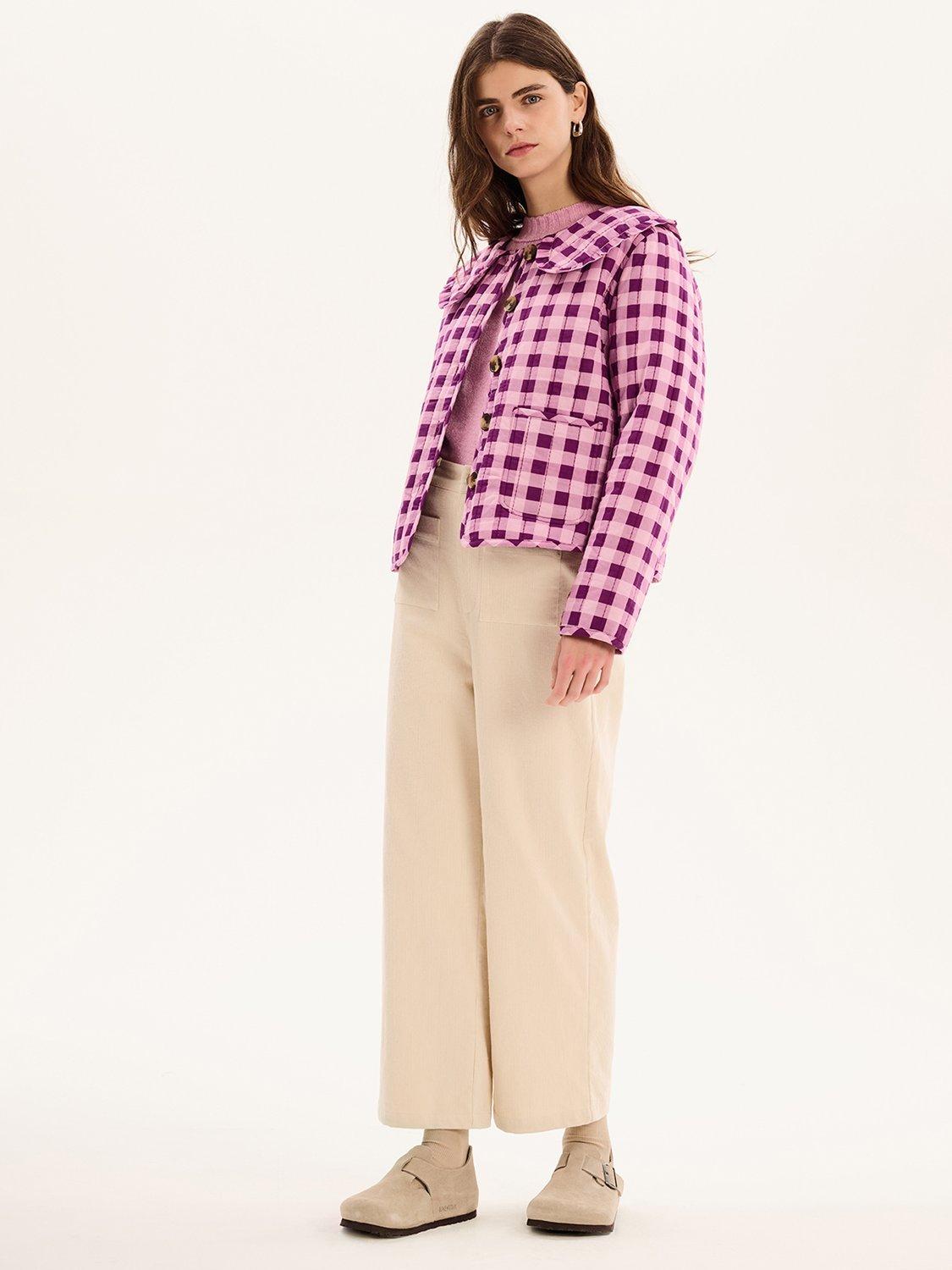 The Peggy jacket is lightly quilted for all year layering with a button closure and patch pockets. Designed with a large frill collar, the floral check pattern will add a touch of fun to any fit. Crafted from cotton with recycled polyester wadding for a relaxed fit.