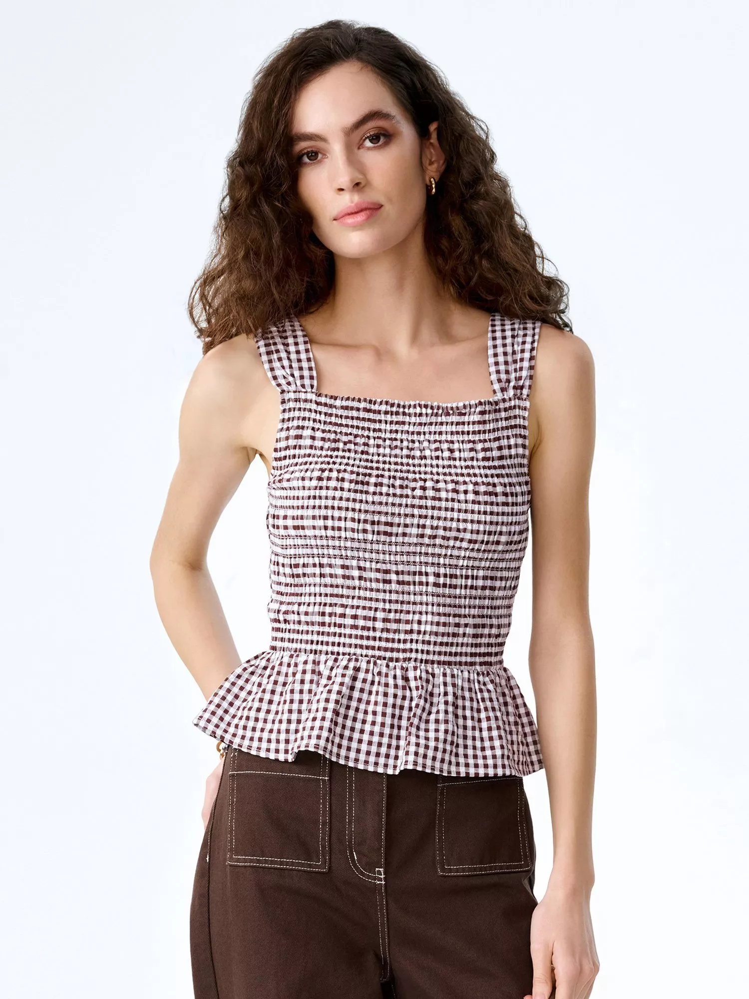 Romantic and refined, Rain is crafted from textured seersucker gingham for an elevated yet effortless look. Featuring an all-over shirred bodice for a flattering fit, this cotton top is finished with soft ruffle detailing that adds movement and a hint of playful femininity. The sleeveless silhouette makes it perfect for layering or wearing solo.