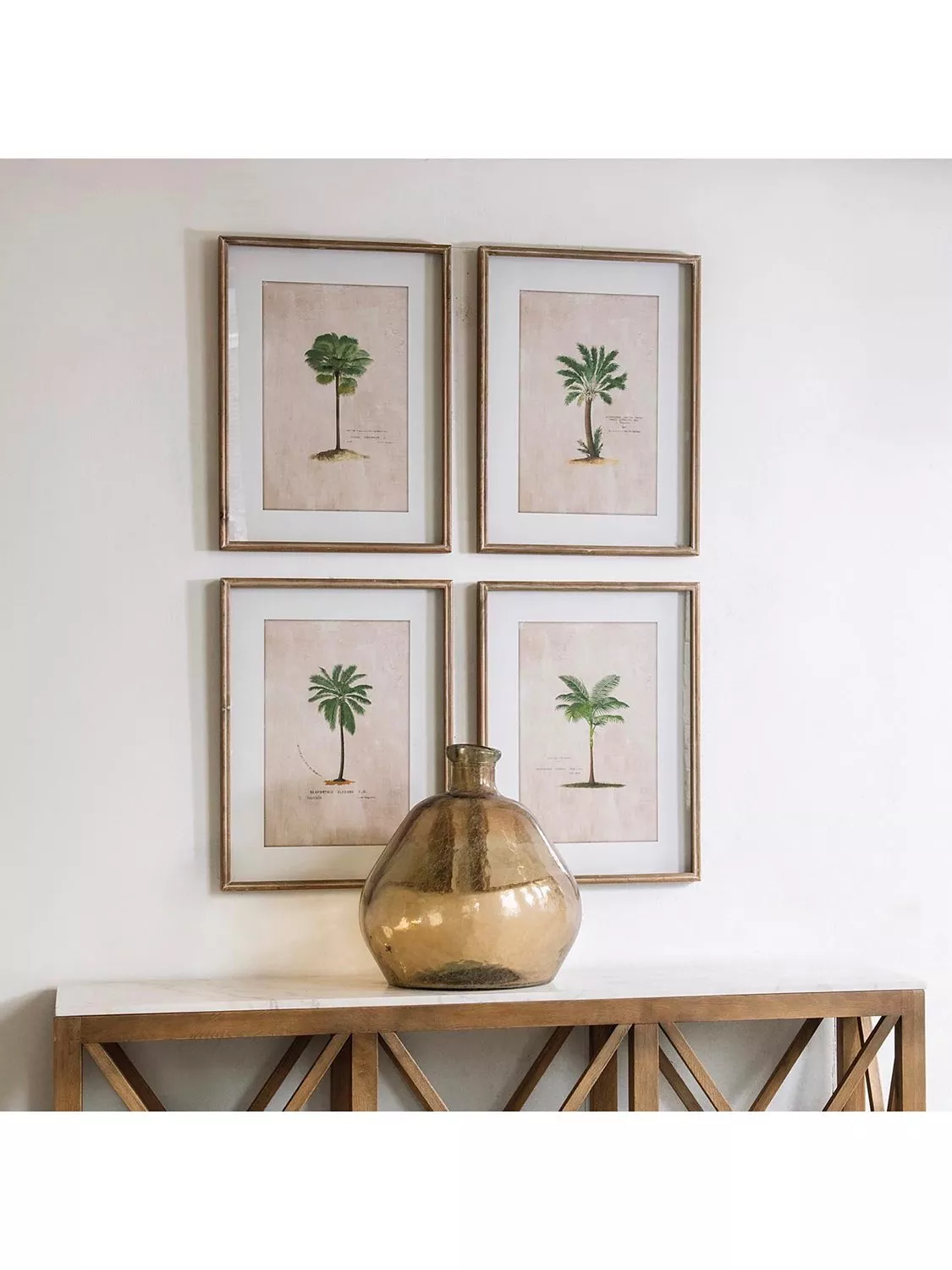 Rendering delicate structural details at a grand scale, this One.World series of four tropical prints with window mounts presents these four palm trees in a stunning form. The colour palette and wooden framing highlight the exquisite shapes and patterns of these beautiful prints.