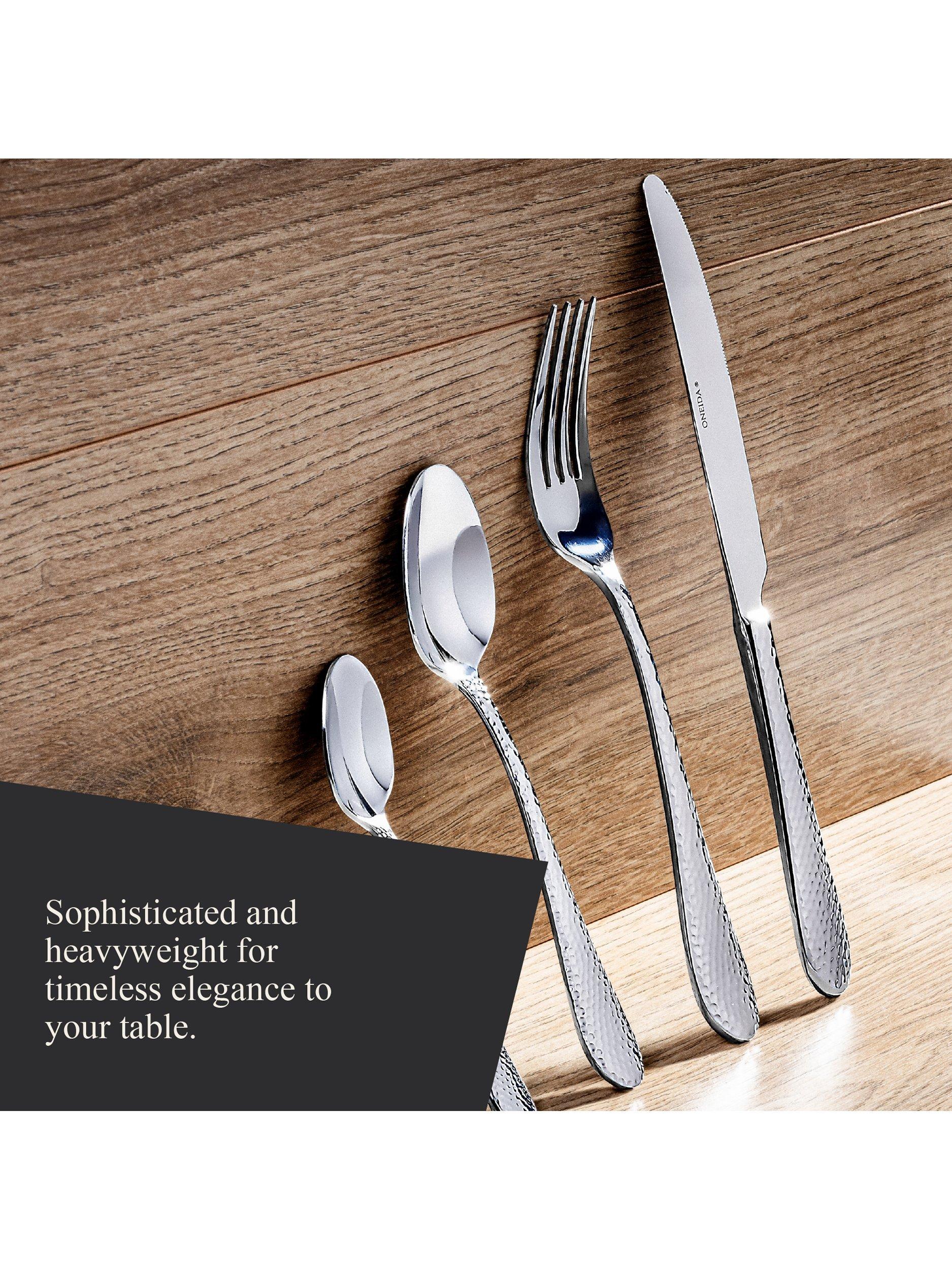 Artisan hand-crafted hammer finish flatware cutlery inspired by ancient Tibetan tranquillity. Oneida Tibet features softly rounded handles with a textured design finished with beautifully mirrored tips.