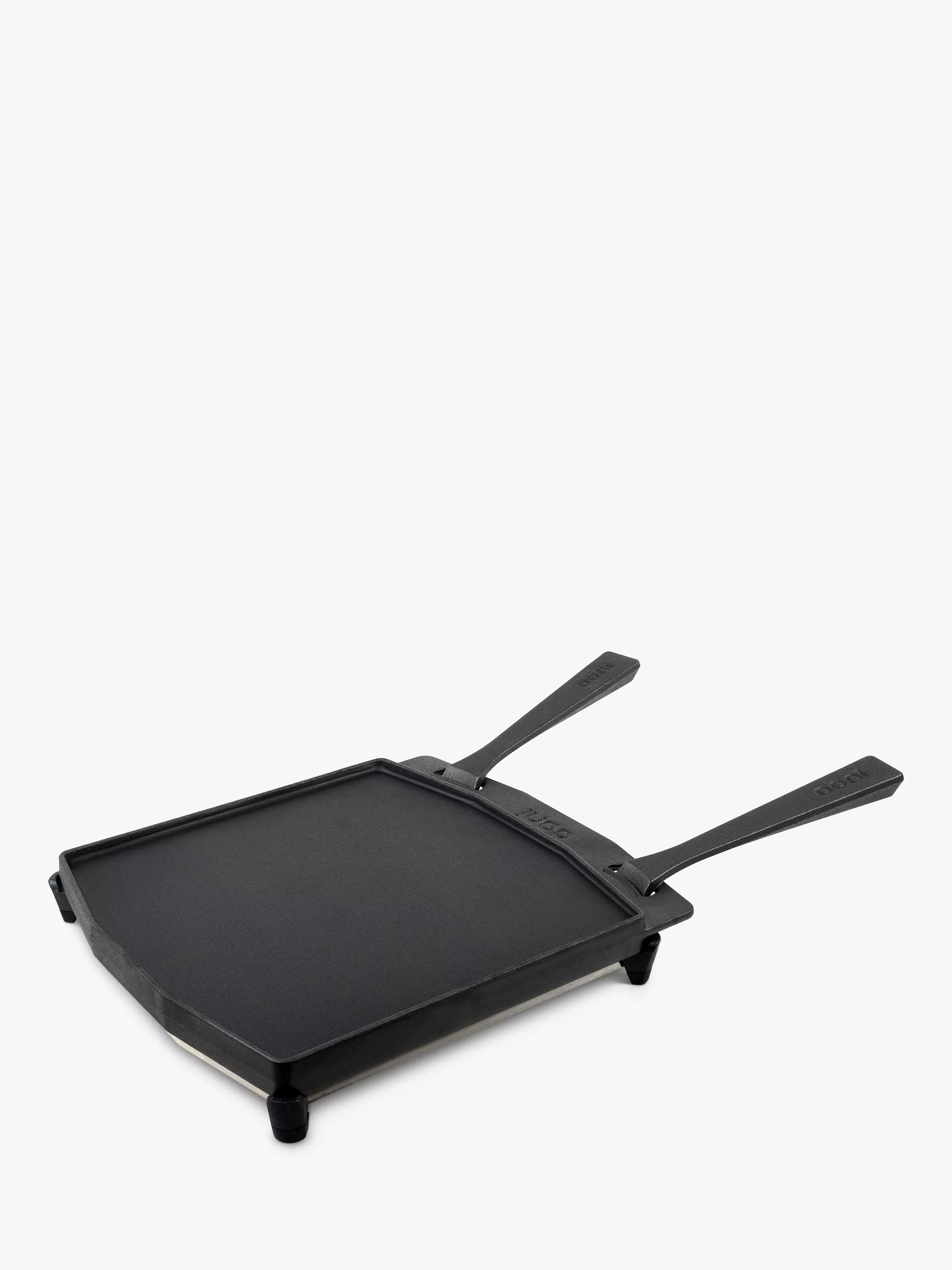 Dual-sided cast iron grizzler pan for your Ooni oven. Use the versatile smooth Sizzler side for fajitas or frying eggs, or flip the pan and use the Ooni Grizzler ribs for those tasty-looking seared grill marks on meats.