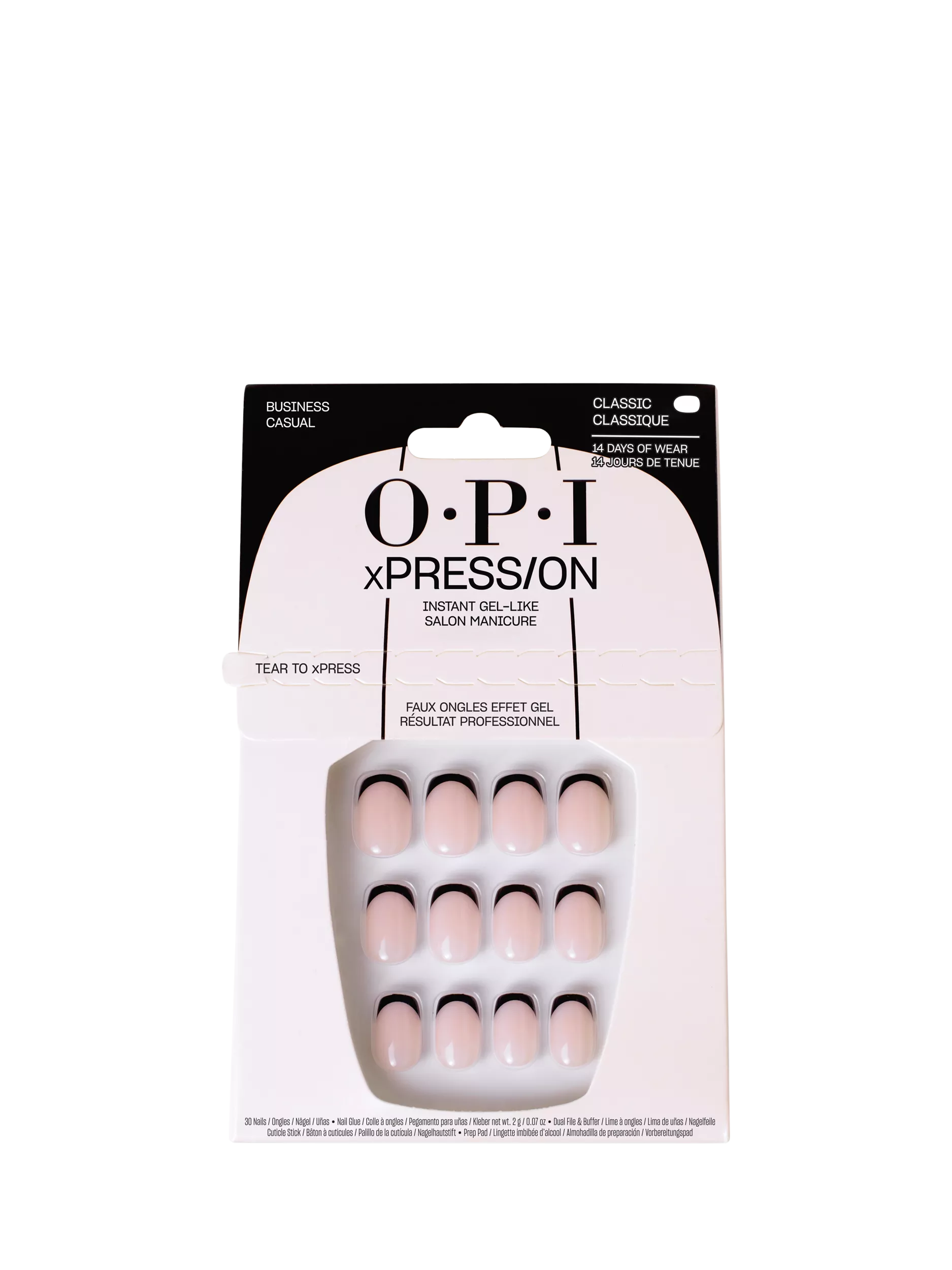 Each xPRESS/ON nail kit includes nail glue, a cuticle stick, a dual nail file and buffer, an OPI prep pad, and 30 nails in mani sizes to fit you perfectly.