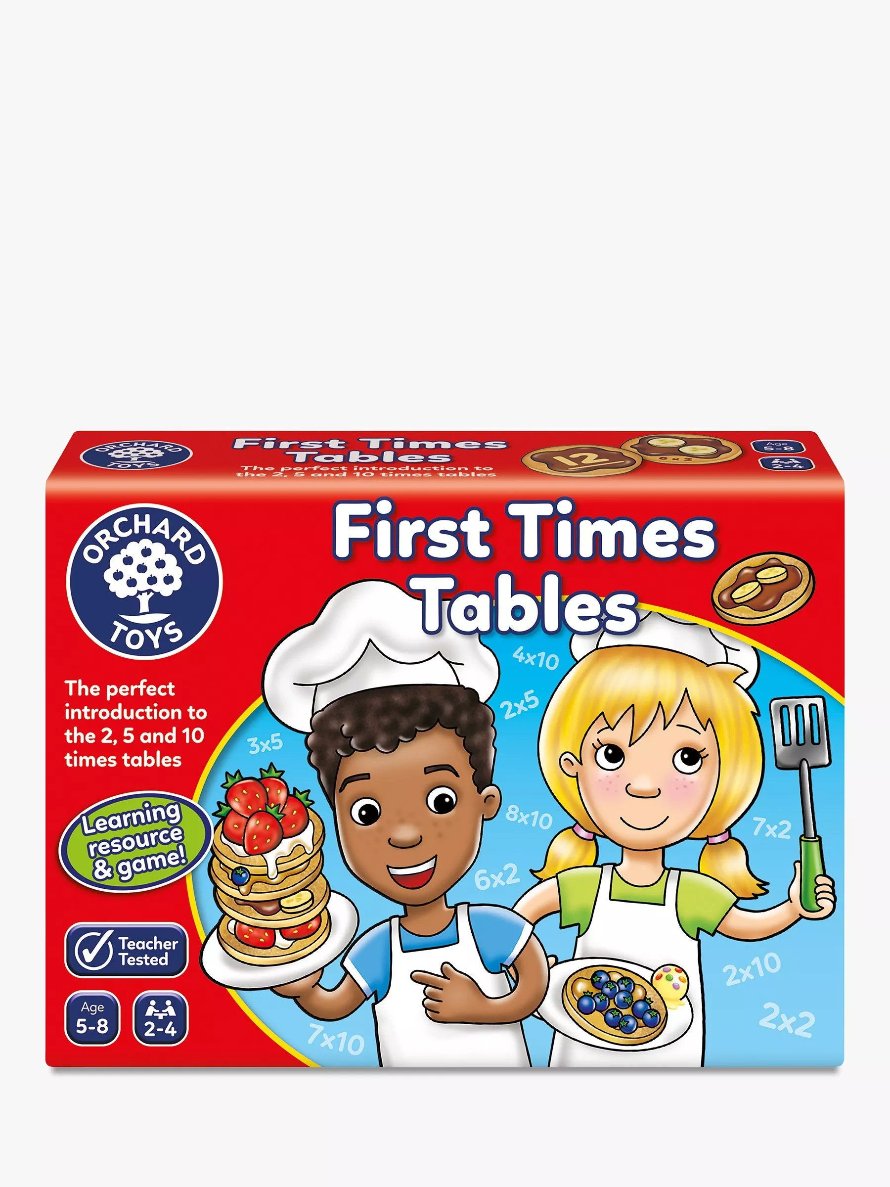 Introduce children to the concept of multiplication with First Times Tables. The elements of the game can be used by parents and teachers to help children understand the basics of multiplication and to help them grow in confidence. Once children have a basic understanding they can put their new skills to the test and play the fun pancake game as they race to get the most pancakes on their board!