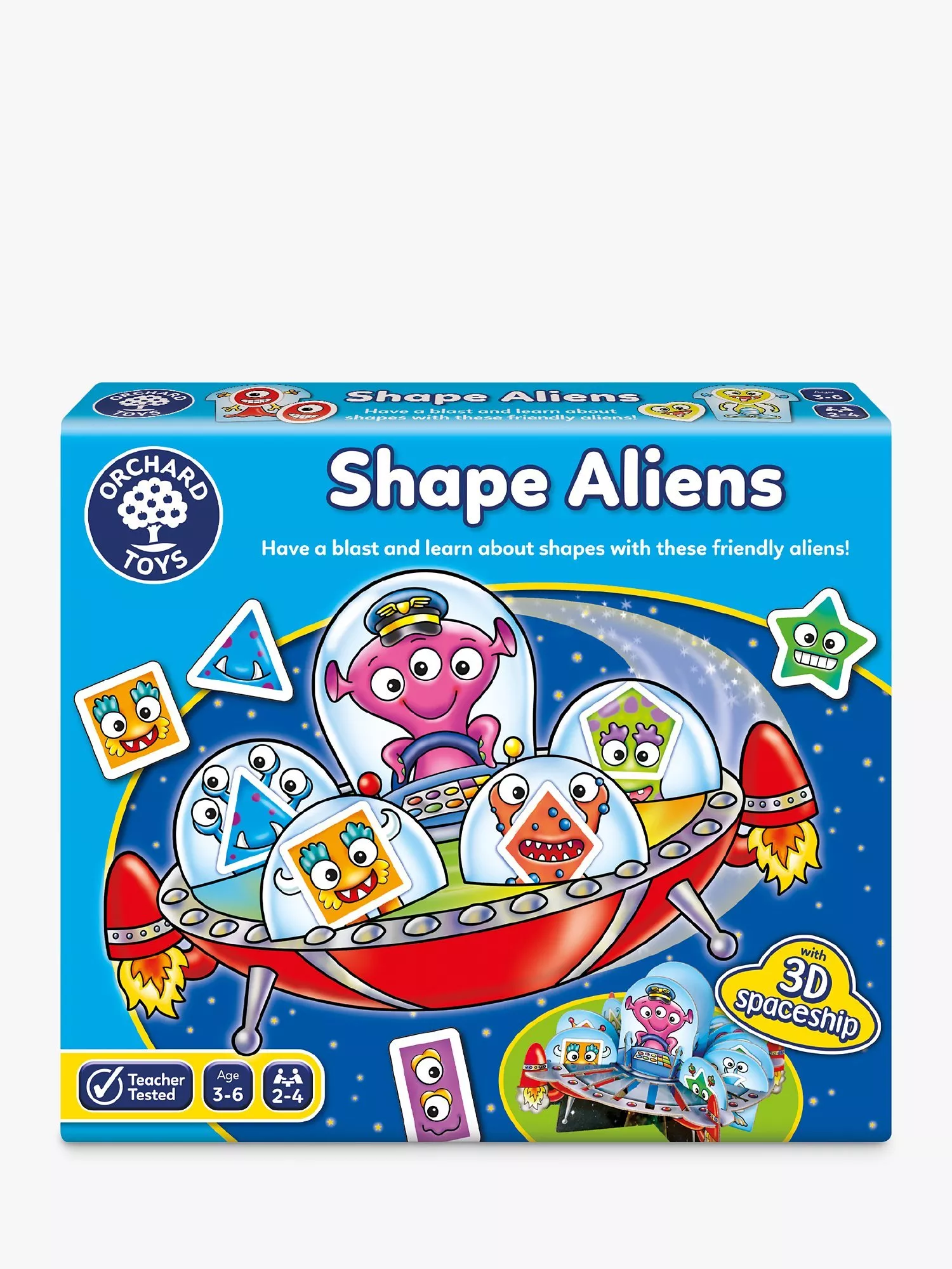 All aboard! Players take turns to match their shape cards to aliens. Once they've found a match, they launch their alien onboard the 3D spaceship ready for blast off! The winner is the first person to match all their shapes.