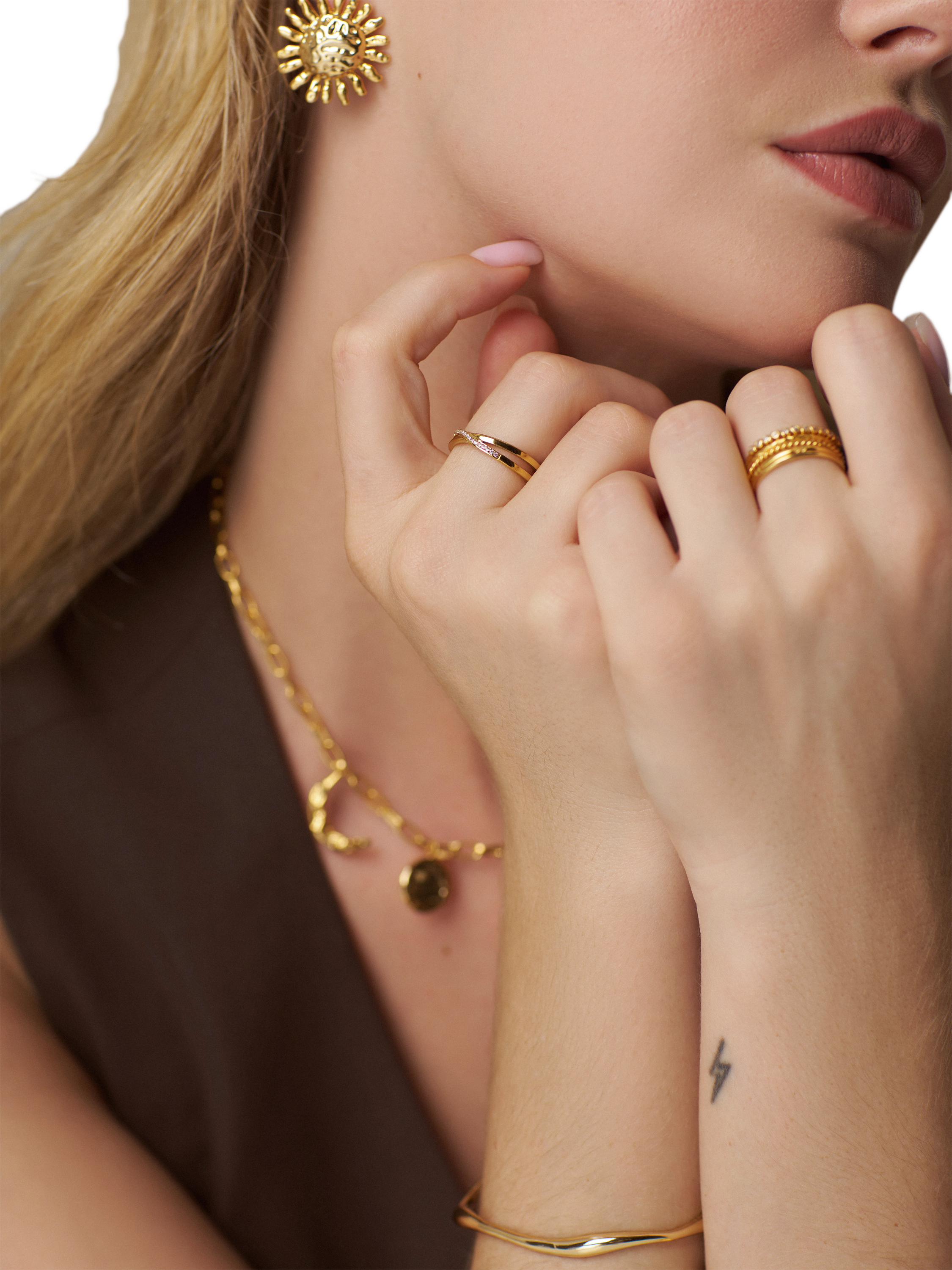 A unique ring from Orelis, showcasing a crossover design and pave detailing. This piece is plated in 18ct gold.