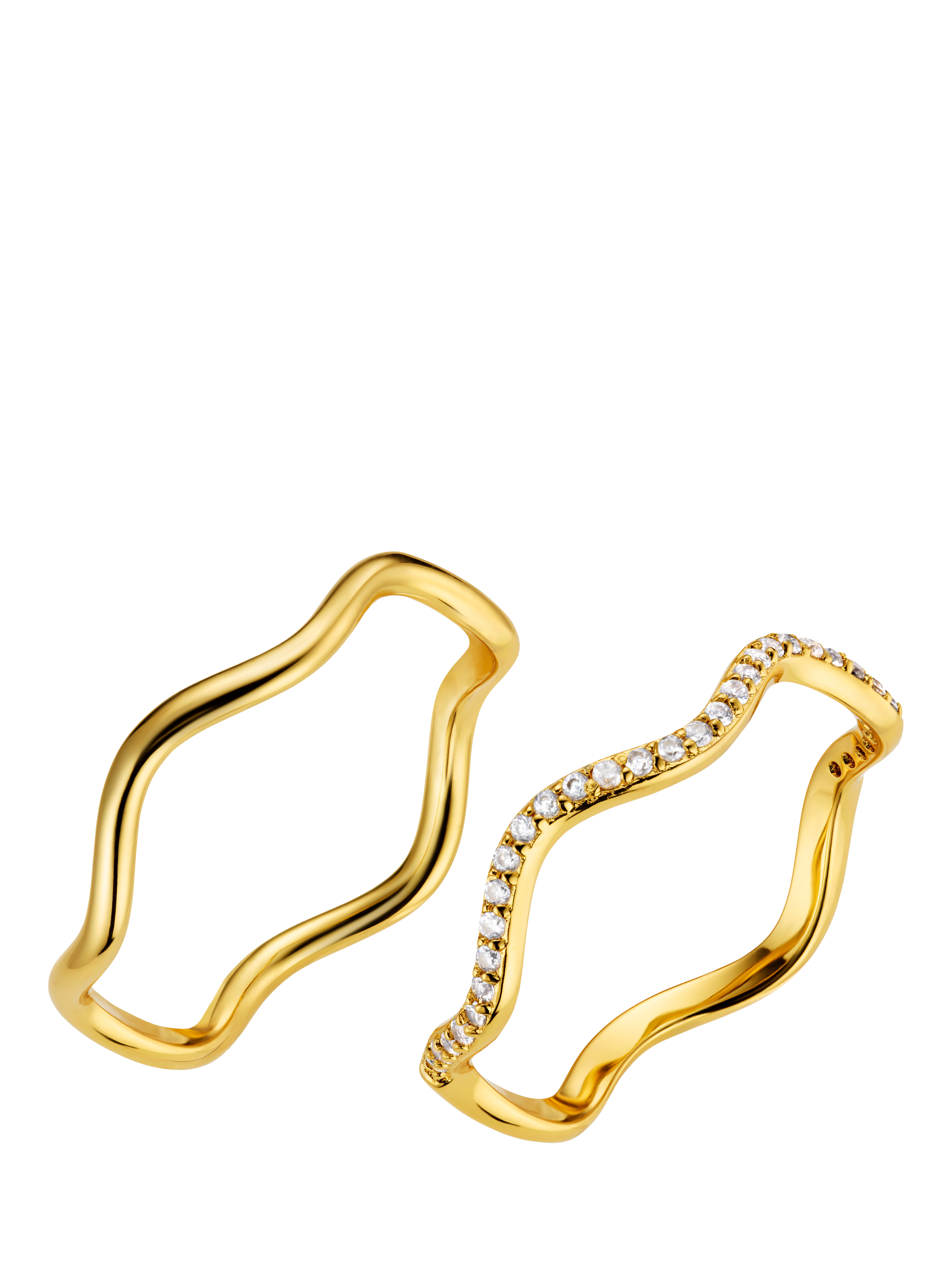 A pair of two rings for stacking - one with a smooth wave shape, and the other a pave wave design. This jewellery is plated in 18k gold.