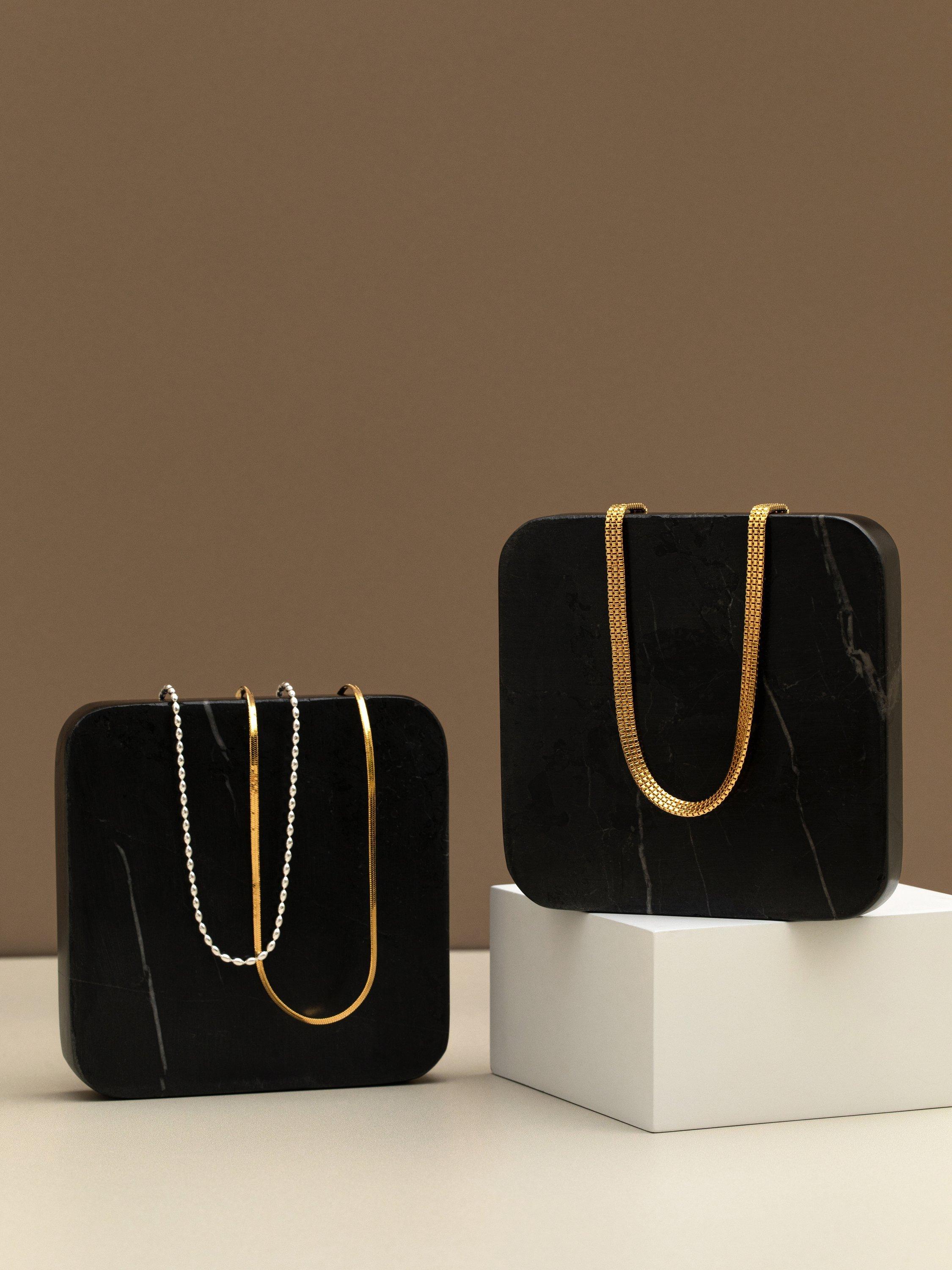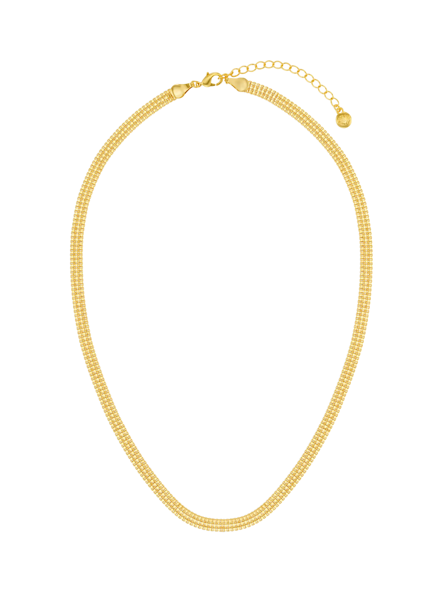 A flat box chain style necklace with a lobster clasp. This jewellery is plated in 18k gold.