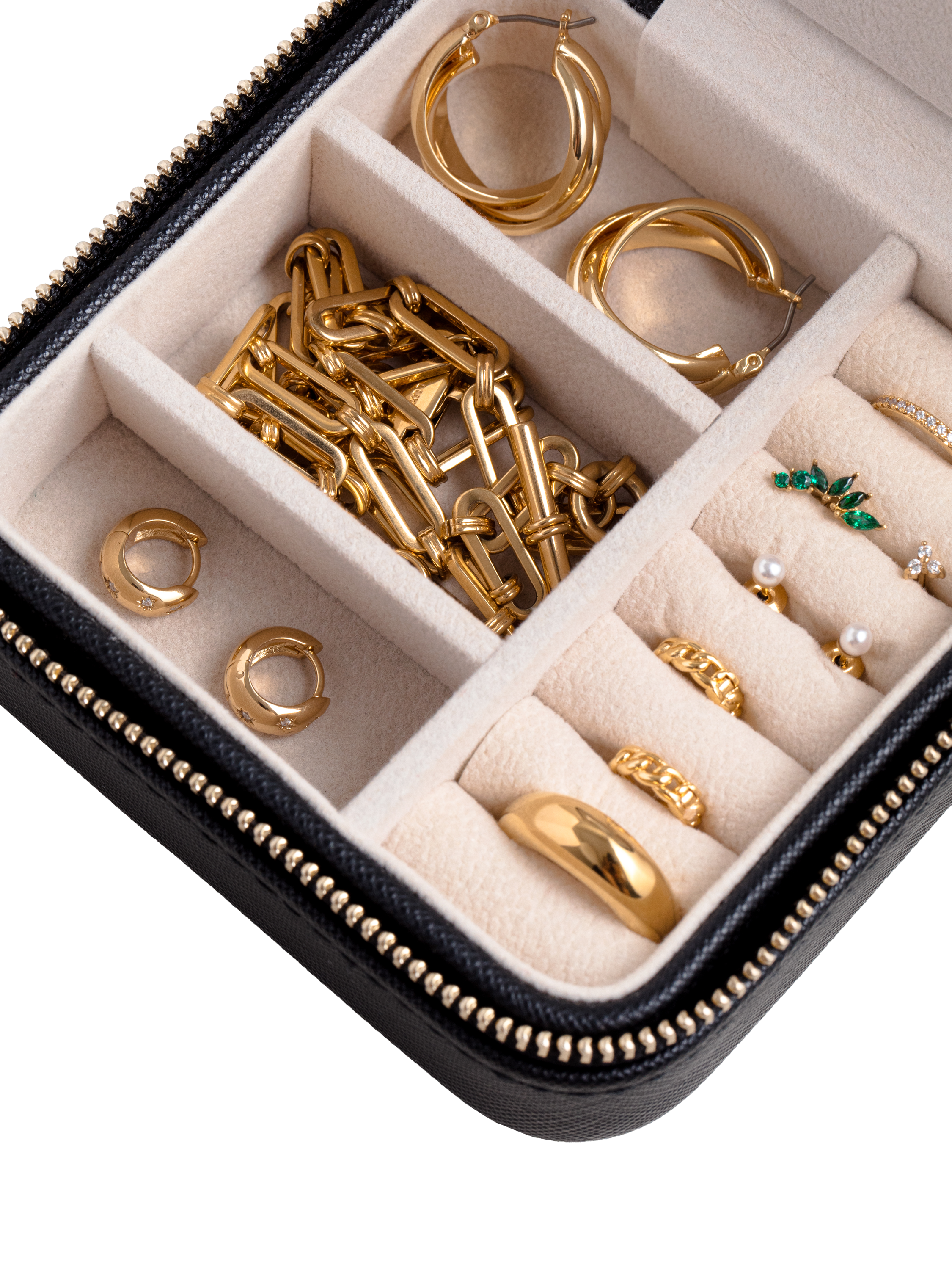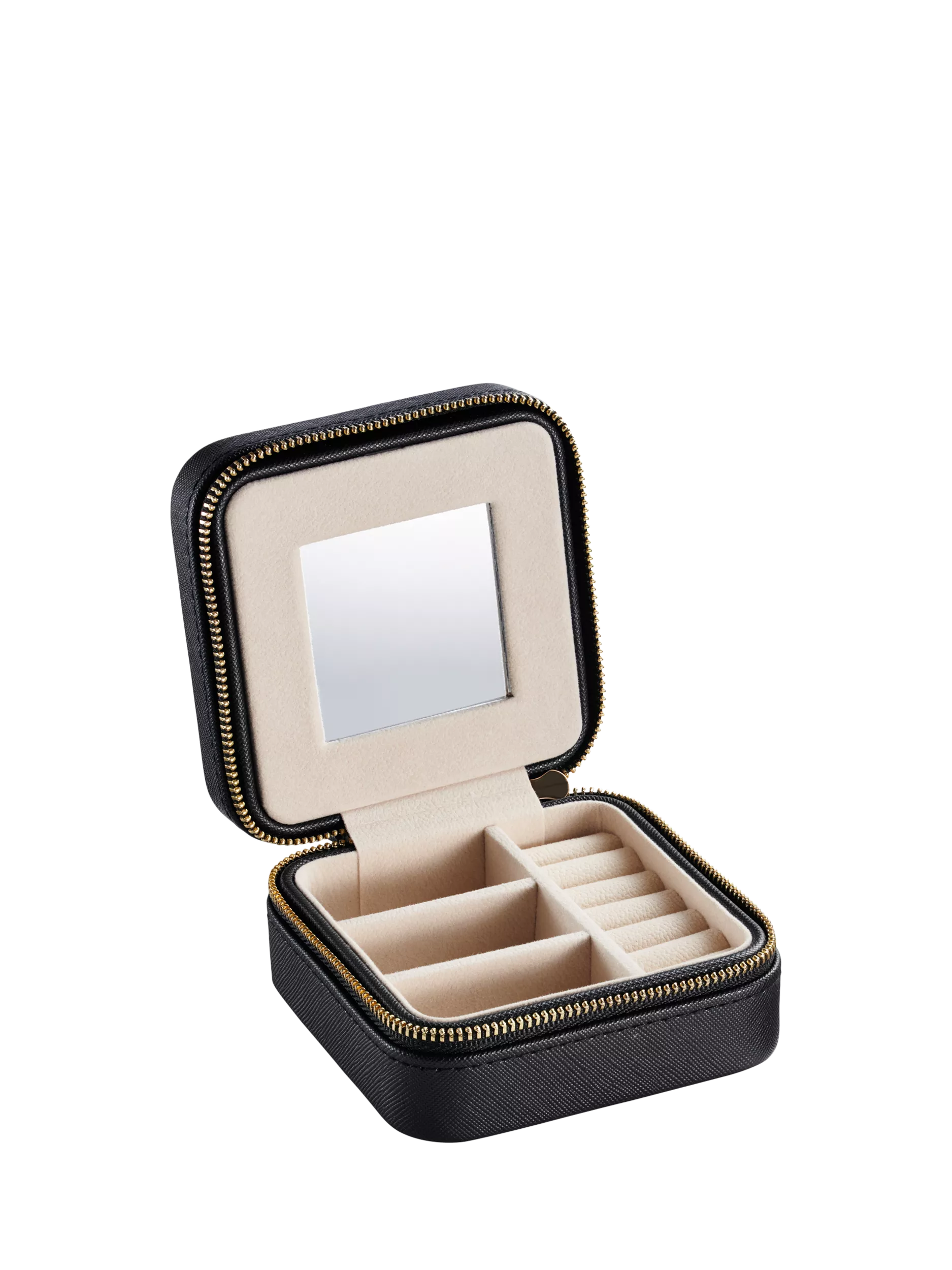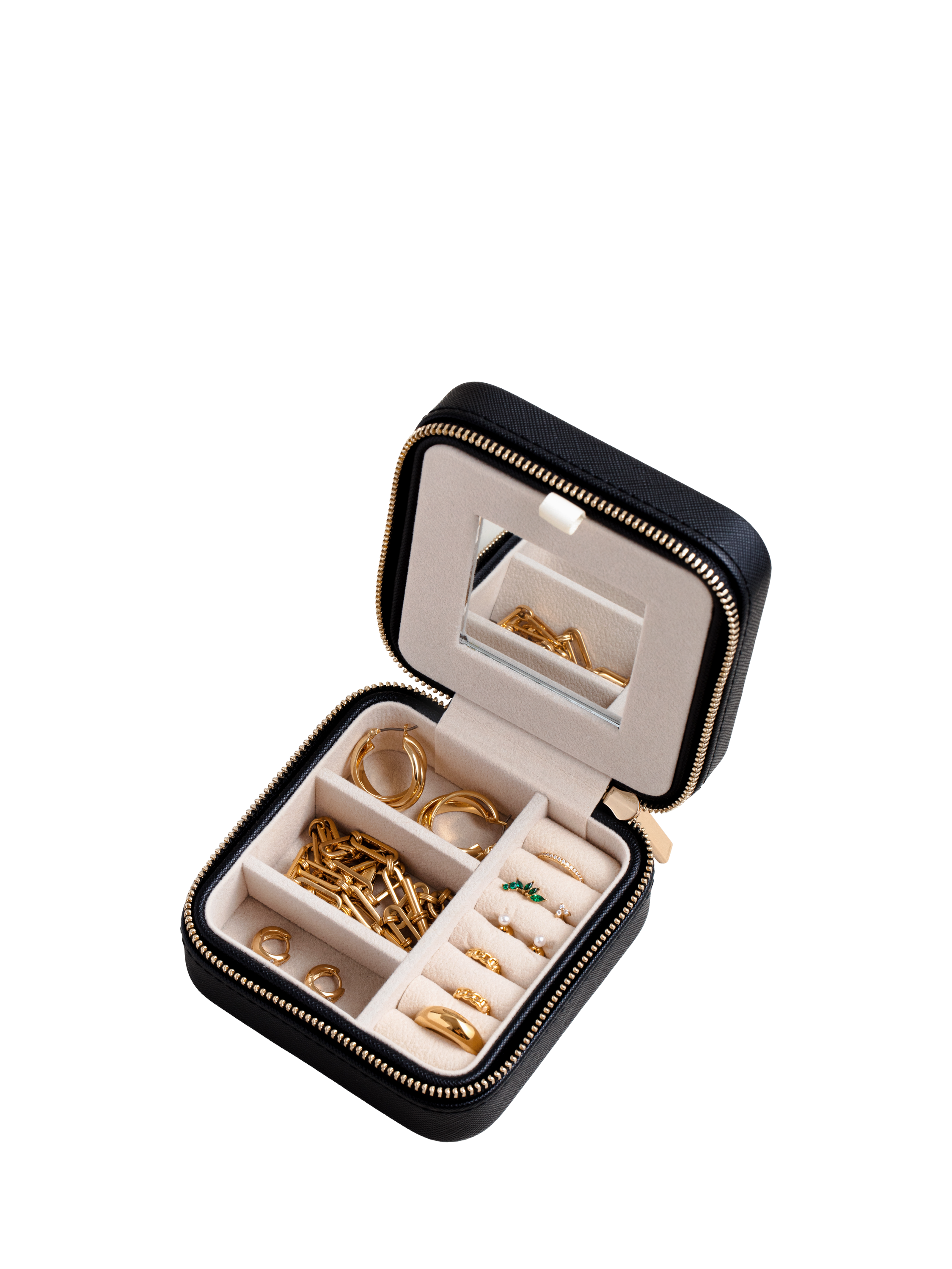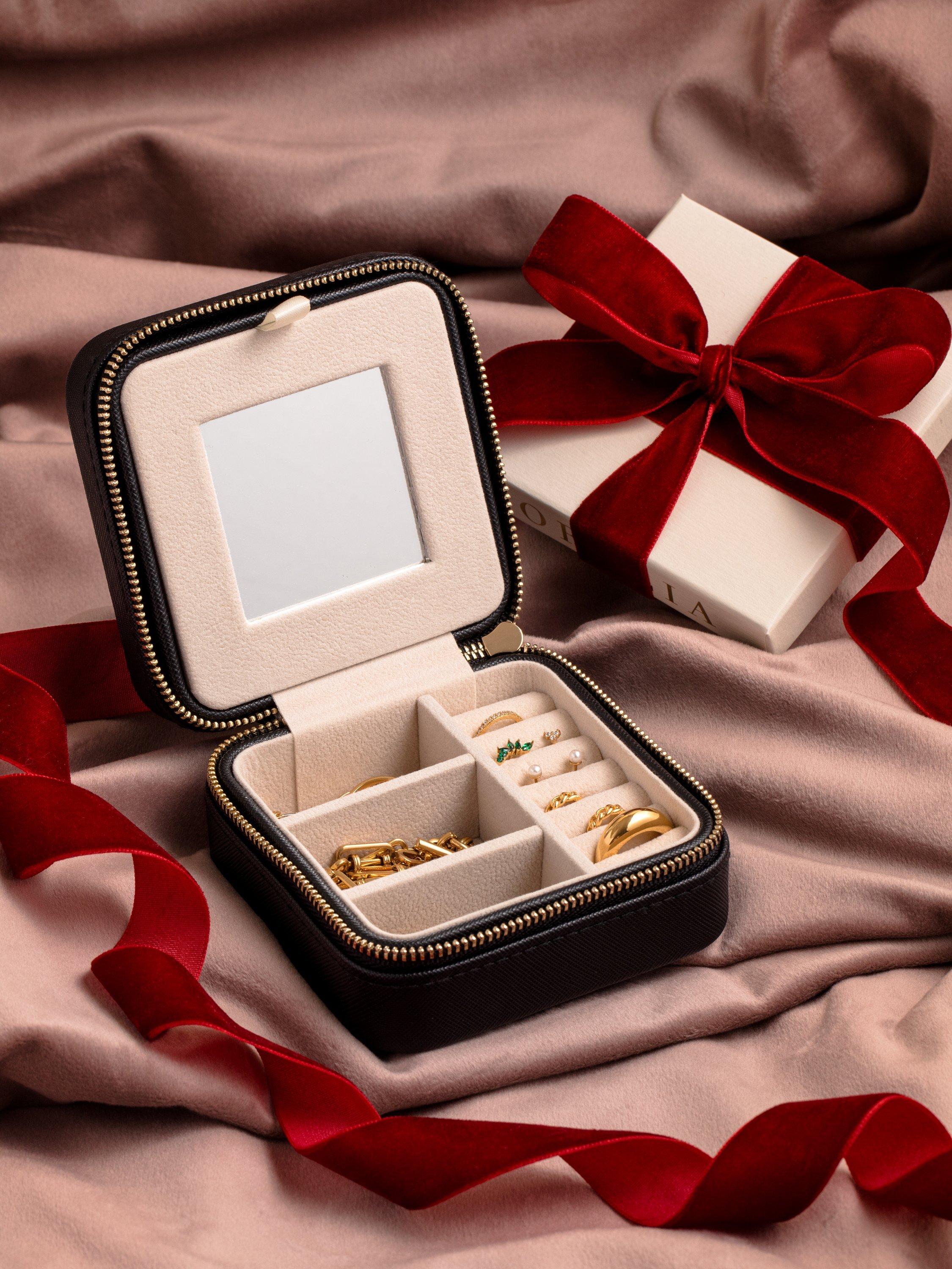 This jewellery box is a wallet size and zips open with separate compartments to hold rings, bracelets, necklaces, earrings, and more.