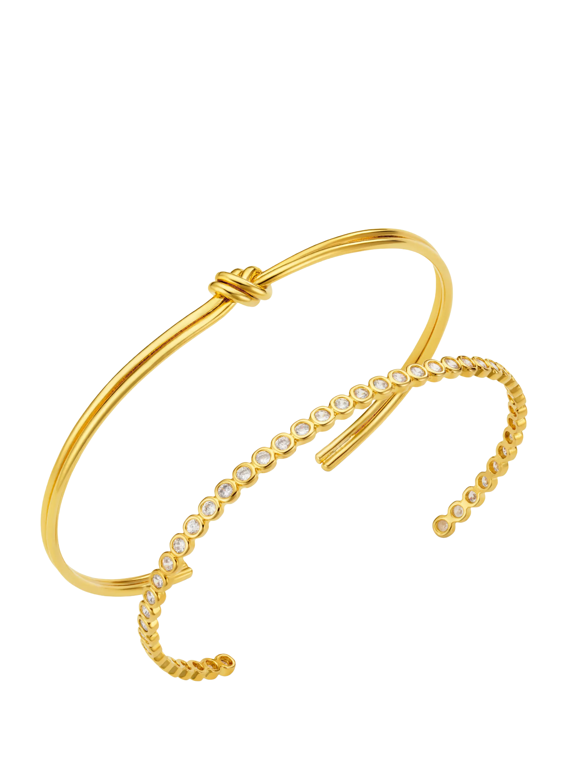 A set of two bracelets perfect for achieving a layered look. One features a linear knot, and the other is set with sparkling crystals.