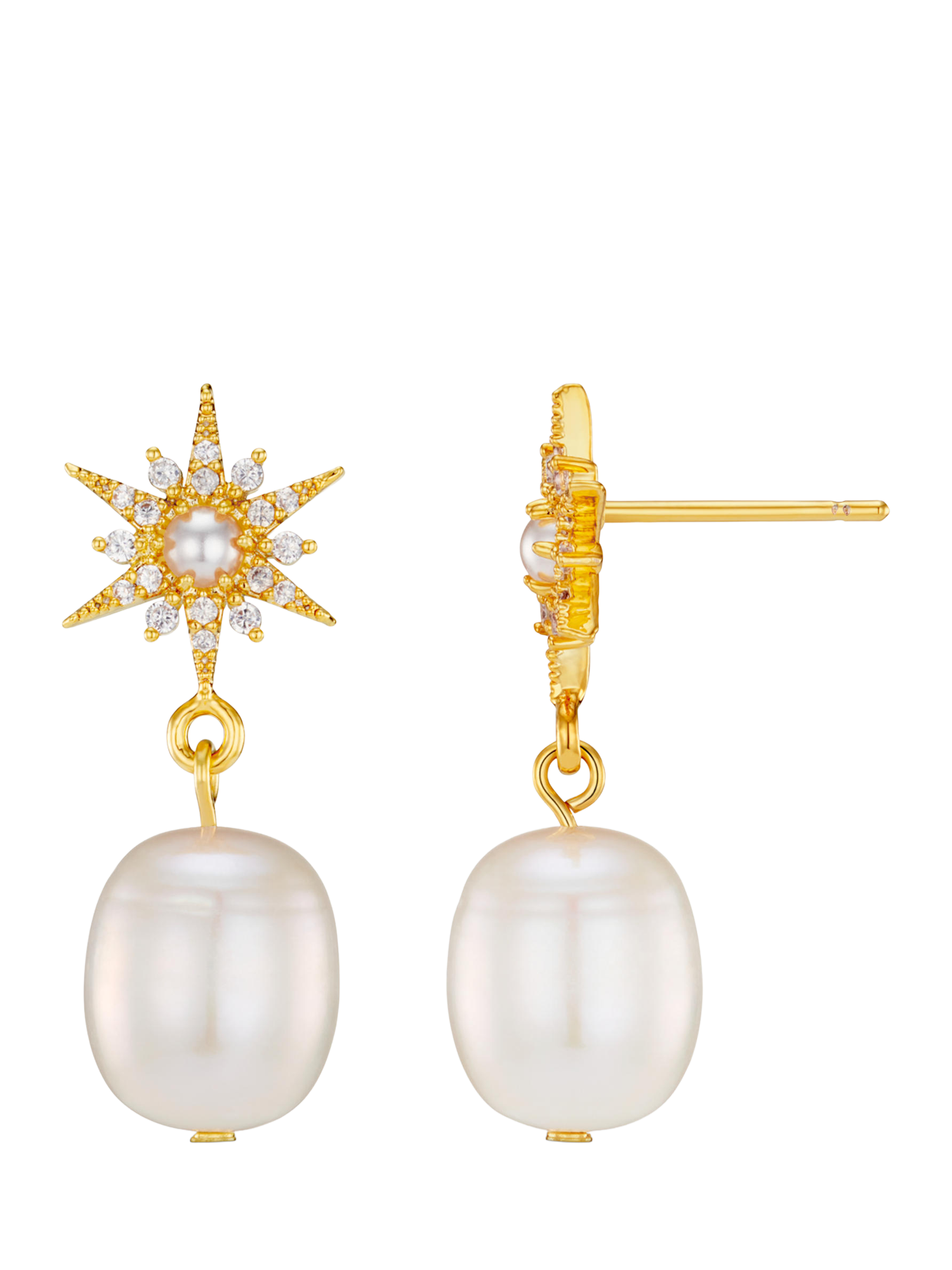 A gorgeous starburst stud earring from Orelia, showcasing a freshwater pearl drop. Crafted in 18ct gold plating. Suitable for pierced ears only.