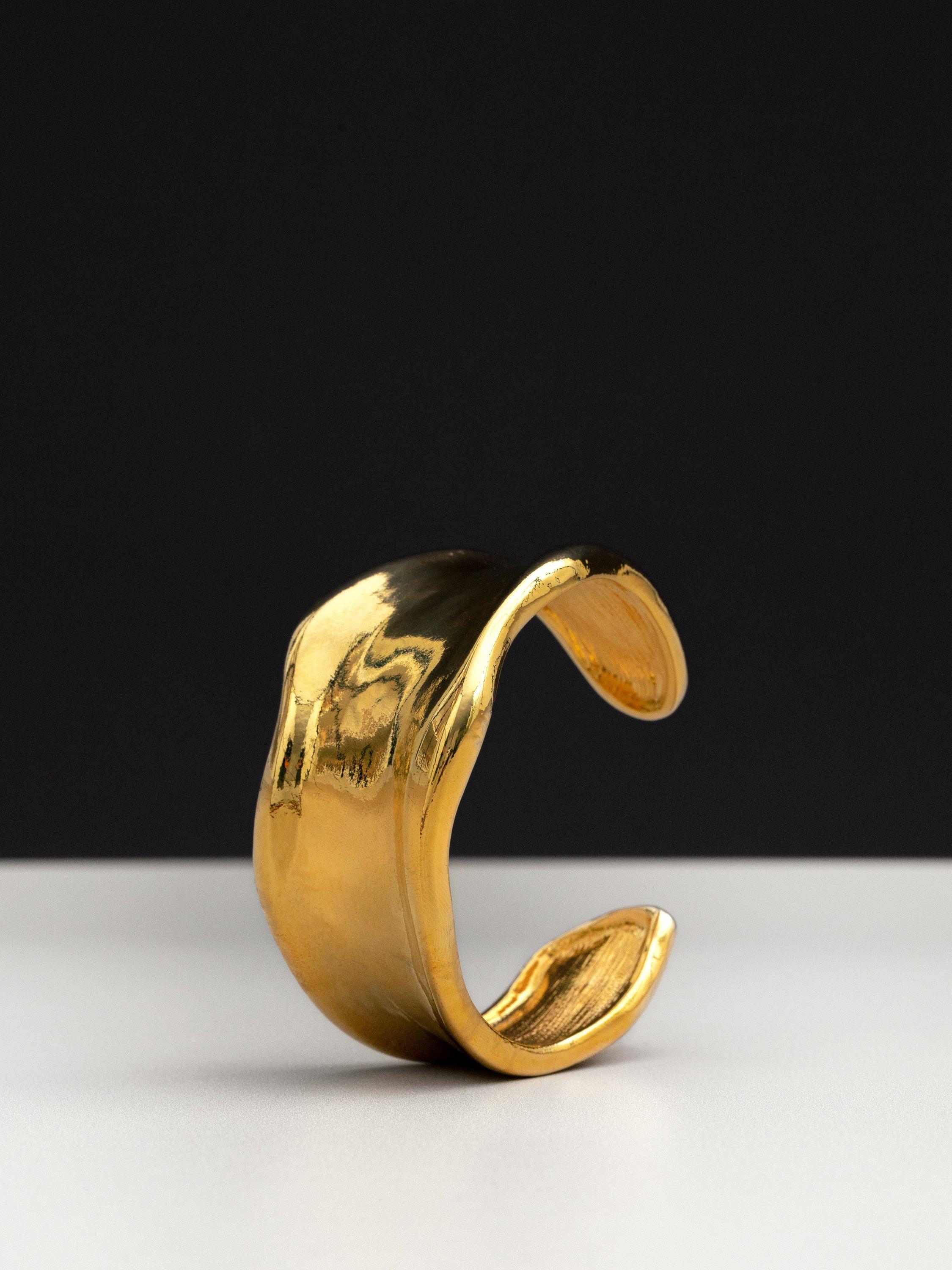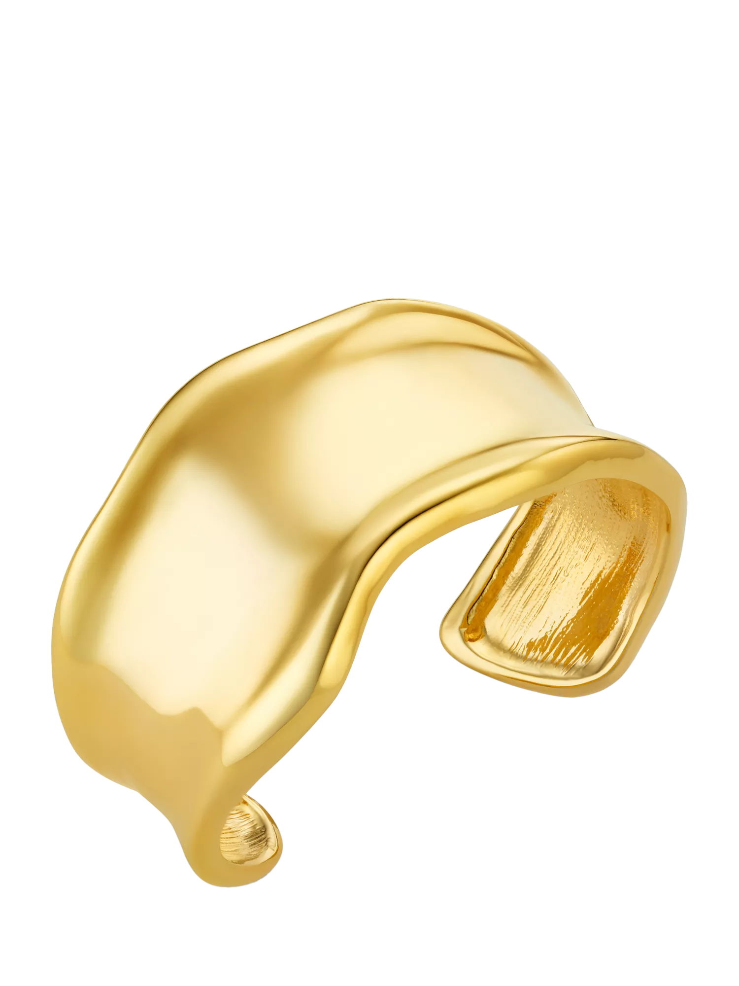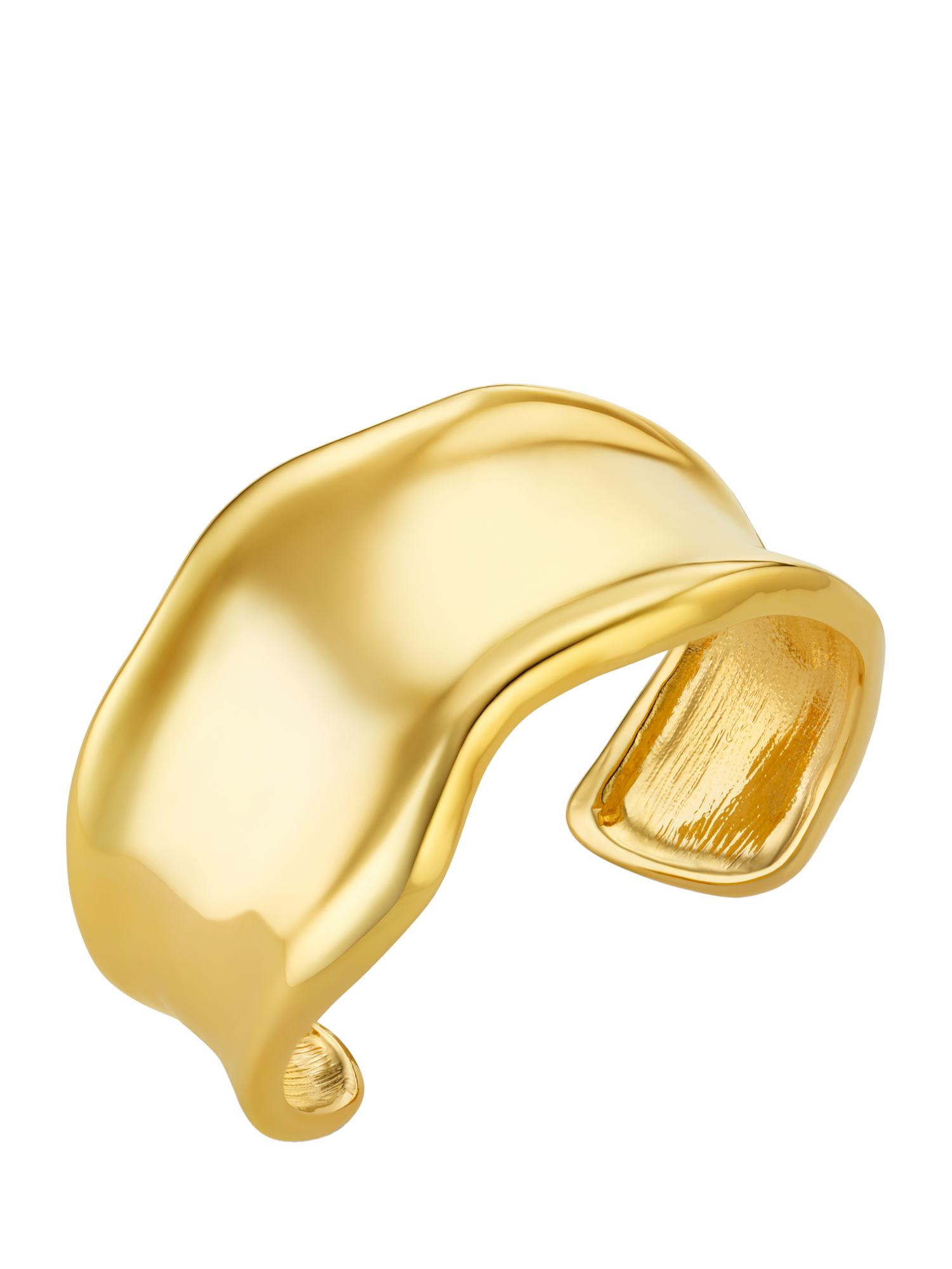 This cuff bracelet has an organic, molten metal texture. This jewellery is plated in 18k gold.