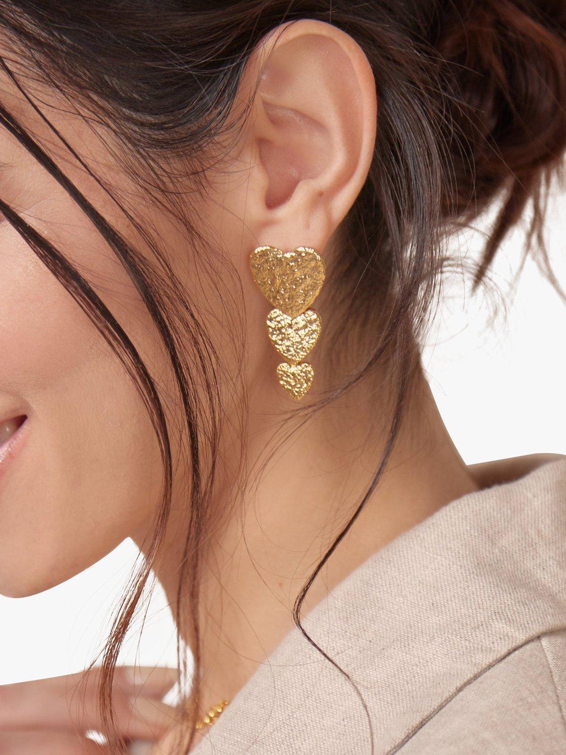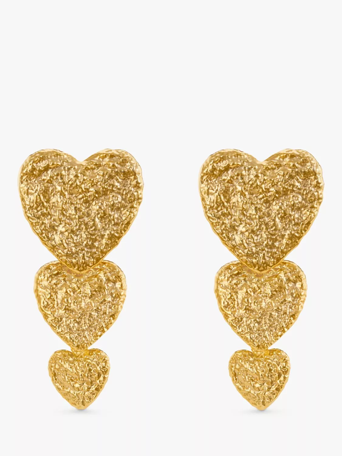 Large gold-plated three textured heart drop earrings. Stud fastening.