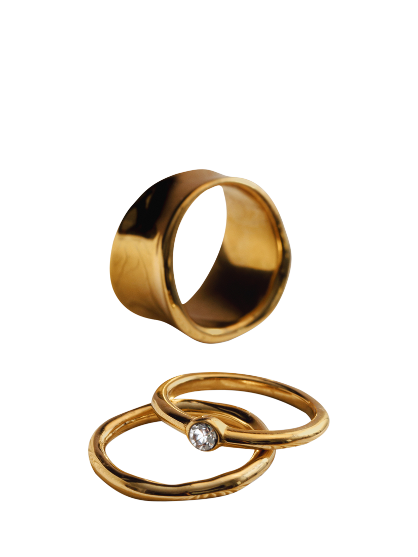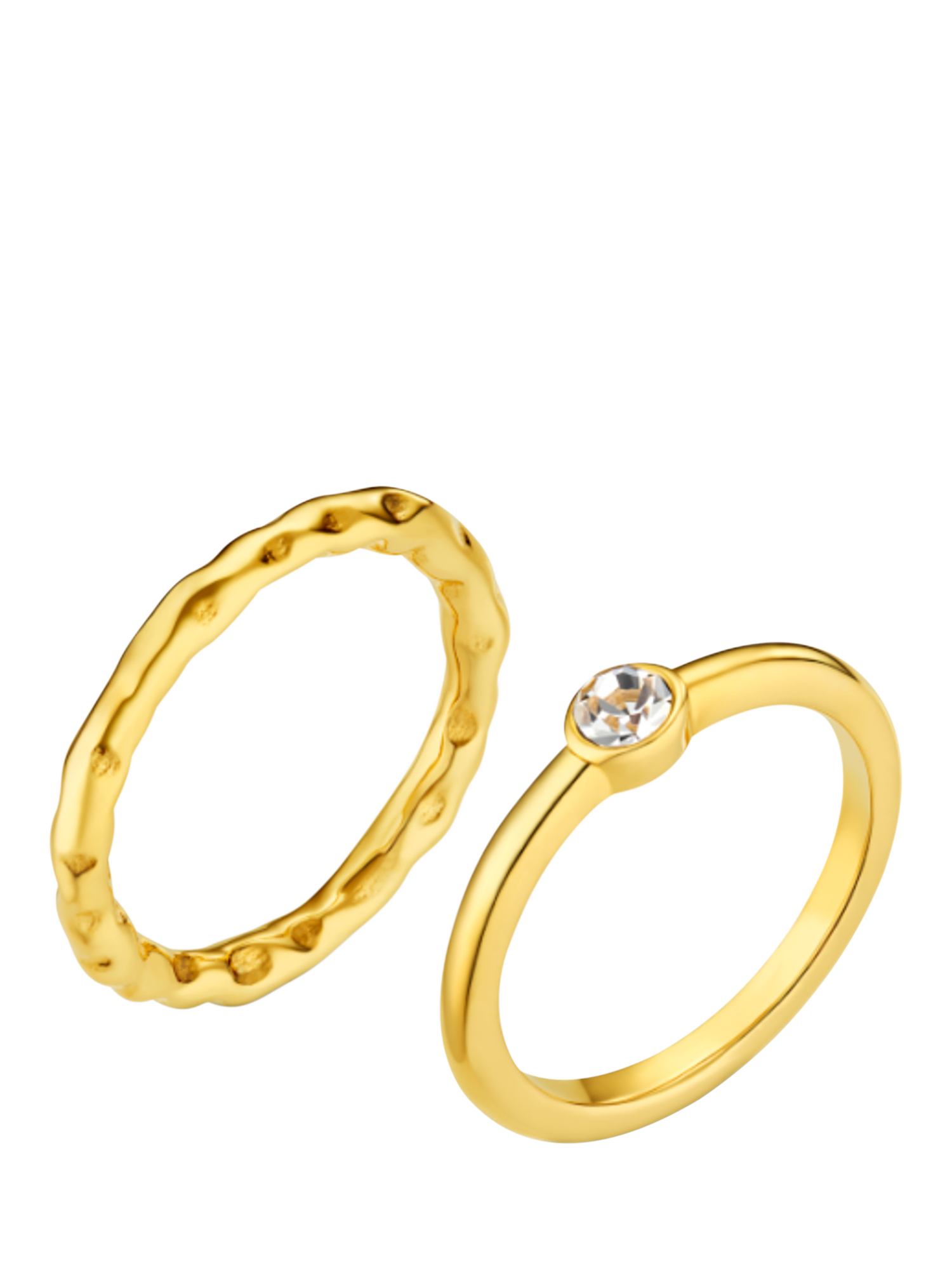 Waterproof LUXE Crystal Ring from Orelia, plated in 18ct gold. One ring features a textured molten effect, while the other showcases a sparkling cubic zirconia crystal. Pack of two rings. Size is Small/Medium.