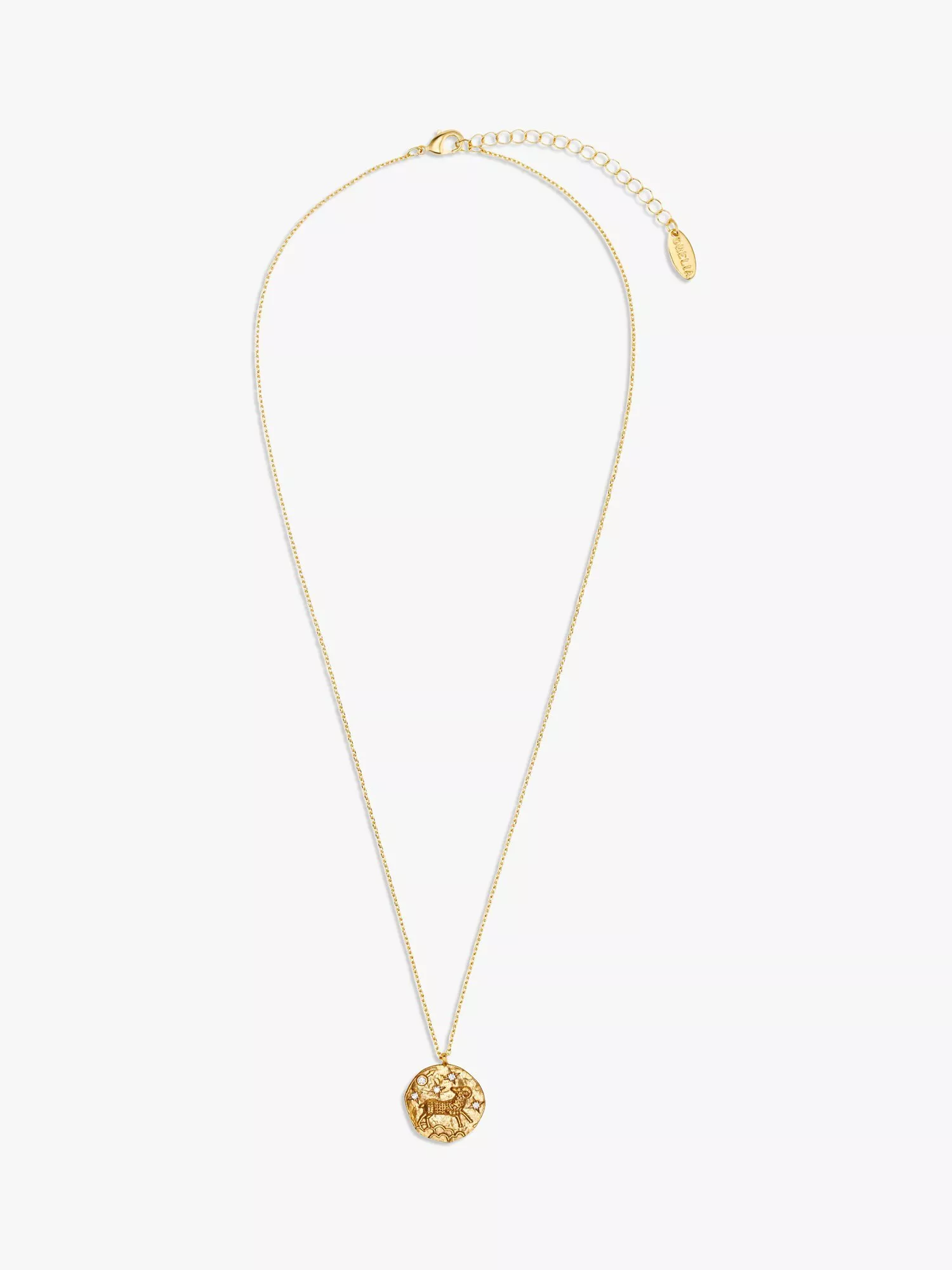 A classic gold chain, holding an intricately engraved disc with your chosen zodiac sign symbol and sparkling crystal details.