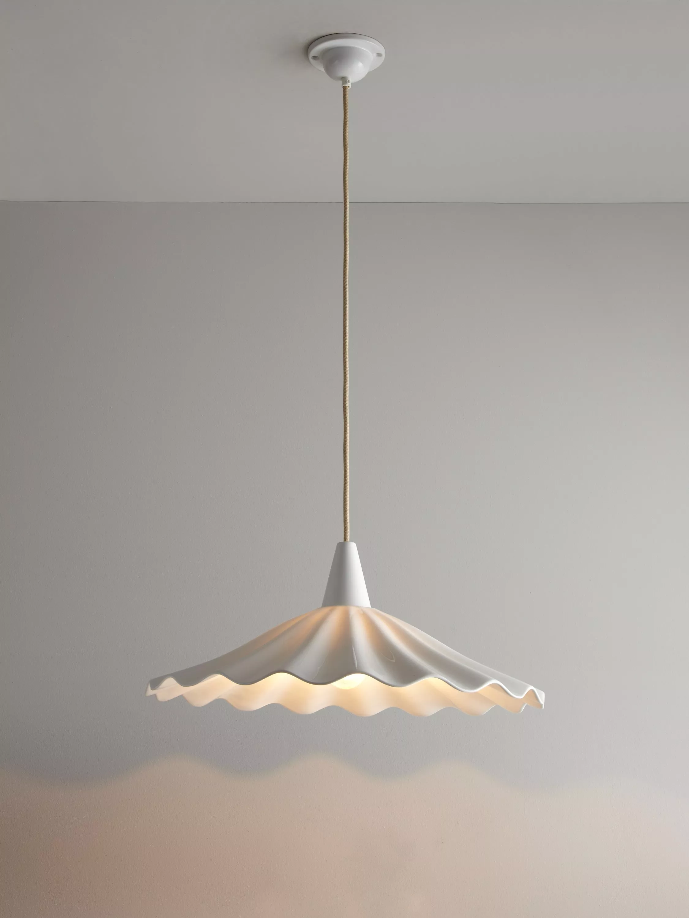 An exquisitely handcrafted bone china light with a shade inspired by rolling ocean waves. Bone china has been expertly moulded to create this eye-catching Christie light. The brand's trademark sand and taupe braided cable and bone china ceiling rose finish the design off beautifully.