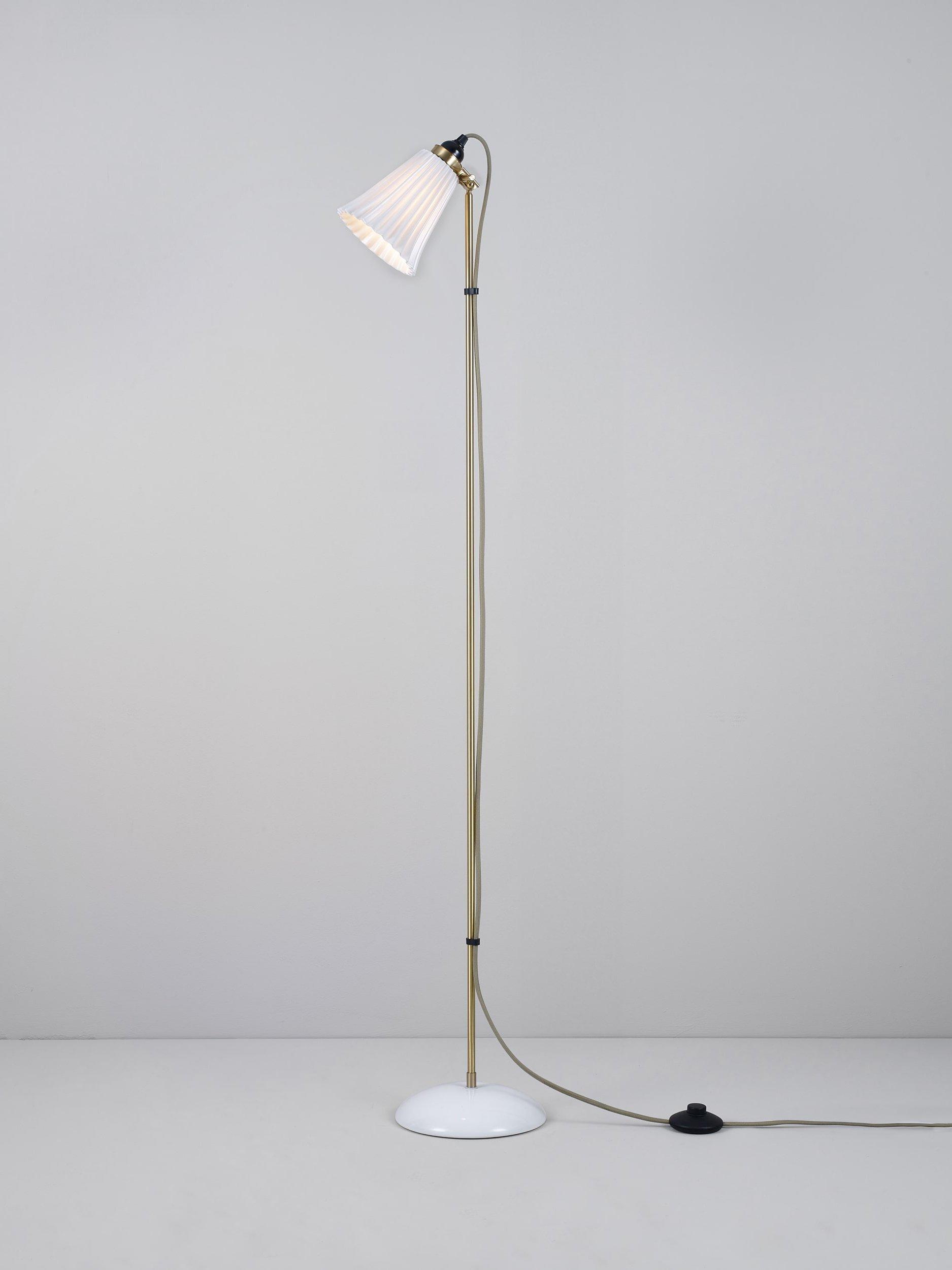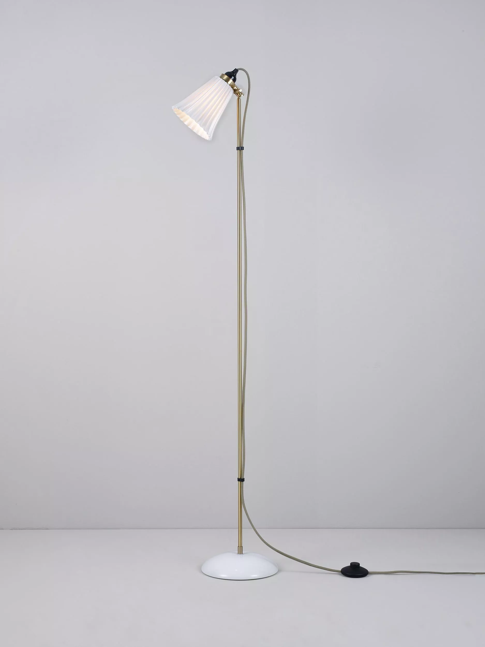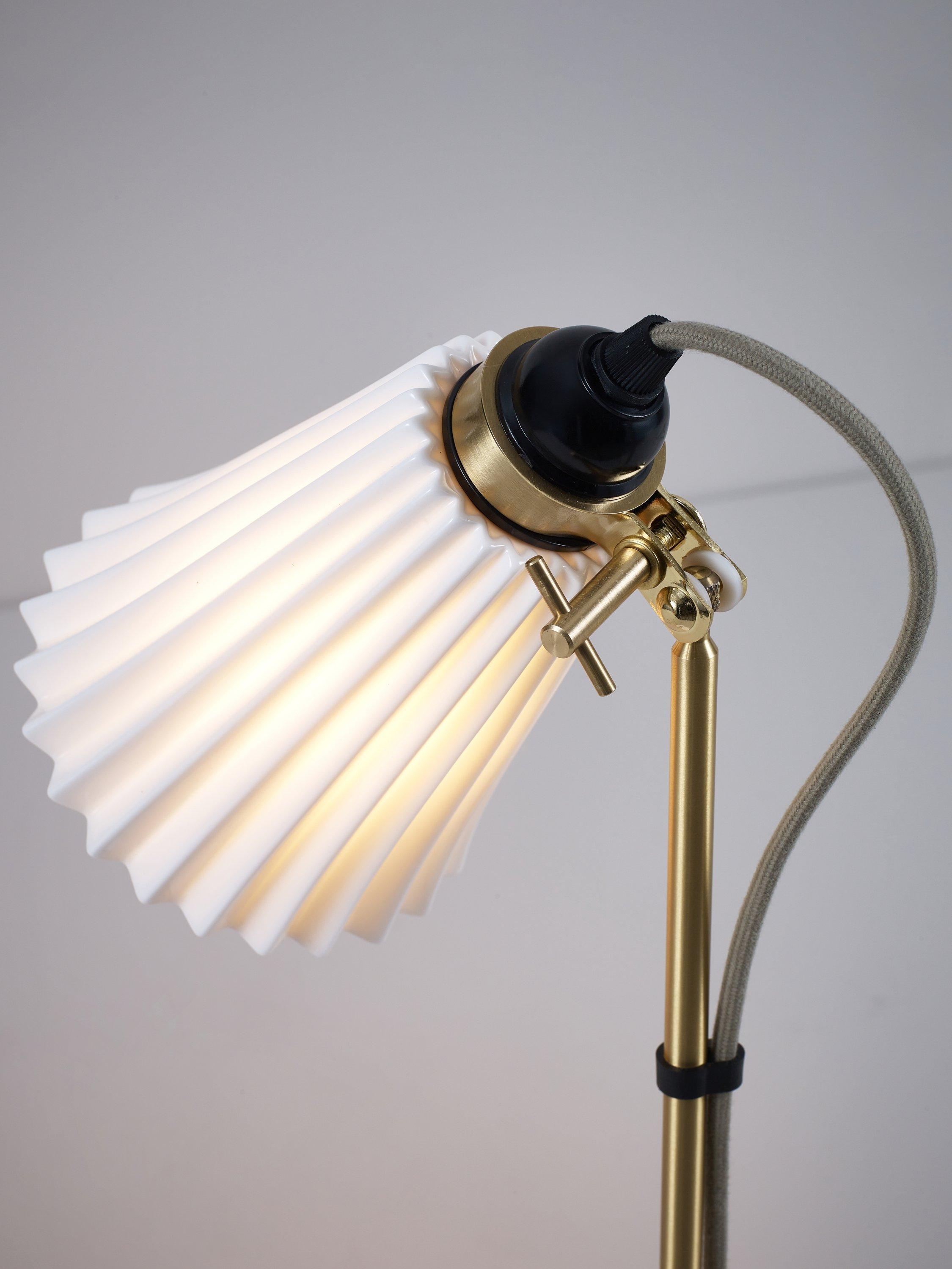 The handmade Hector floor lamp with its iconic pleated shade exudes elegance, while the glossy bone china finish is gracefully complemented by the satin brass detailing. With its adjustable clamp, you can direct the light precisely where it's desired. The design is enhanced by a cotton braided cable in a calm grey hue. Ideal for seating corners or beside a desk.