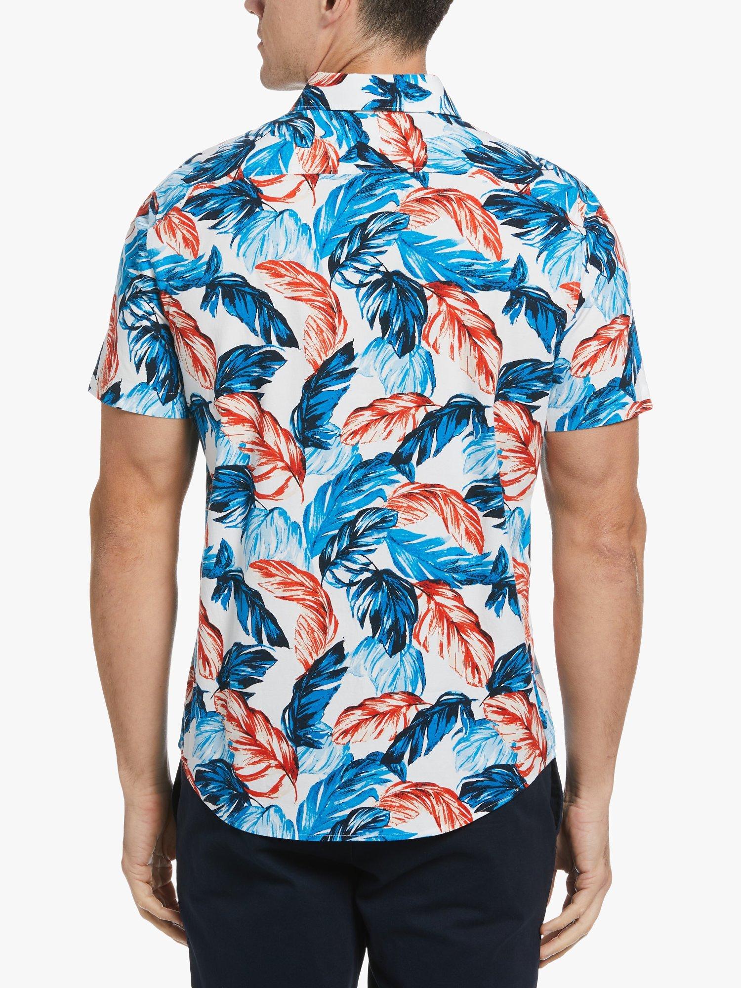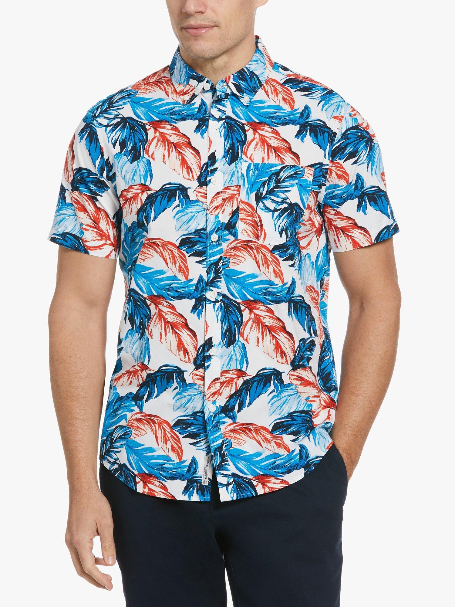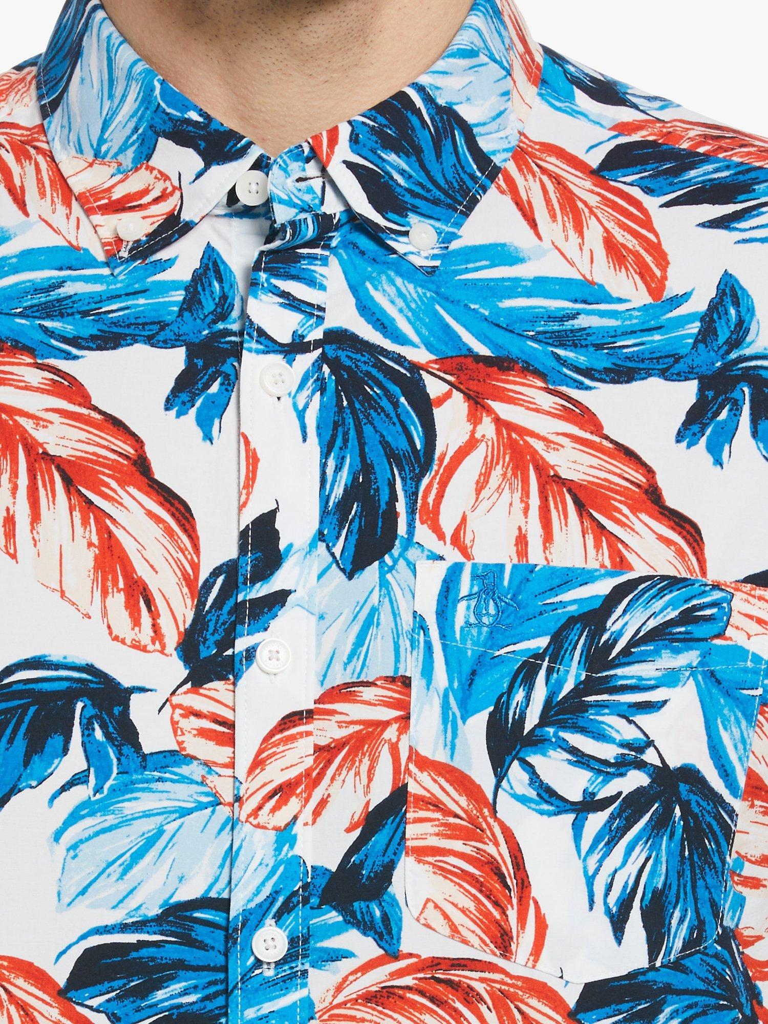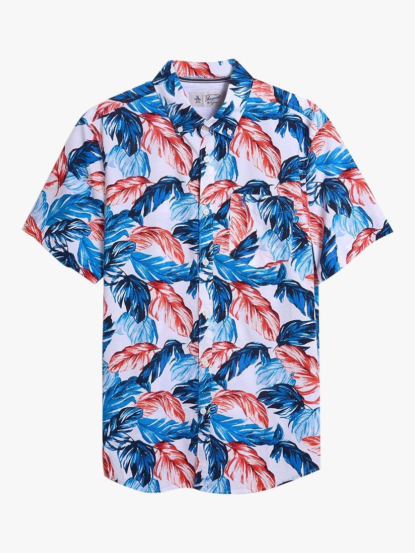 Cut from a light and breezy cotton blend, this shirt from Original Penguin takes note from vintage Hawaiian styles with its all-over leaf print and comes in a classic silhouette that's light enough for layering.
