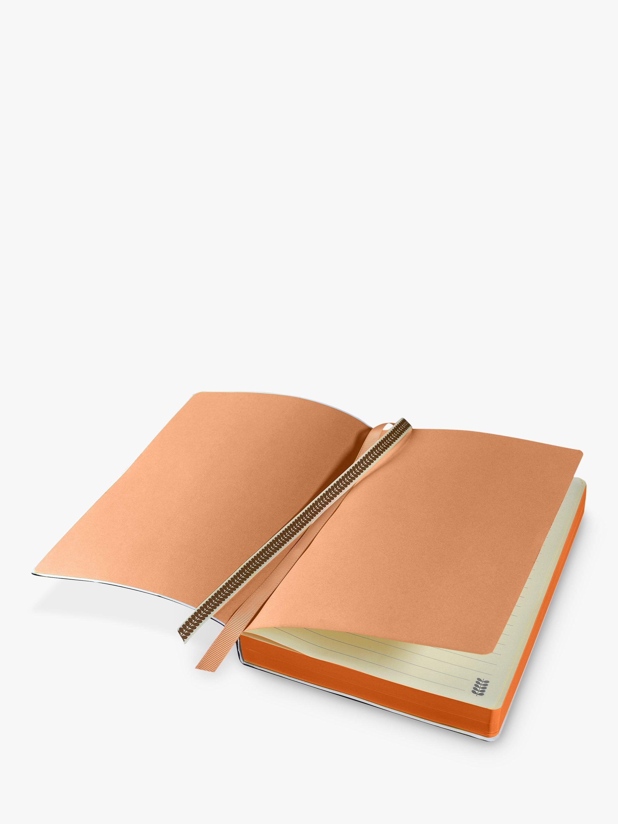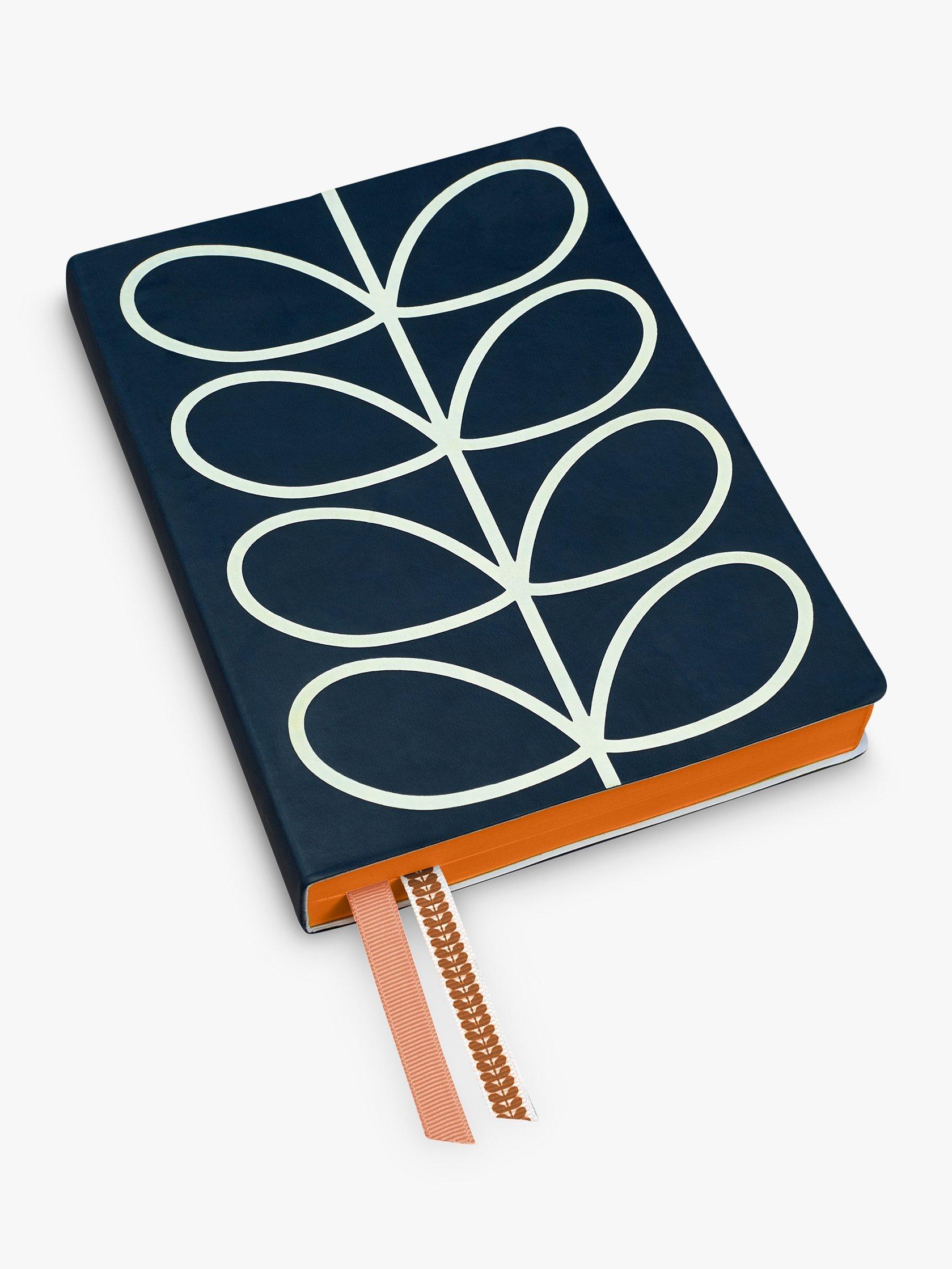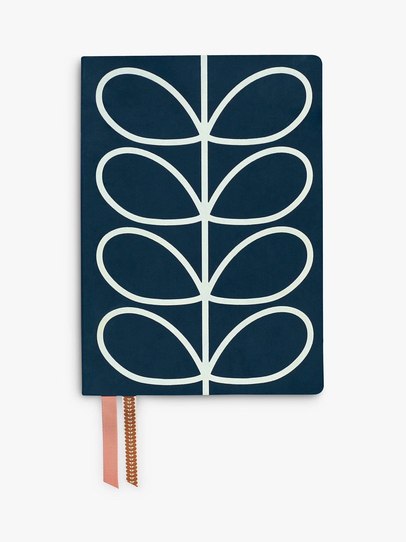 A stylish A5 notebook with Orla Kiely's Linear Stem Navy print, featuring coloured edged pages, elastic and button closure and two ribbon page markers. 384 lined pages.