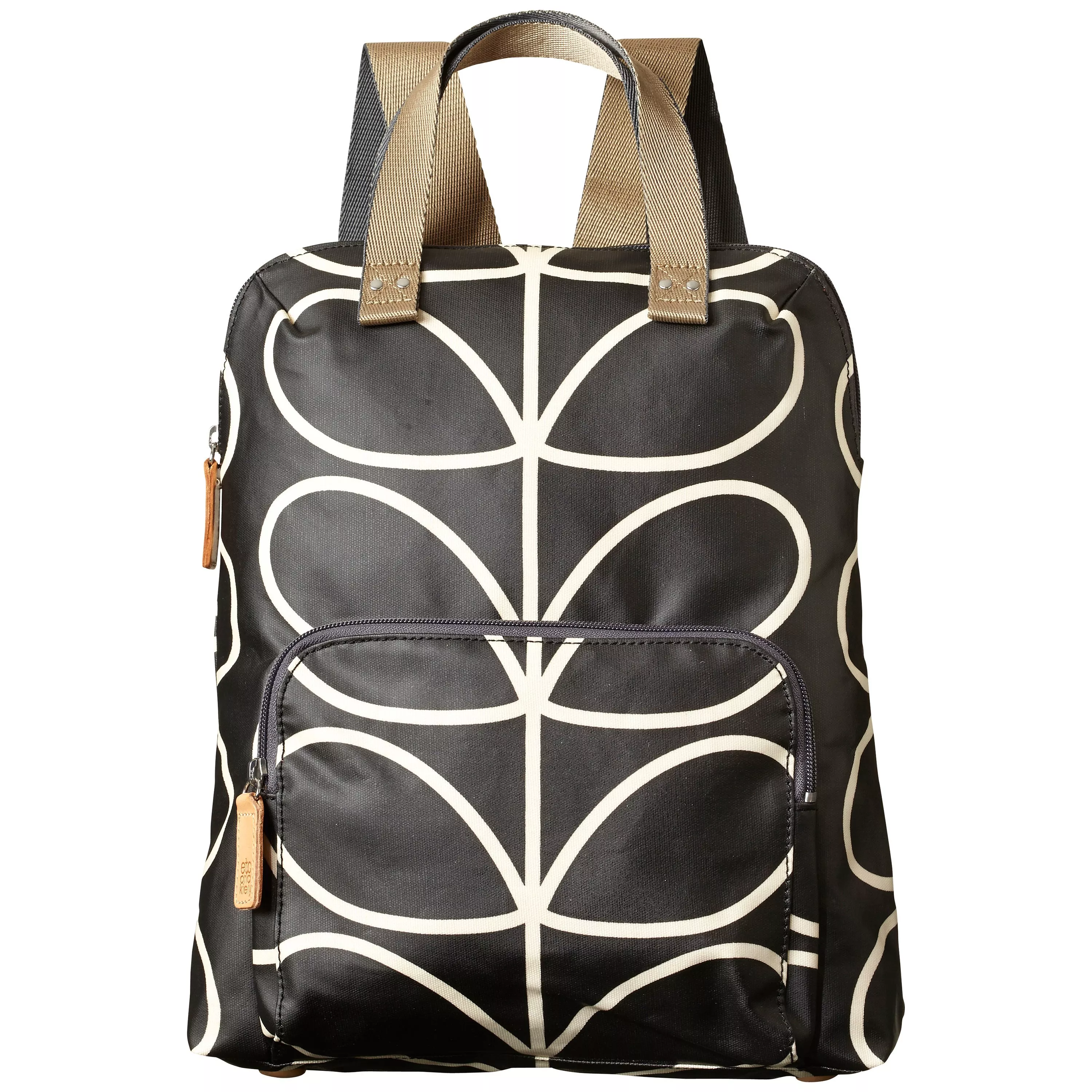 Orla Kiely's matte-laminated backpack in the classic 'Linear Stem' print with leather trims and double sided webbing is an eye-catching addition to your daily commute.