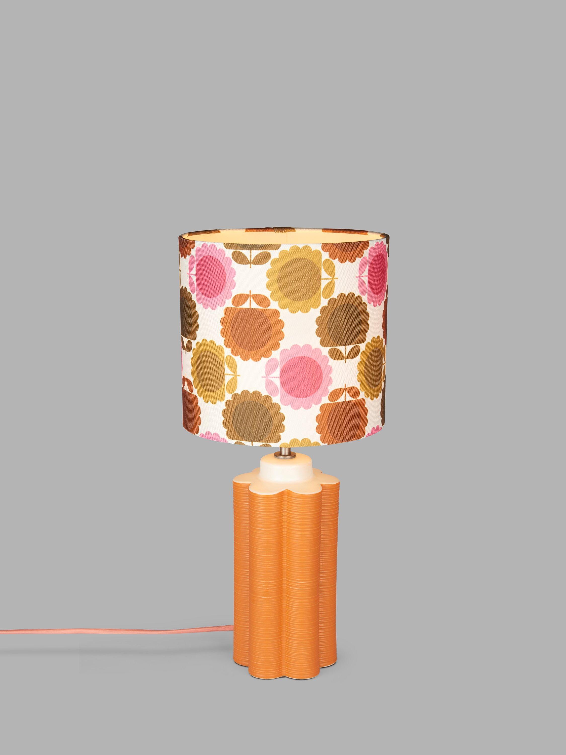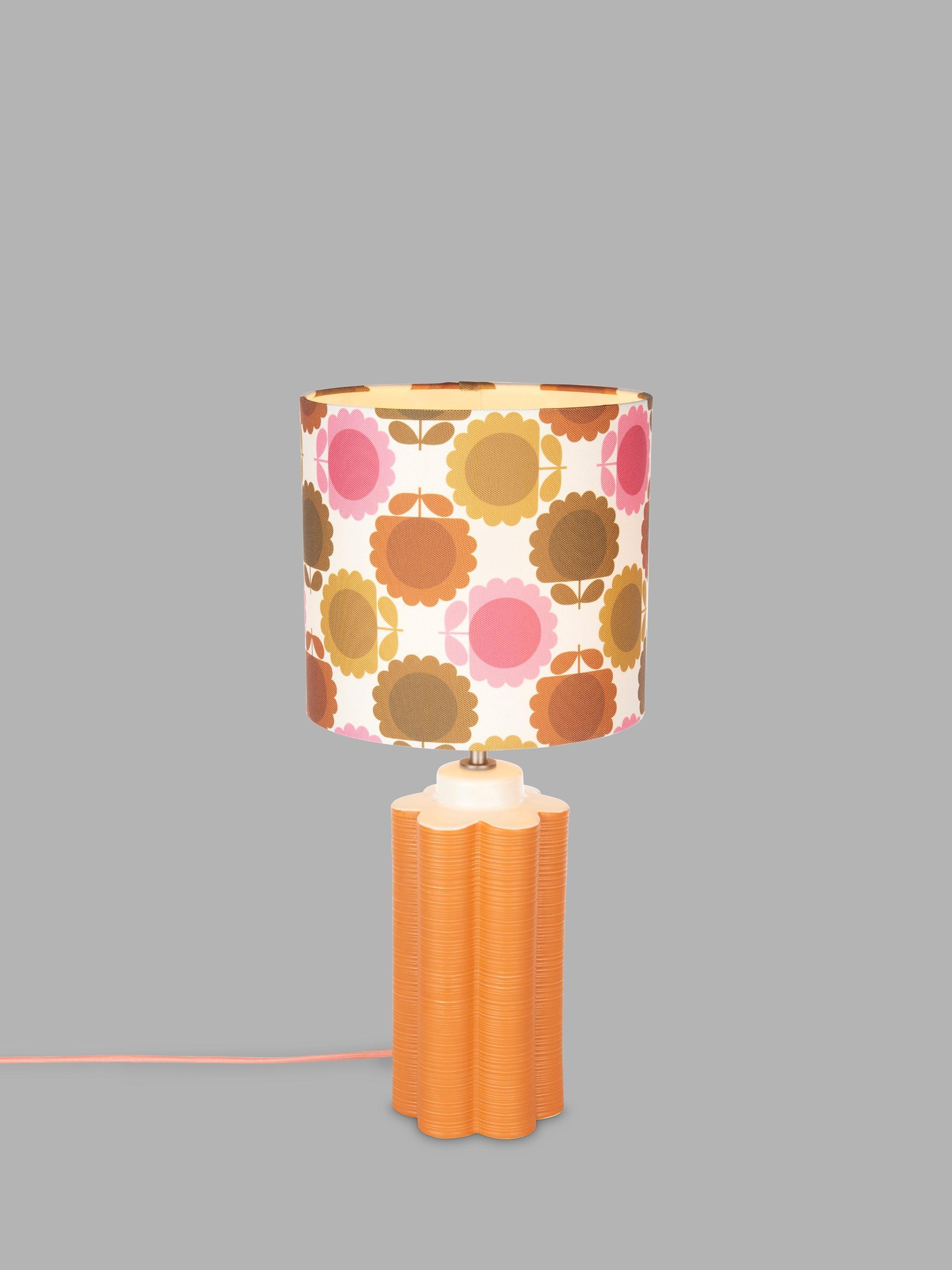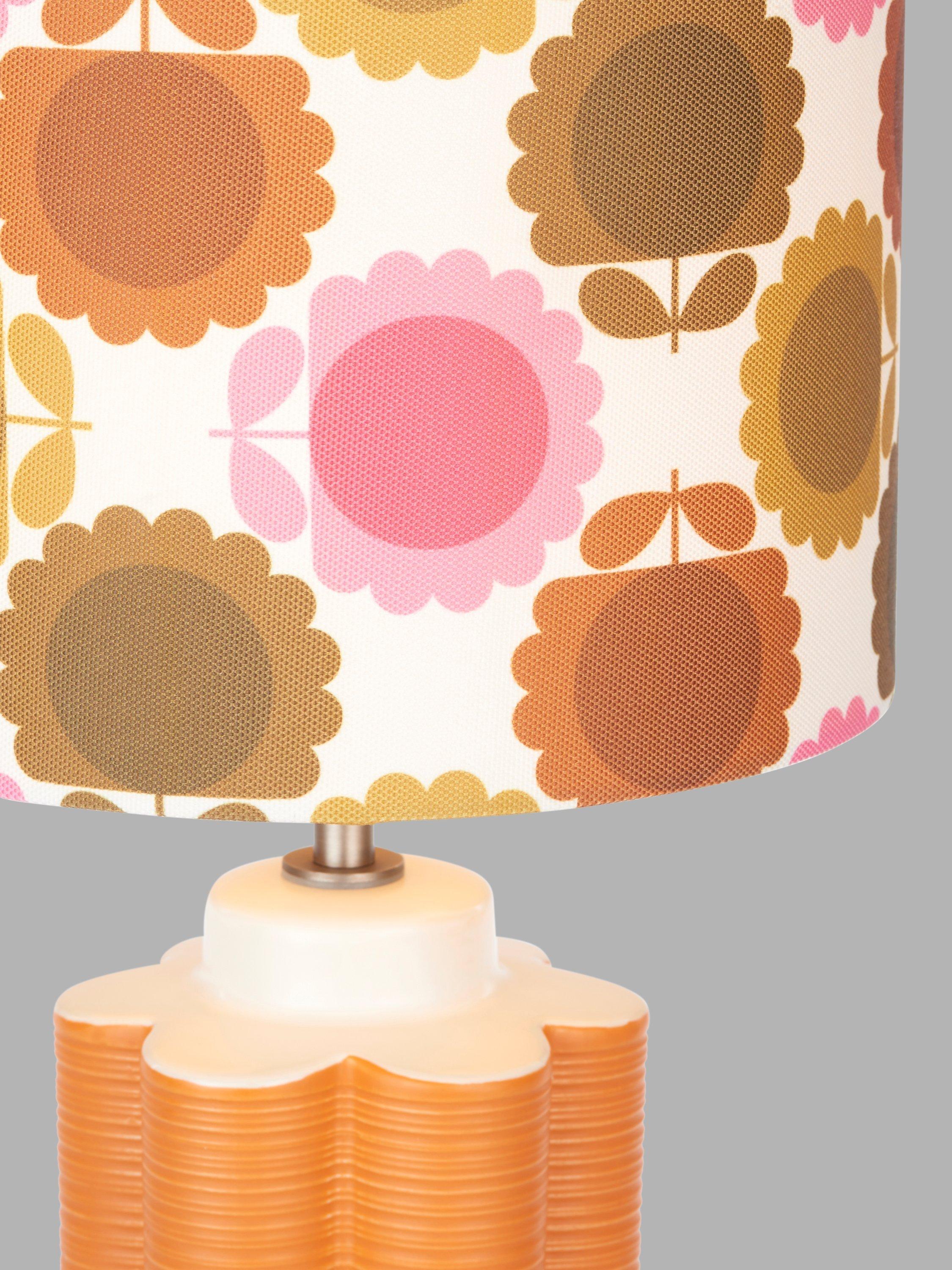This retro table lamp celebrates the playful Orla Kiely print and pattern across both the ceramic base and fabric lampshade and will accent your space with colour. The tall scalloped base is painted in a matt glaze and the shade is made from faux linen to enhance a warm glow of light.