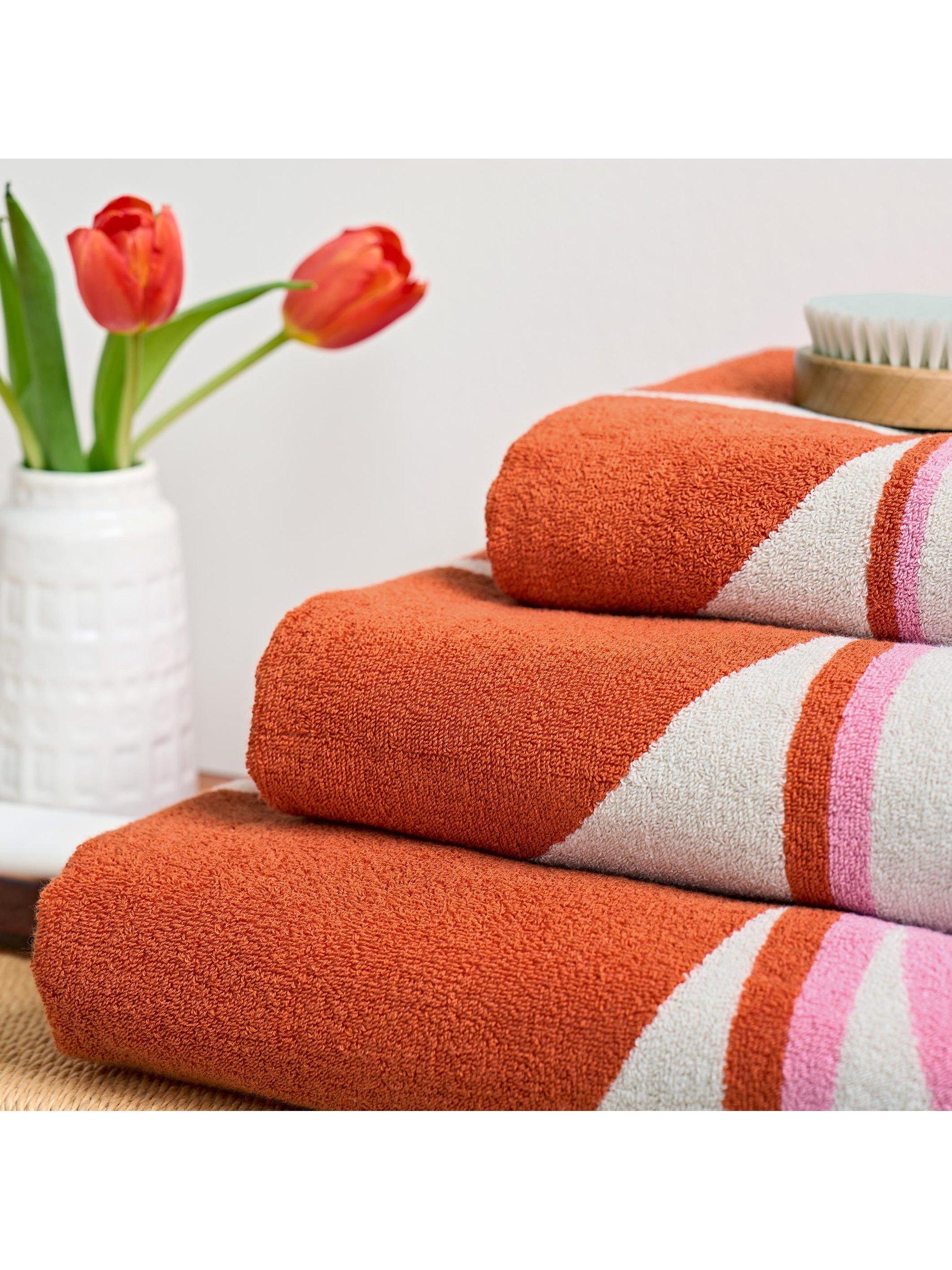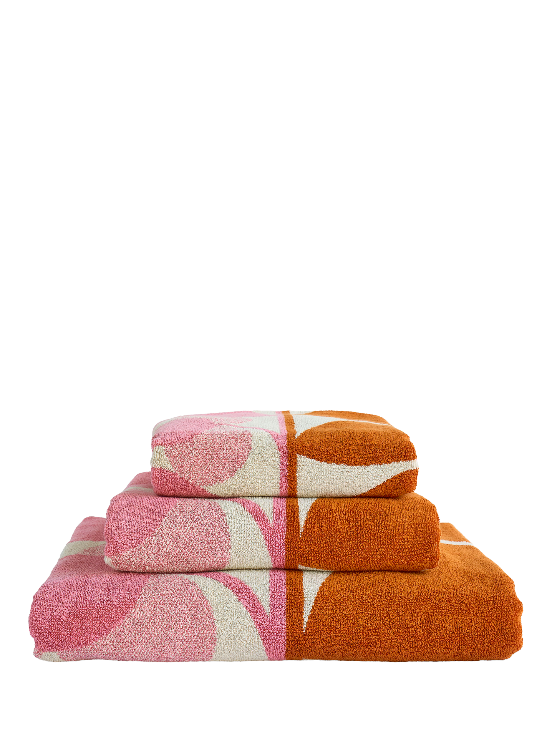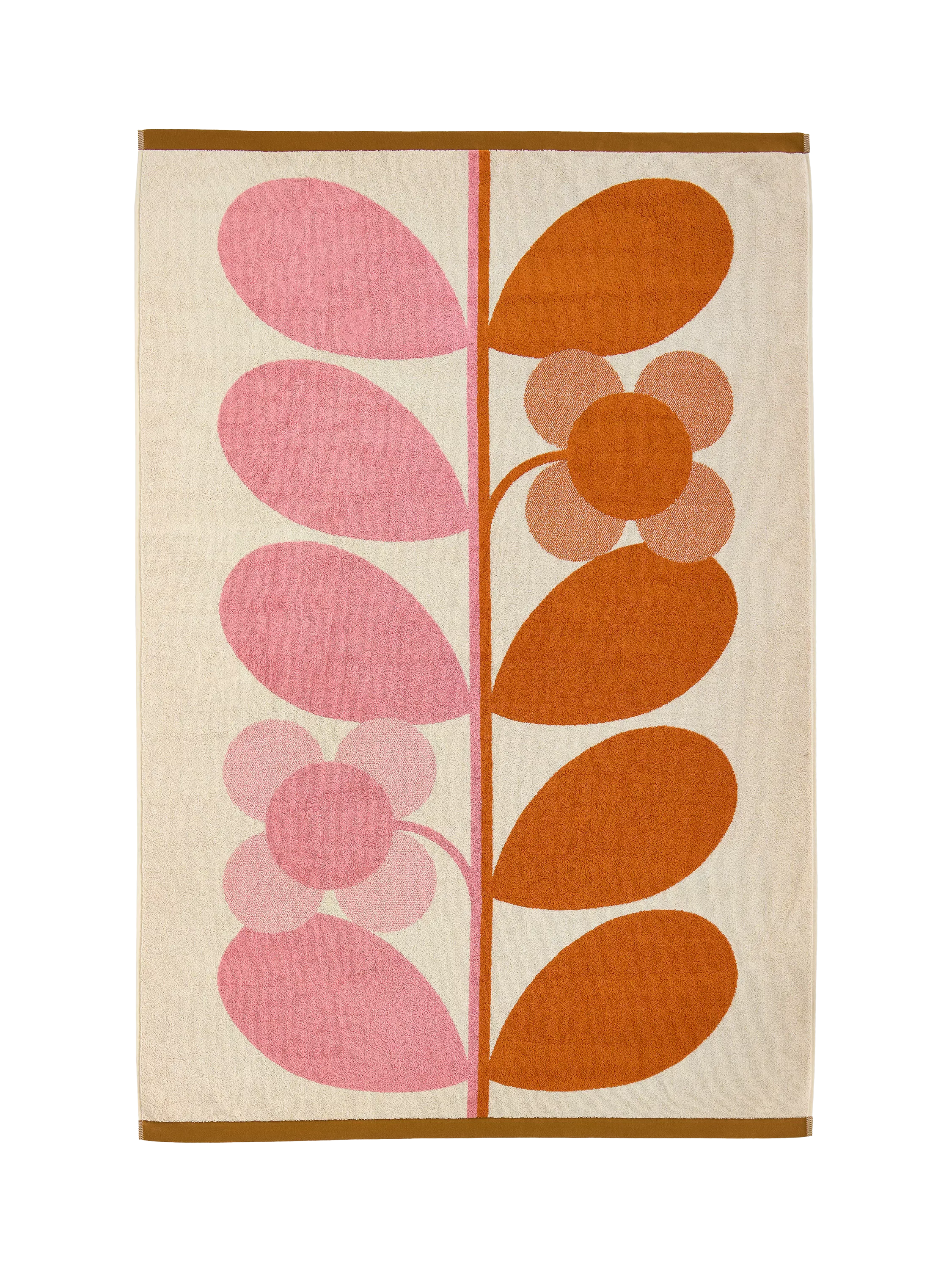 In a joyful palette of bright pink and orange, Orla Kiely's signature stem motif marries beautifully with another quintessential Orla motif, the four-petal flower, to add a playful touch to your bathroom.