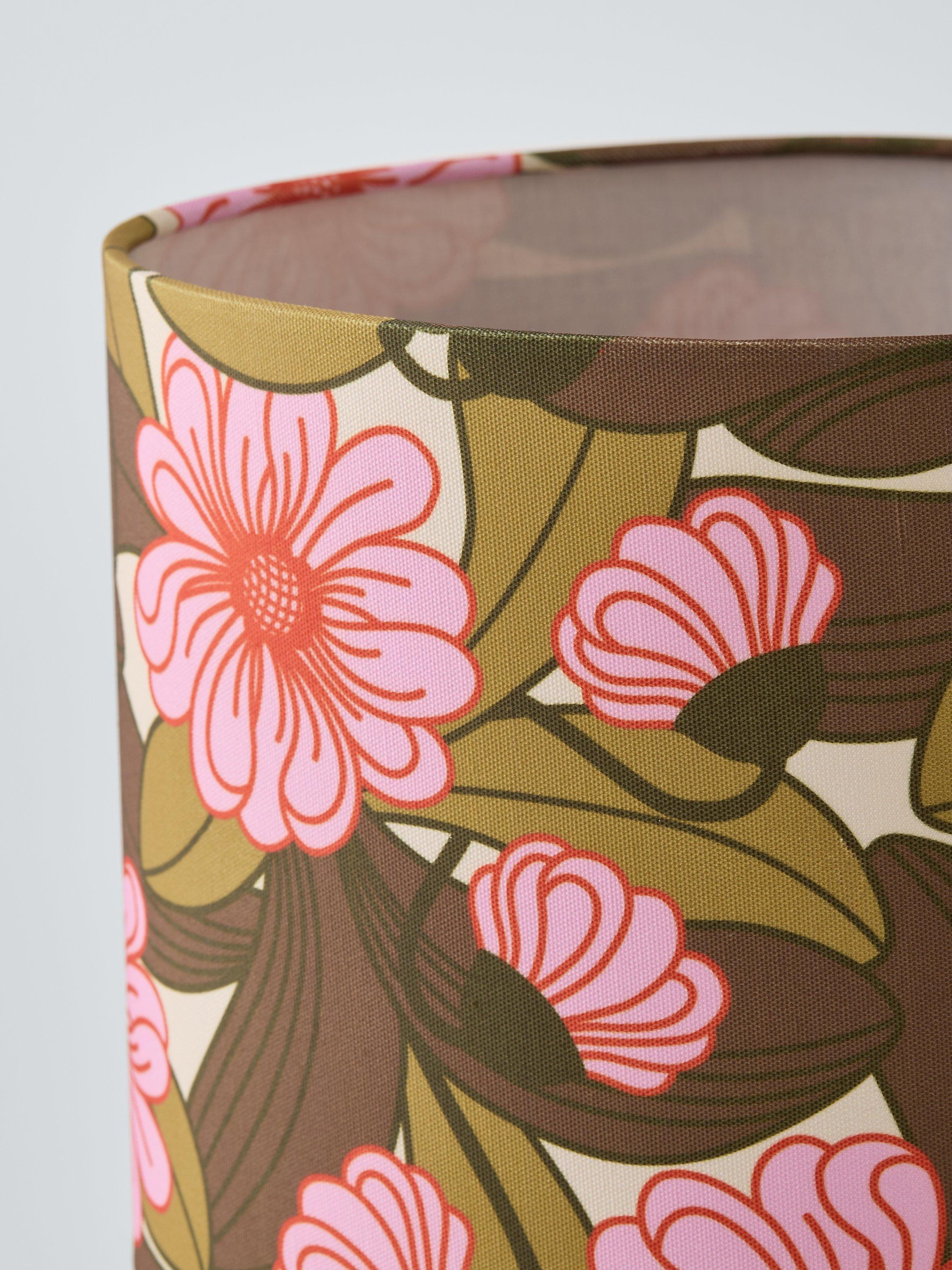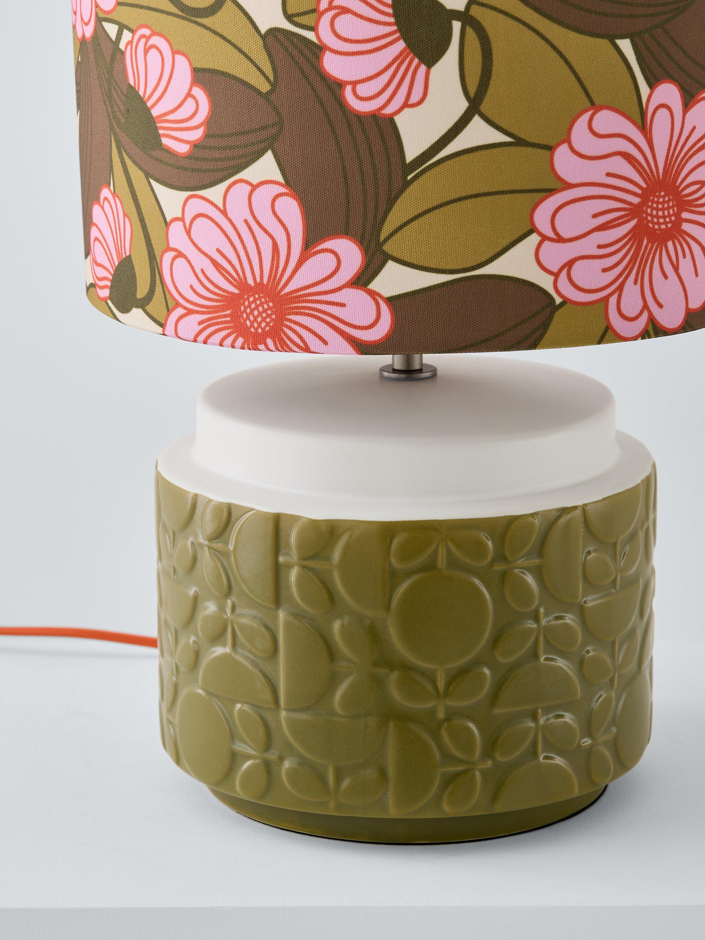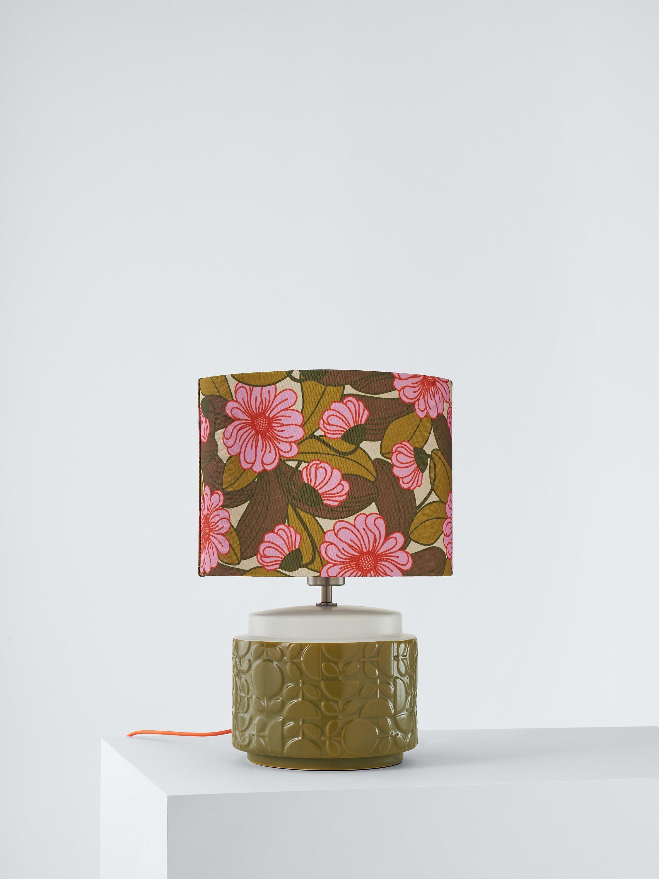 This retro table lamp celebrates the playful Orla Kiely print and pattern across both the ceramic base and fabric lampshade and will accent your space with colour. The beautiful large round base is accented with the iconic Tile pattern and the floral shade is made from faux linen to enhance a warm glow of light.