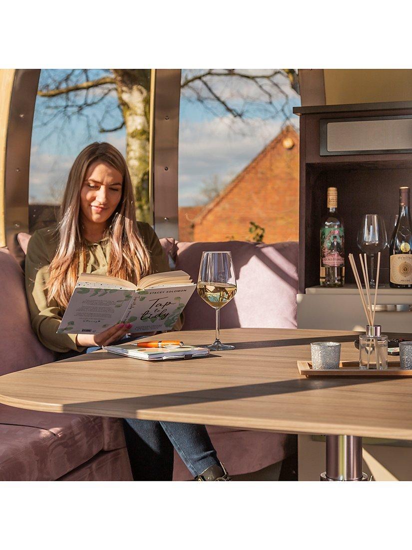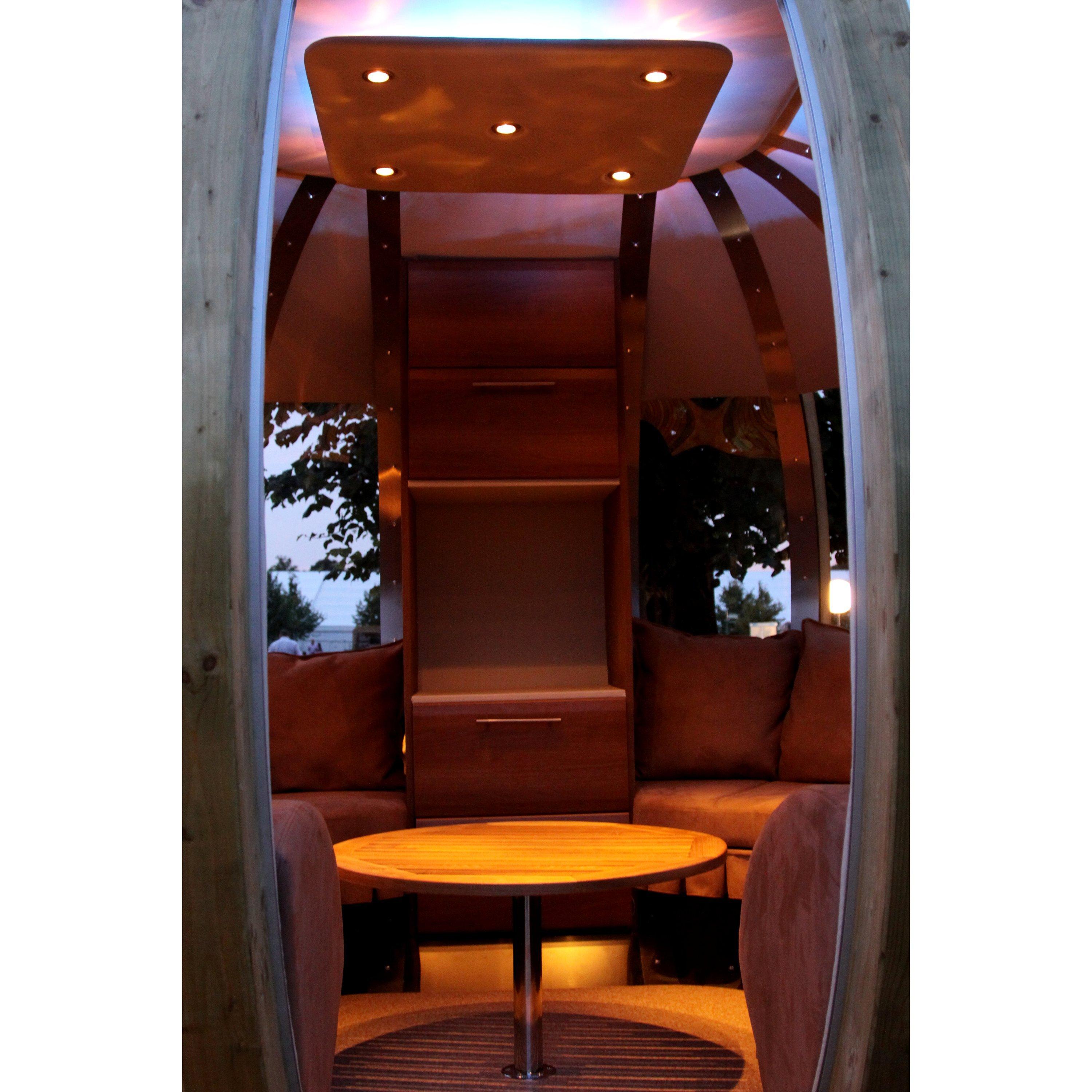 Windows all around the pod give a full panoramic view and are bronze-tinted to reflect glare. The roof is made from stainless steel to reflect heat and offer relaxing shade.