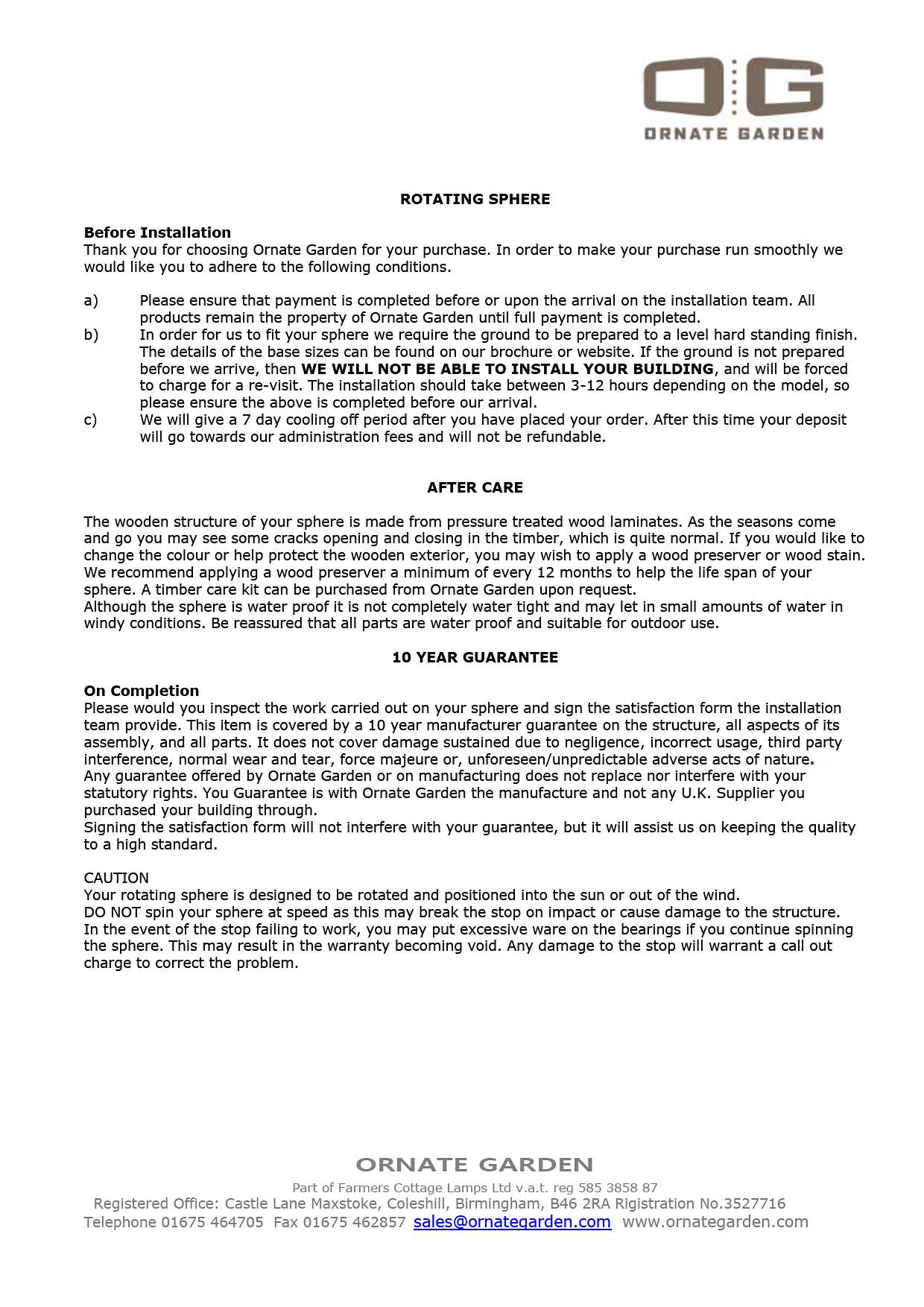 The wooden structure of your sphere is made from pressure-treated wood laminates. As the seasons come and go, you may see some cracks opening and closing in the timber, which is a natural and normal occurrence. To change the exterior colour or protect the wood, you may wish to apply a wood stain or wood preserver. To extend the lifespan of your sphere, aim to apply a wood preserver at least once a year.