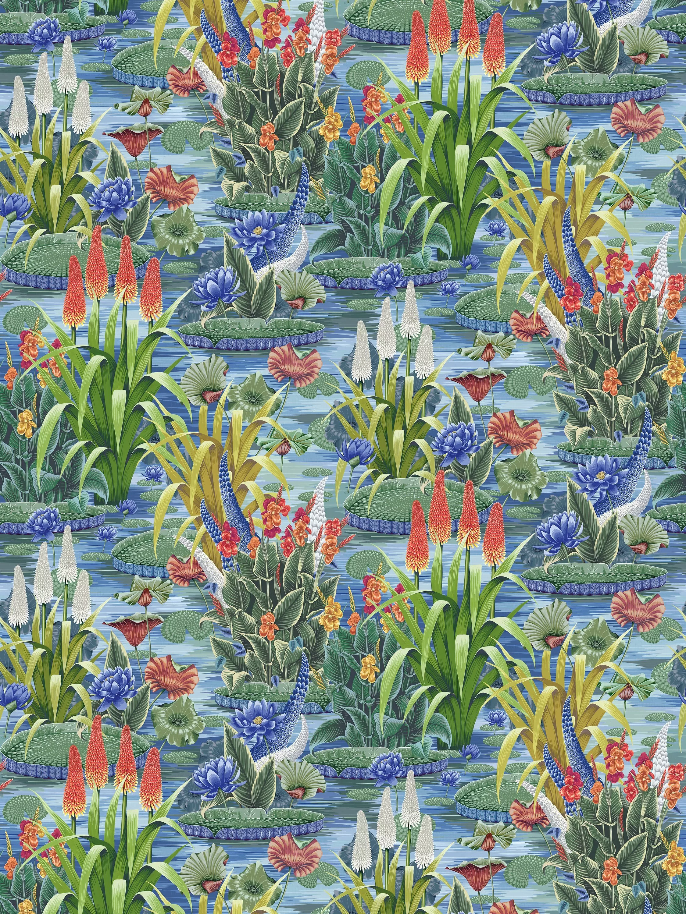 A pond, flourishing with an array of water lilies and giant lily pads, designed as an all-over pattern.