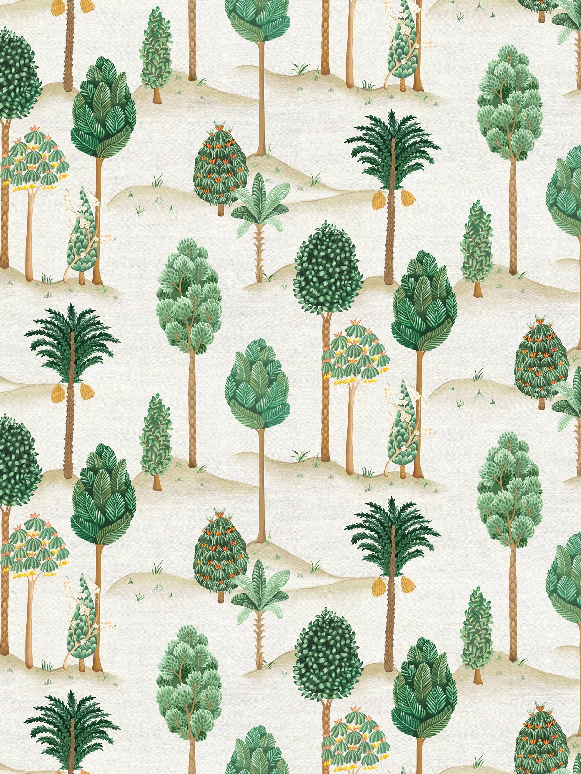 A charming depiction of stylised Indian trees. The colourways encompass various shades of green with golden accents, capturing a natural ambience.